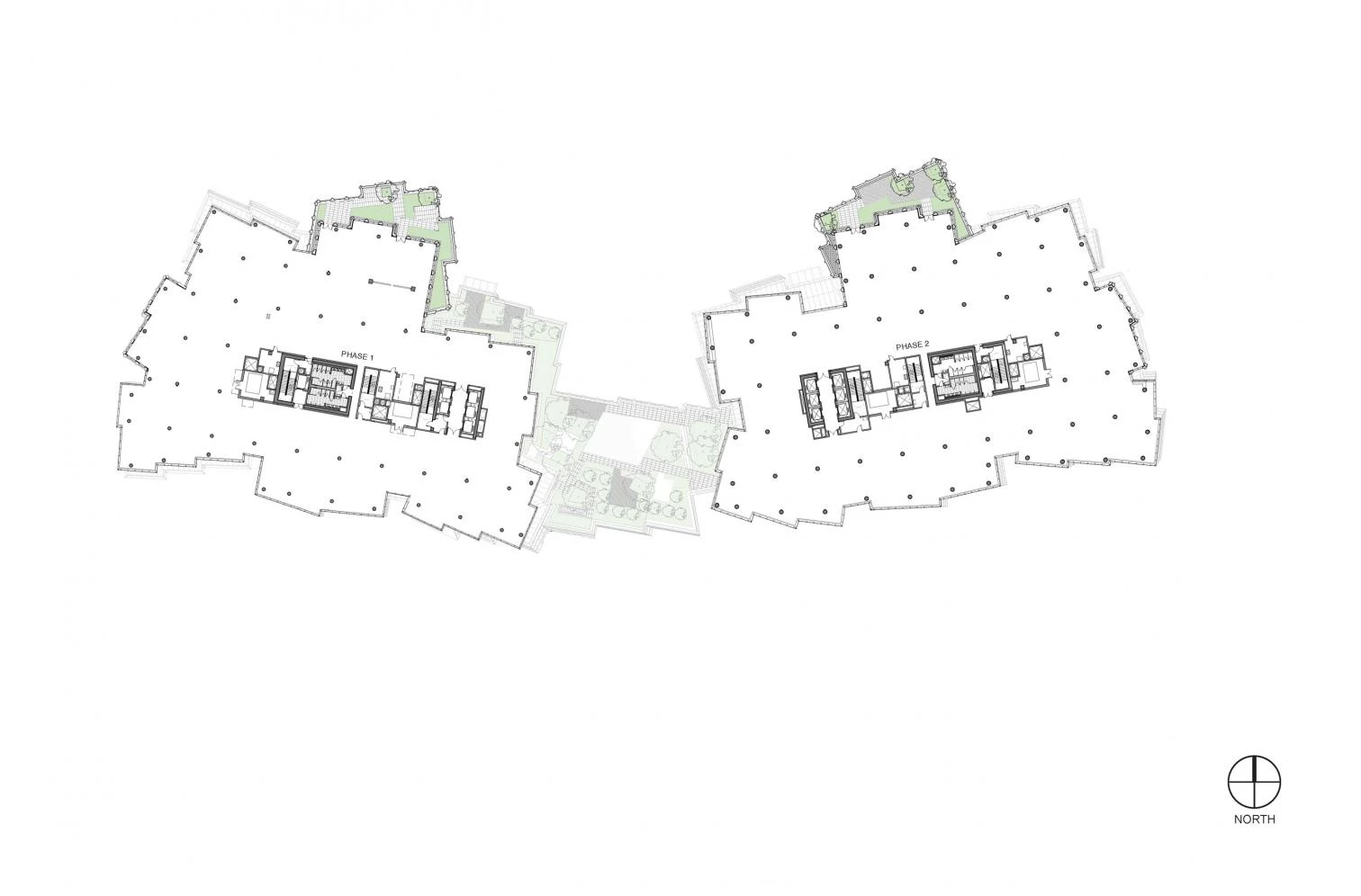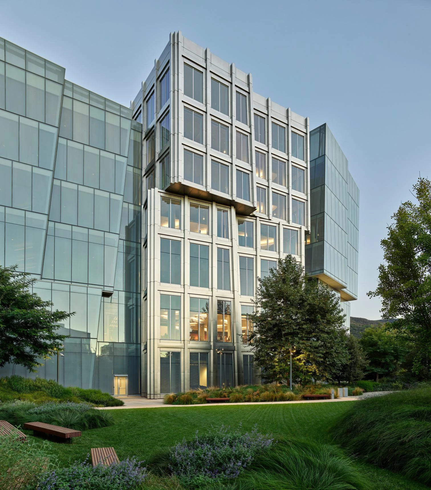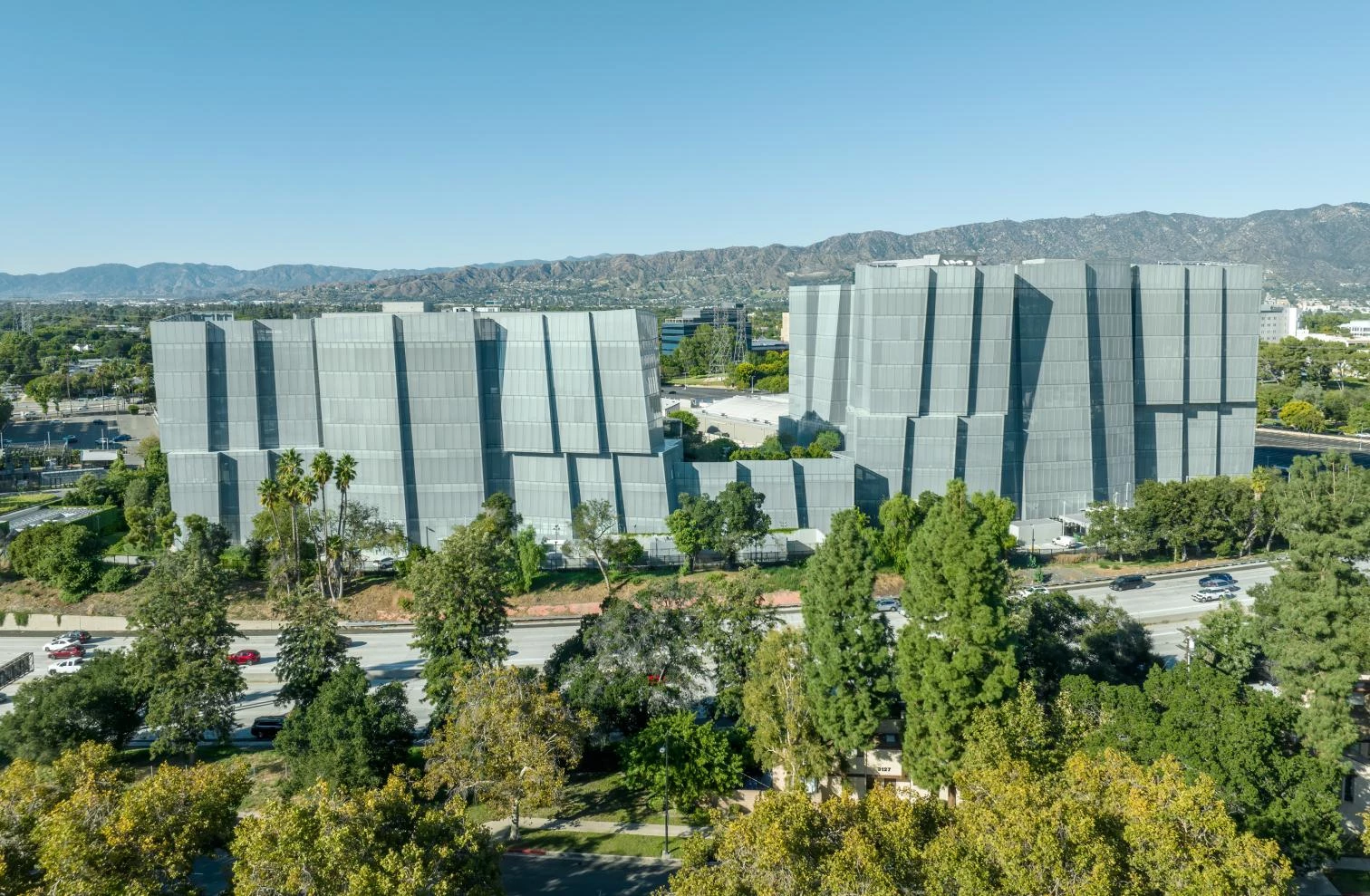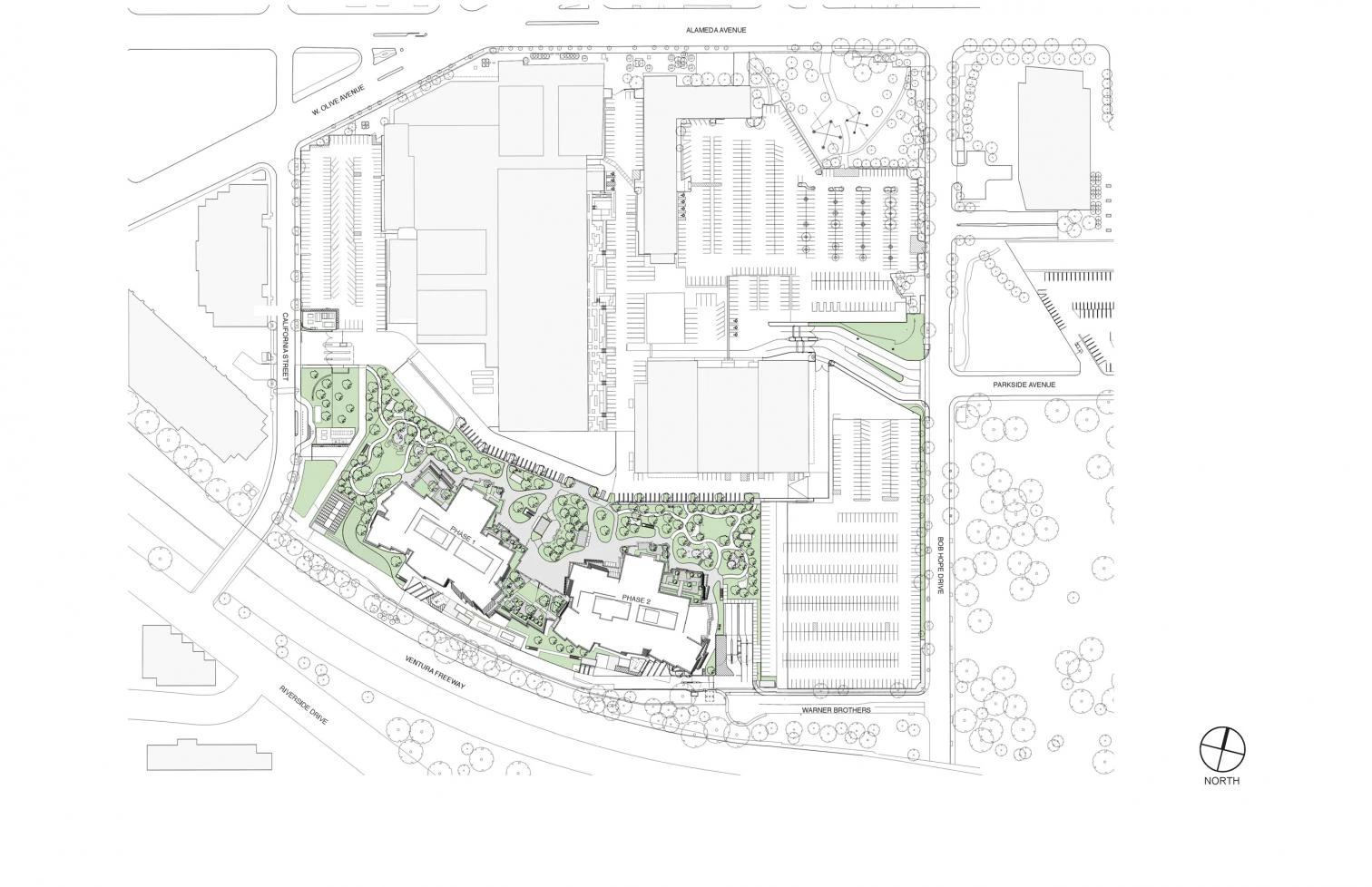 Como contrapunto, el conjunto de oficinas para Warner Bros. y otros posibles inquilinos presenta una descomposición de elementos de menor escala, que descienden hasta la parcela existente de estudios. La articulación aquí de las fachadas de acero inoxidable con grandes aberturas transmite una sensación industrial. Los retranqueos crean una silueta escalonada, generando terrazas con vegetación. Amplios espacios abiertos con fachadas vidriadas de suelo a techo definen los espacios de trabajo colaborativo, mientras que para las oficinas cerradas de los ejecutivos se utilizaron elevaciones con ventanas más tradicionales.