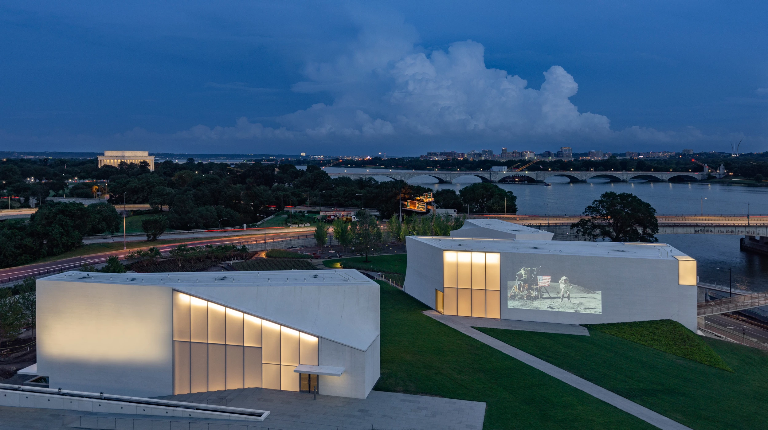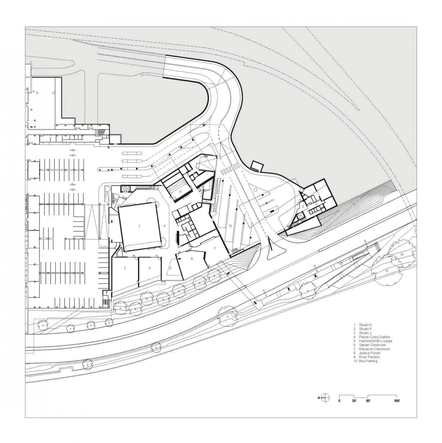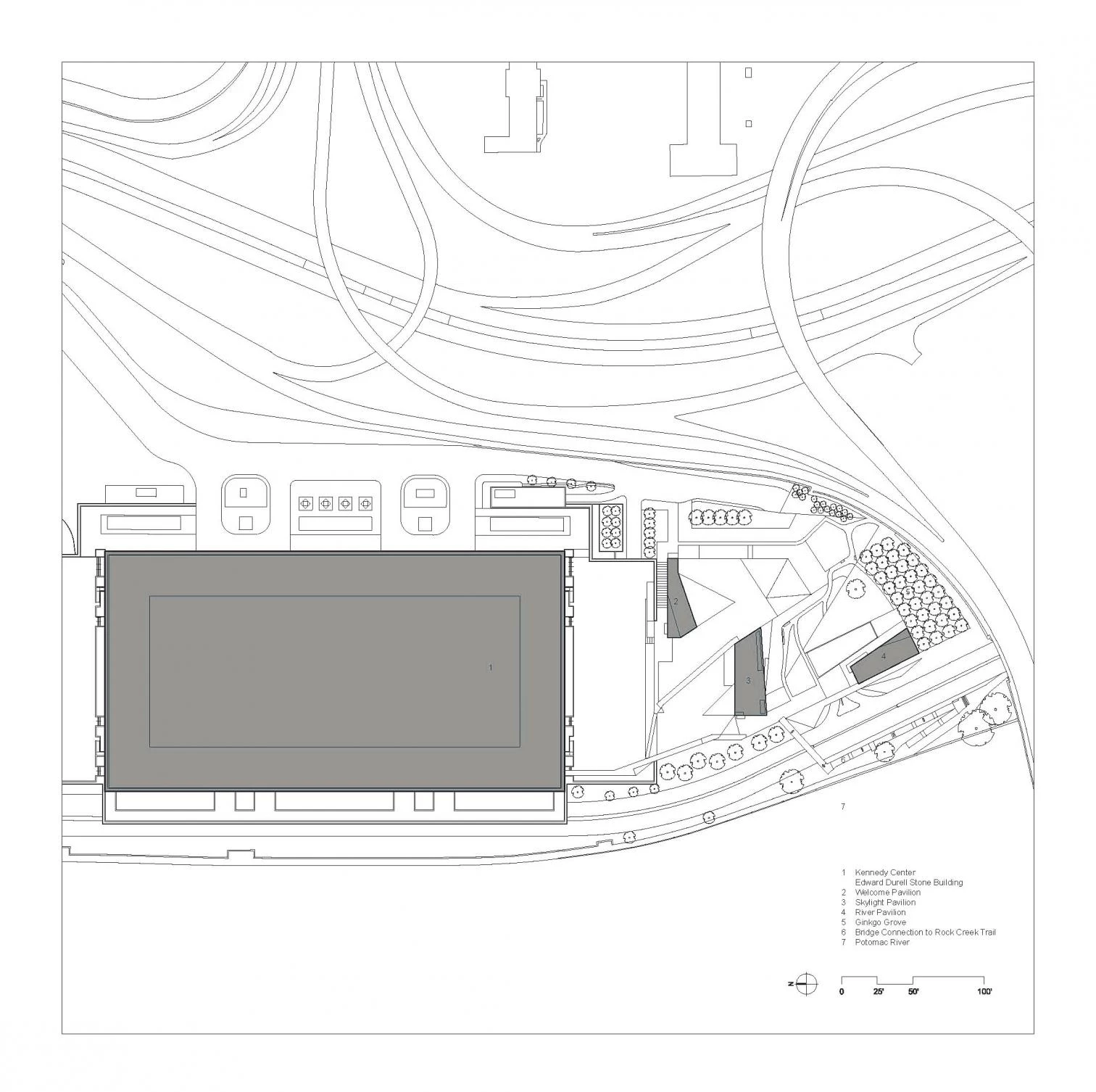 Contrastando con el rotundo edificio de Edward Durell Stone, tres pabellones emergen dispersos sobre un basamento ajardinado que los conecta y configura una topografía que enmarca las vistas del río y los otros monumentos presidenciales del Mall.