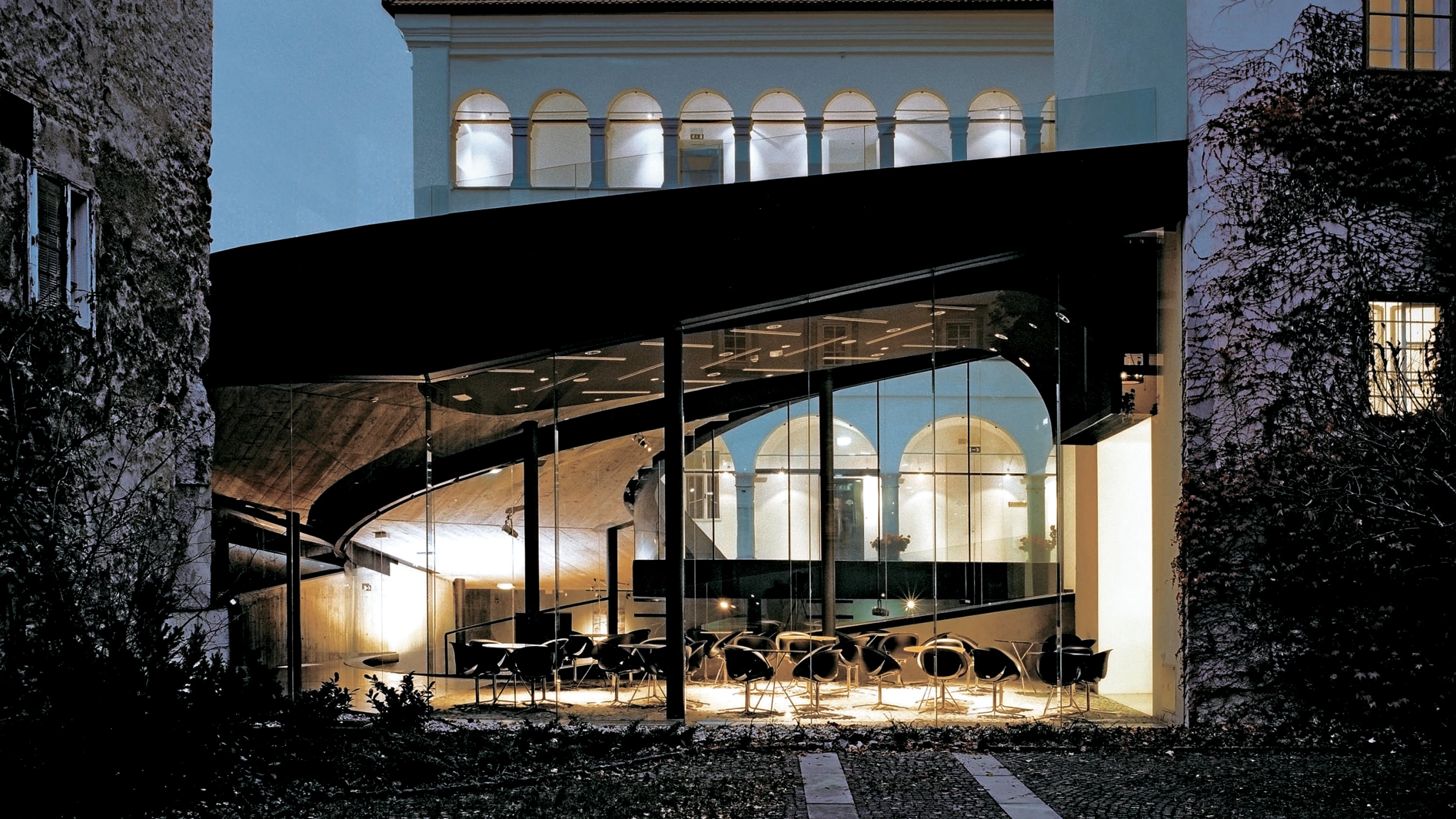La renovación del palacio se lleva a cabo utilizando los mínimos elementos necesarios, por lo que se usan ventanas y puertas sin marco y materiales neutros. También en el nuevo volumen —cimentado con pilotes siguiendo las indicaciones de los arqueólogos— se construye con una reducida paleta de materiales, dejando la rampa inferior de hormigón visto sin tratar, mientras que los vidrios curvos del cerramiento otorgan un aspecto sofisticado y animan el espacio con sus múltiples reflejos... [+]