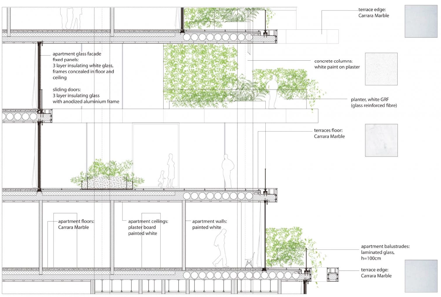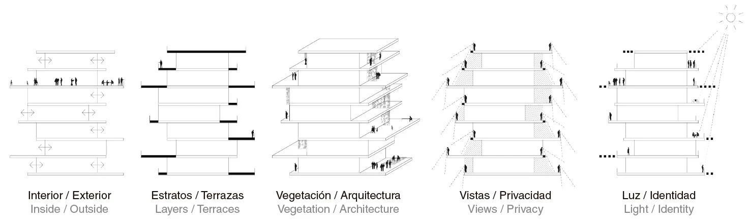 Cinco principios definen el proyecto: la superposición de capas y terrazas, la dualidad interior y exterior, la vegetación, el equilibrio entre vistas y privacidad, la luz y la identidad. El resultado es un edificio formado por la superposición vertical de estratos: una serie de losas de diferentes tamaños permite la interacción entre apertura y privacidad, lo que fomenta una relación flexible entre el interior y el exterior. La calidad de los detalles y la cuidadosa elección de los materiales dan como resultado un edificio que combina eficiencia y lujo. Por su parte, los sistemas climáticos y el uso de vegetación específica mejoran la sostenibilidad y las características ambientales.