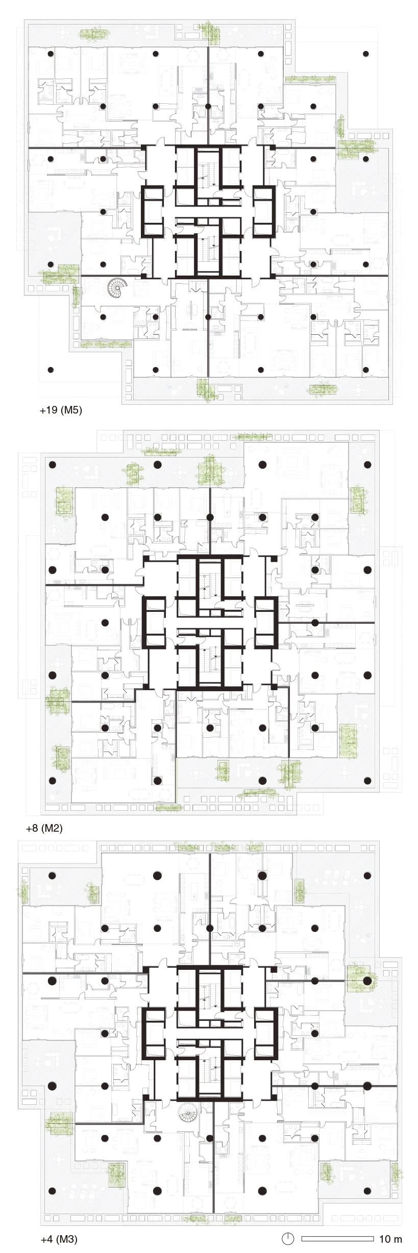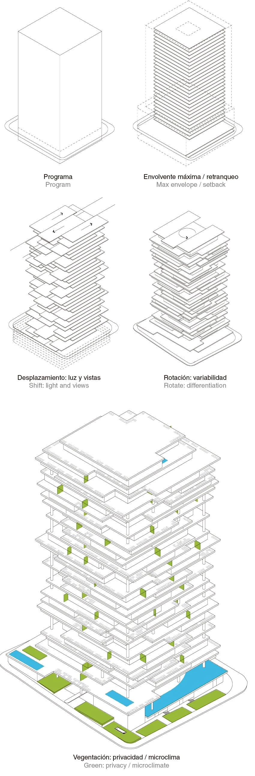 Esta torre estratificada, que llega hasta los 119 metros de altura, está formada por estancias que avanzan o retroceden generando terrazas y voladizos, espacios de luz o sombra, lugares íntimos o expuestos; de manera que cada apartamento es único. Para garantizar esta diversidad, sin prescindir de una solución constructiva razonable, el edificio se compone de cinco tipos de pisos modulares que se repiten en diferentes combinaciones. La estructura portante se concentra en un núcleo cruciforme y en una retícula regular de columnas que salvan luces de 14,7 metros. Esto hace que las divisiones de los apartamentos no sean estructurales y su distribución esté abierta a introducir cambios en el futuro.