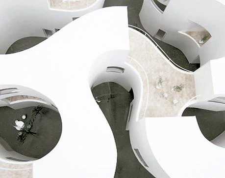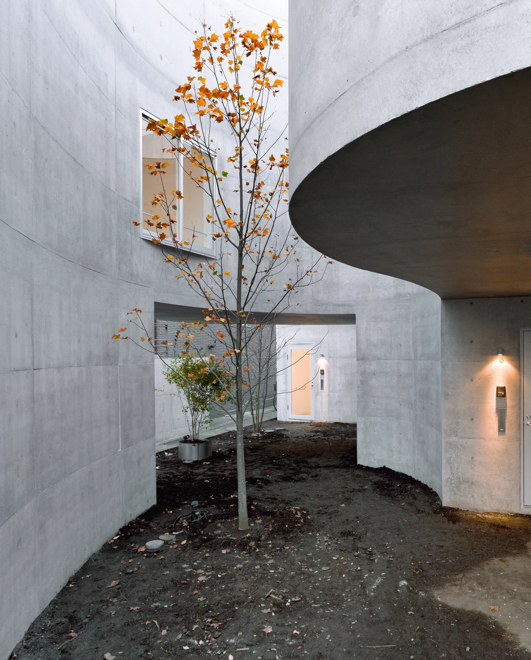 La curvatura de los muros dota a cada vivienda de un caracter único, estando todas ellas compuestas de un único espacio que se relaciona con el exterior de diversas formas: una vivienda puede tener una gran habitación rodeada por un jardín en planta baja y un pequeño dormitorio en la primera, mientras otra puede acoger una habitación en tridente y una terraza en la segunda planta. Cada habitación se abre hacia un espacio exterior de distinta índole, pero manteniendo la privacidad; interior y exterior se entremezclan con naturalidad.