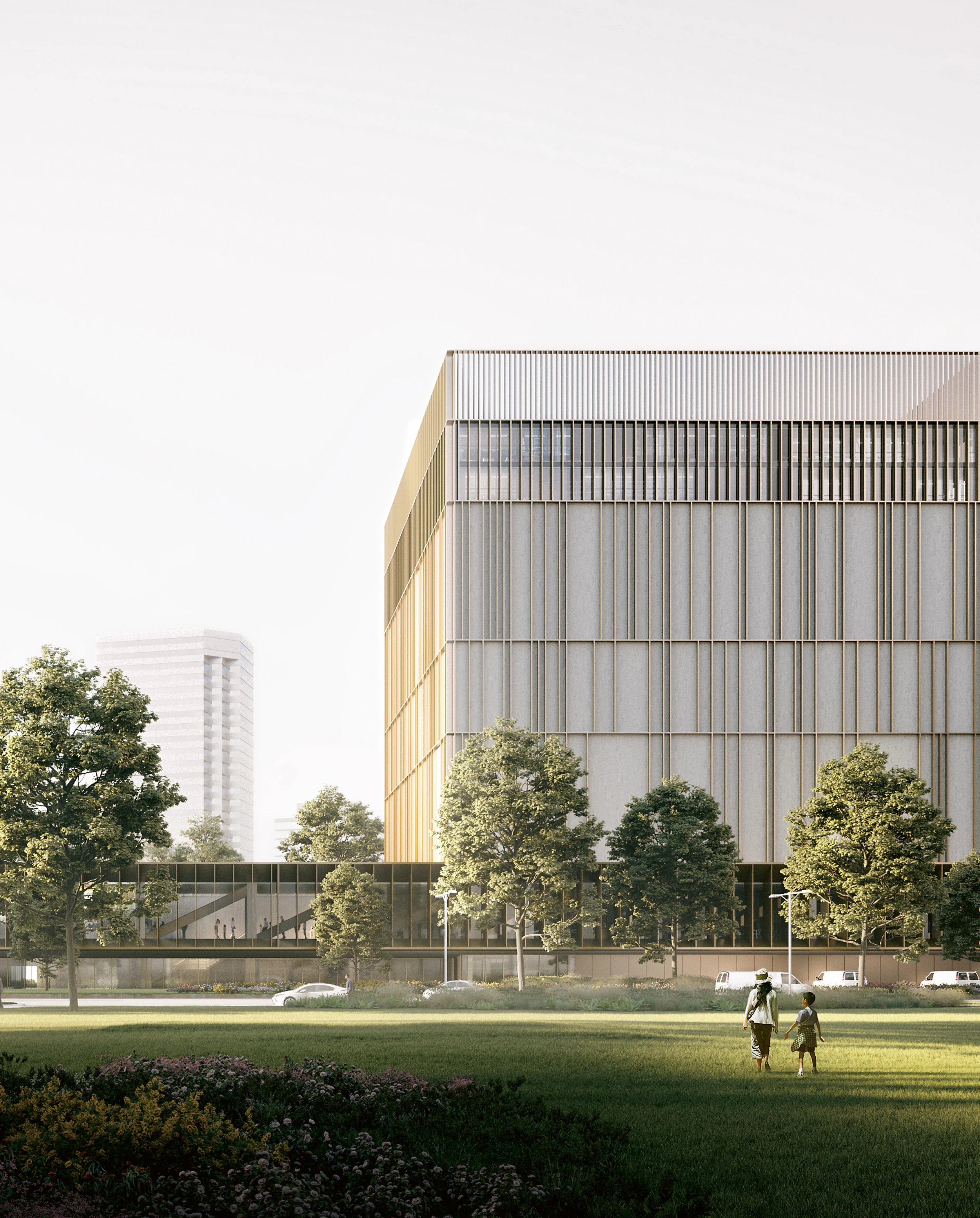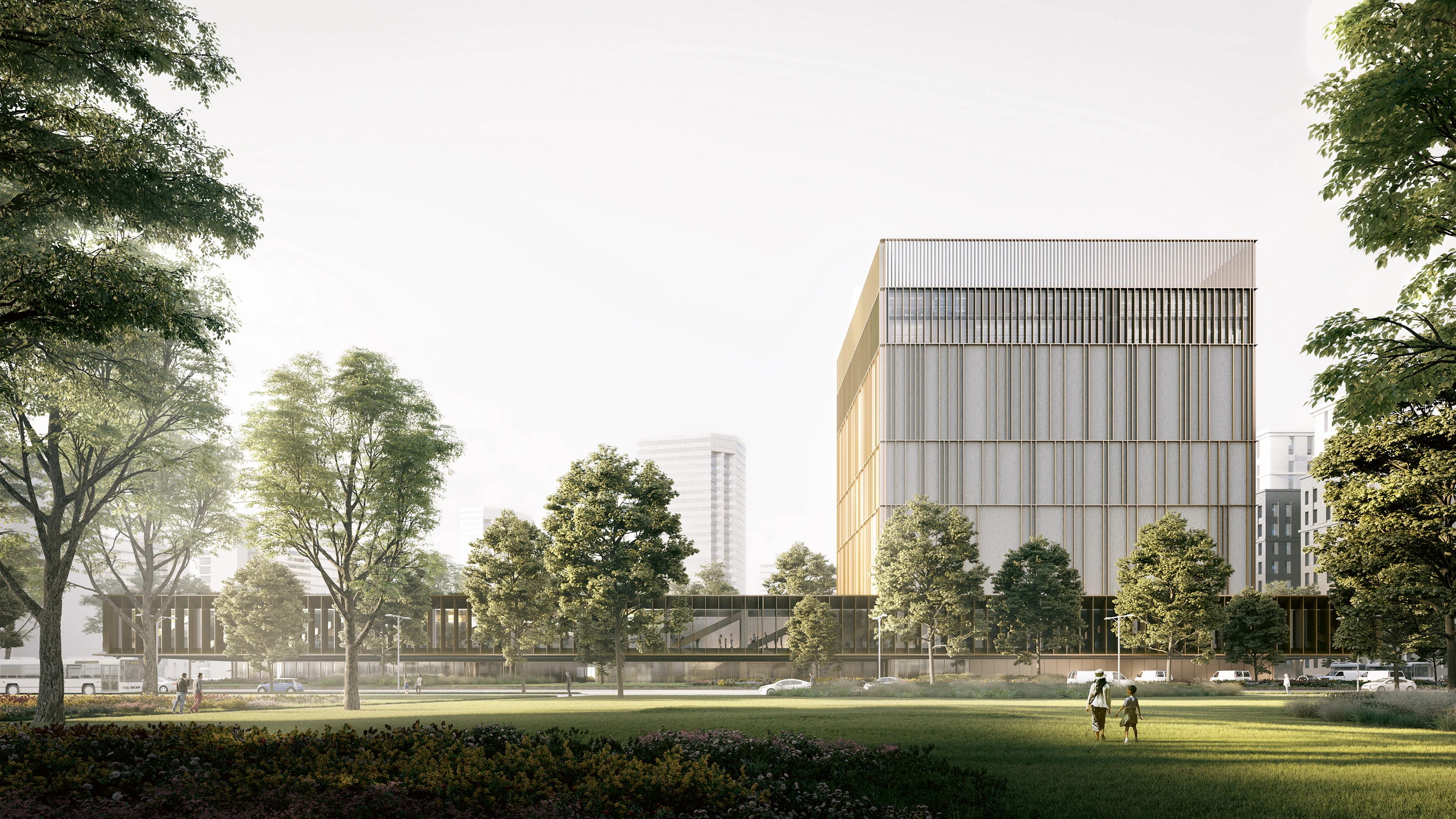 Una gran ménsula se extiende horizontalmente, estableciendo una estrecha relación con el entorno; sobre ella, el cubo perfecto que alberga los archivos está protegido, como un objeto precioso, por una fachada de piedra natural y finas lamas de aluminio... [+]
