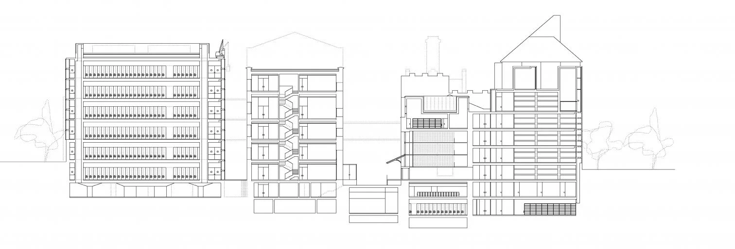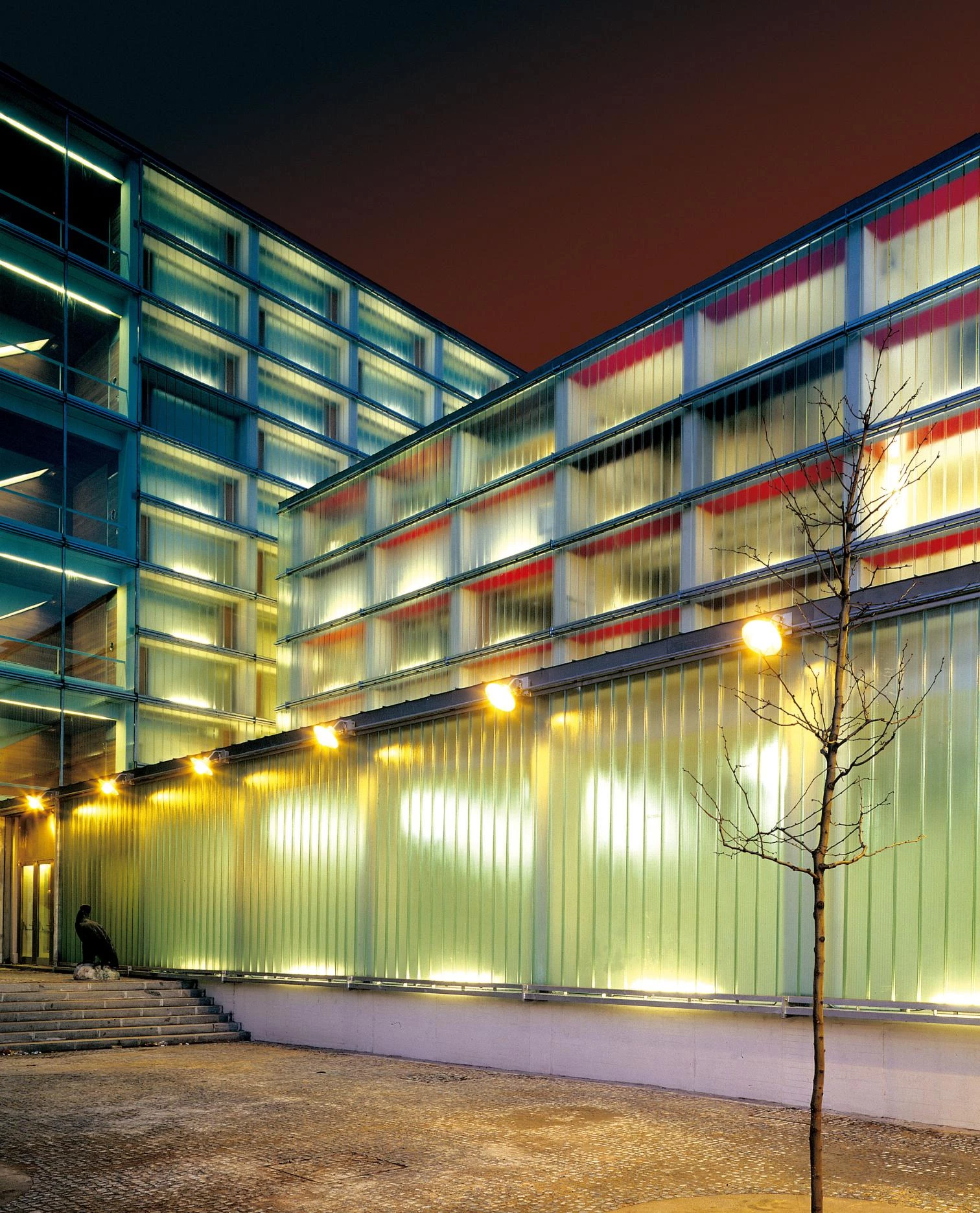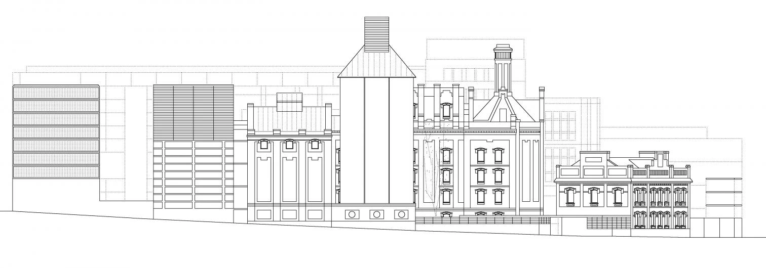 A los espacios libres de la manzana que comprende la factoría —delimitada por las calles General Lacy, Bustamante, Vara del Rey y Ramírez de Prado— se les ha otorgado tanto valor como a lo construido a la hora de definir sus nuevas trazas y multiplicar las posibilidades de recorrido. Como dos manos que se entrelazan, los edificios existentes y los que se han incorporado establecen estrechos vínculos entre sí y con los vacíos que los envuelven. Y como manos entrelazadas se definen también en este proyecto el Archivo y la Biblioteca: una mano protege el patrimonio histórico, mientras la otra cobija el acervo del presente y el futuro. Hormigón blanco, lamas de fundición de aluminio o vidrio de perfil en U, todos ellos materiales de factura industrial, definen las piezas que se incorporan a lo que ya es una factoría cultural.