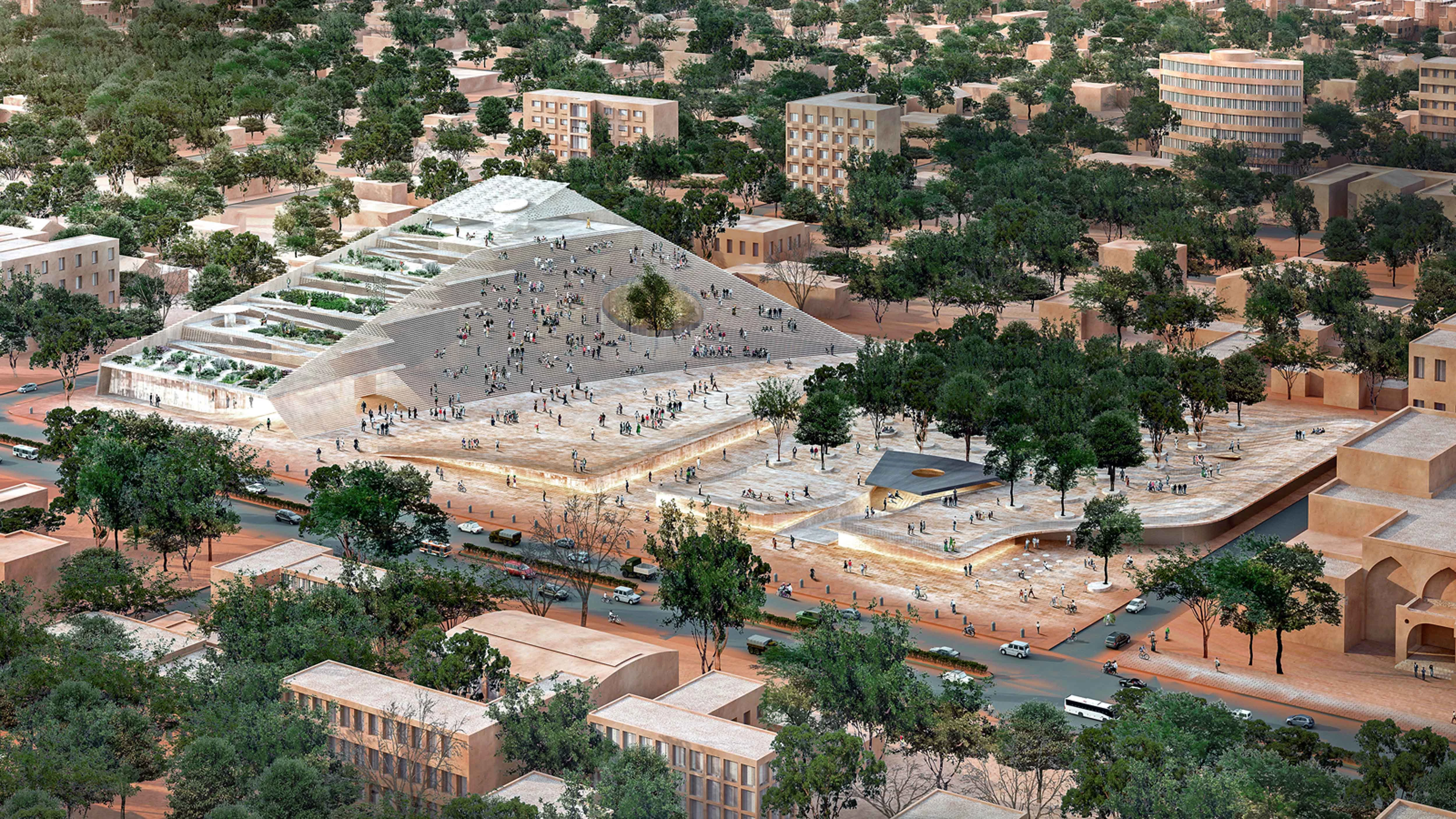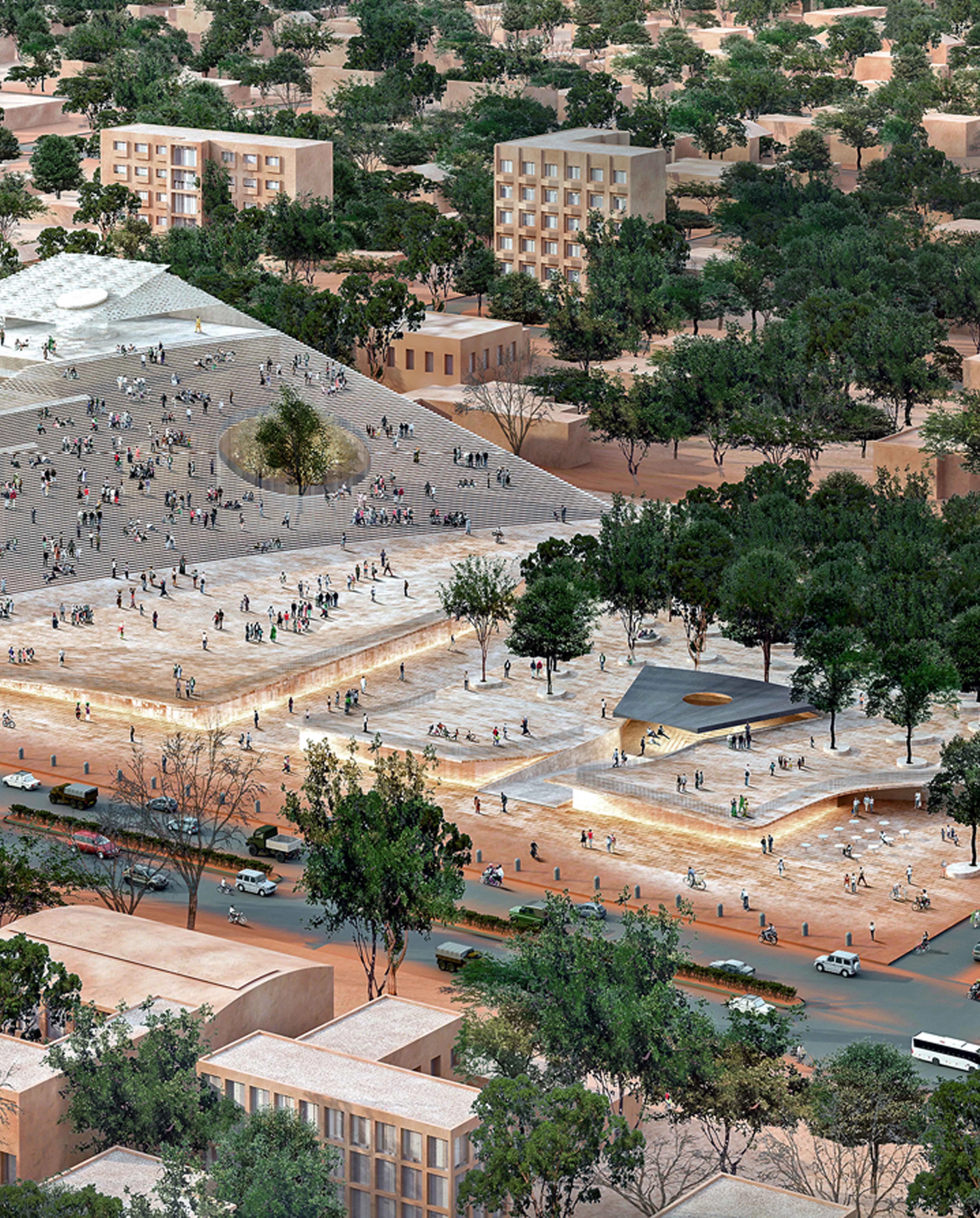 Además de abordar los valores democráticos de transparencia, apertura e igualdad, el nuevo Parlamento de Burkina Faso aspira a convertirse en un catalizador para el crecimiento y el desarrollo de la ciudad. En el exterior, una pirámide escalonada de hormigón y piedra permite que los ciudadanos habiten el edificio a través de su cubierta transitable desde donde pueden disfrutar de una perspectiva diferente del entorno urbano. Las terrazas, por su parte, incorporan huertos donde experimentar nuevas técnicas agrícolas. En el interior, el volumen alberga la sala de juntas con capacidad para los 127 representantes y un jardín inspirado en la tradición local que evoca las reuniones de los ancianos para discutir asuntos importantes bajo la sombra de un gran árbol. El plan director incluye, además, la transformación del antiguo edificio parlamentario en un monumento para recordar a las personas que perdieron la vida durante el conflicto. Acompañadas por una nueva plaza arbolada, las ruinas se integran en una depresión del terreno que recoge el agua de lluvia y ofrece un espacio en sombra.