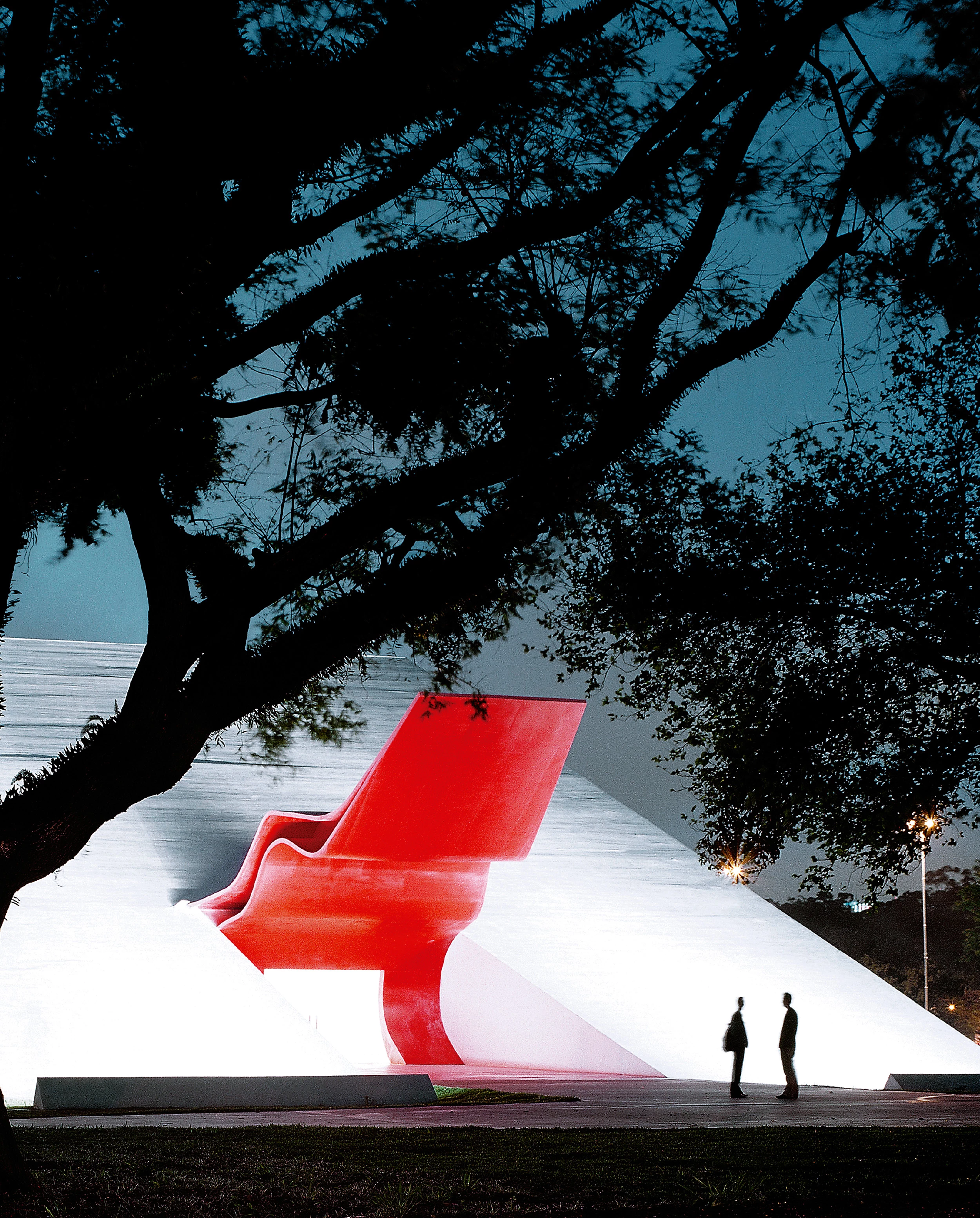La construcción del auditorio del parque de Ibirapuera tiene una larga historia: fue el único edificio no realizado entre los principales del proyecto original, concluido en 1954, para la conmemoración del cuarto centenario de la ciudad de São Paulo. Después de varias tentativas frustradas y más de once proyectos, entre estudios y proyectos de ejecución, finalmente fue realizado. Para ello, Niemeyer, autor de los otros edificios, rediseñó el auditorio teniendo en cuenta la realidad actual. Es verdad que entre el diseño ejecutado y la propuesta original hay muchas diferencias. Desde el punto de vista técnico y formal, el antiguo diseño era más interesante, dada la ligereza y la proeza constructiva que implicaba. Era el volumen más destacado del conjunto del parque y tan potente que inspiró otro famoso teatro, el Castro Alves en Salvador de Bahía, creado por Bina Fonyat. La propuesta incluía también obras de Le Corbusier y Henry Moore.