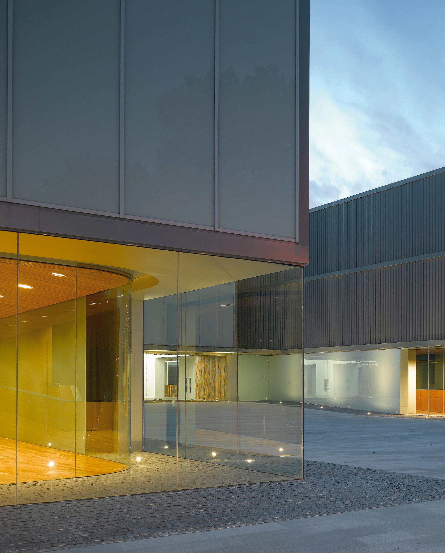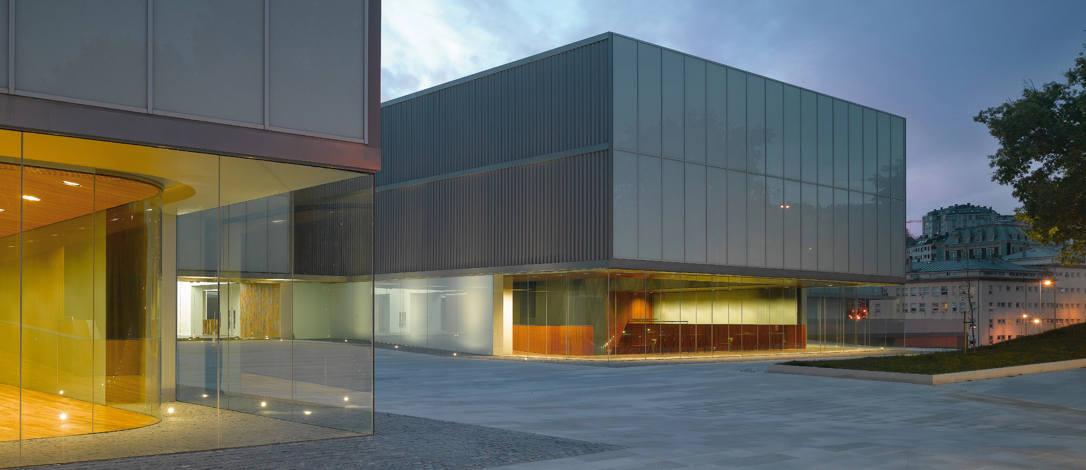 La cubierta de aluminio se pliega para envolver los distintos espacios, cada uno con la altura necesaria, y dibuja una cornisa quebrada que aleja el edificio de una imagen monolítica. Como una galería, unas veces traslúcida y otras transparente, la fachada de vidrio serigrafiado con distintas opacidades confiere al nuevo auditorio un carácter luminoso, y sirve para construir su cara más urbana, configurando un edificio que debe representar una institución abierta para los ciudadanos. La imagen que ofrece el conjunto es plana y continua hacia la calle, con diferentes alturas, y fragmentada en el jardín, hacia donde muestra una silueta irregular que apenas sobresale de las copas de los árboles.