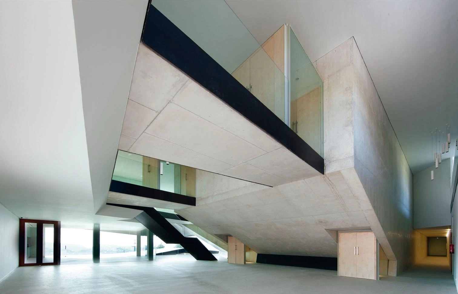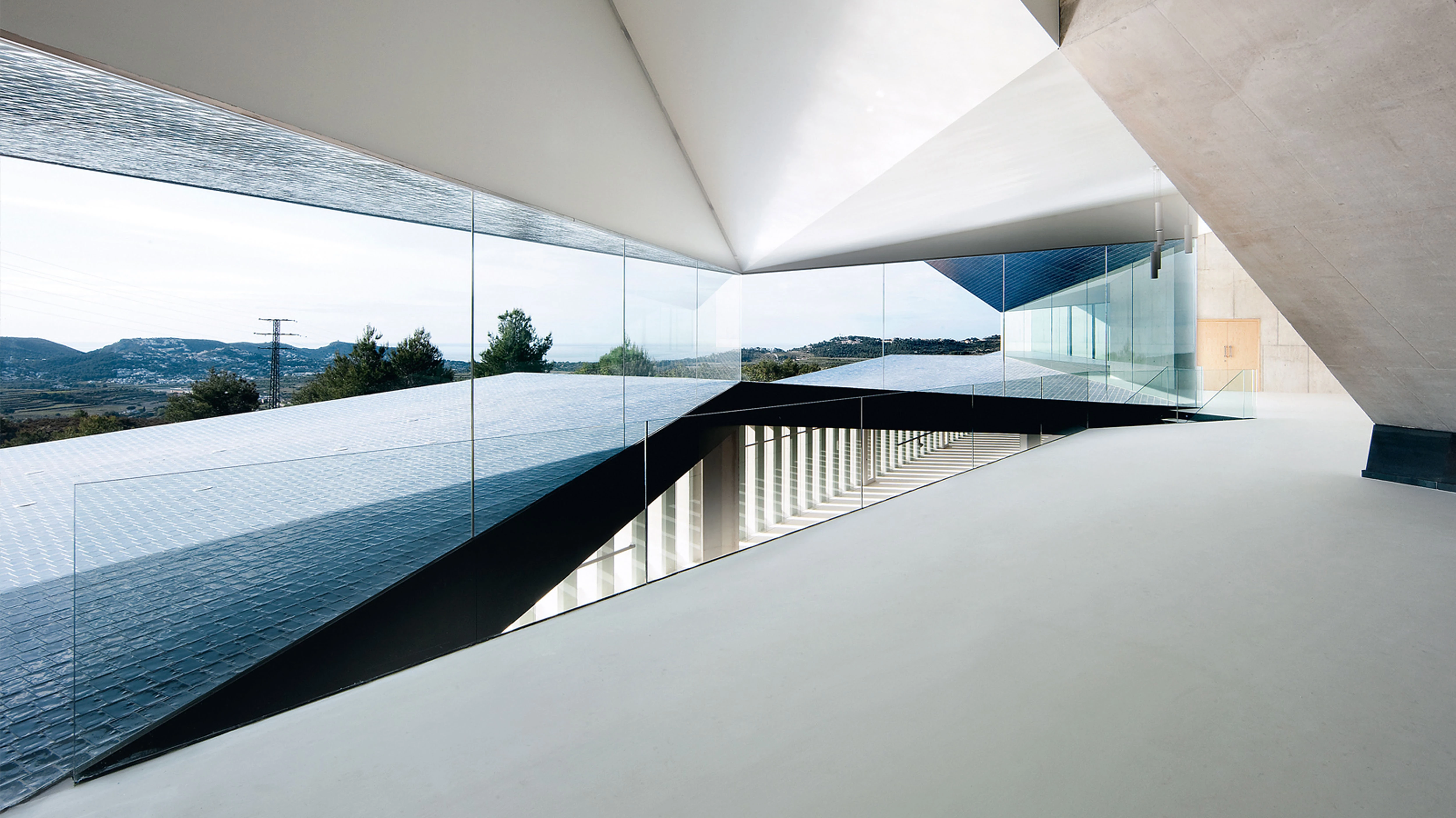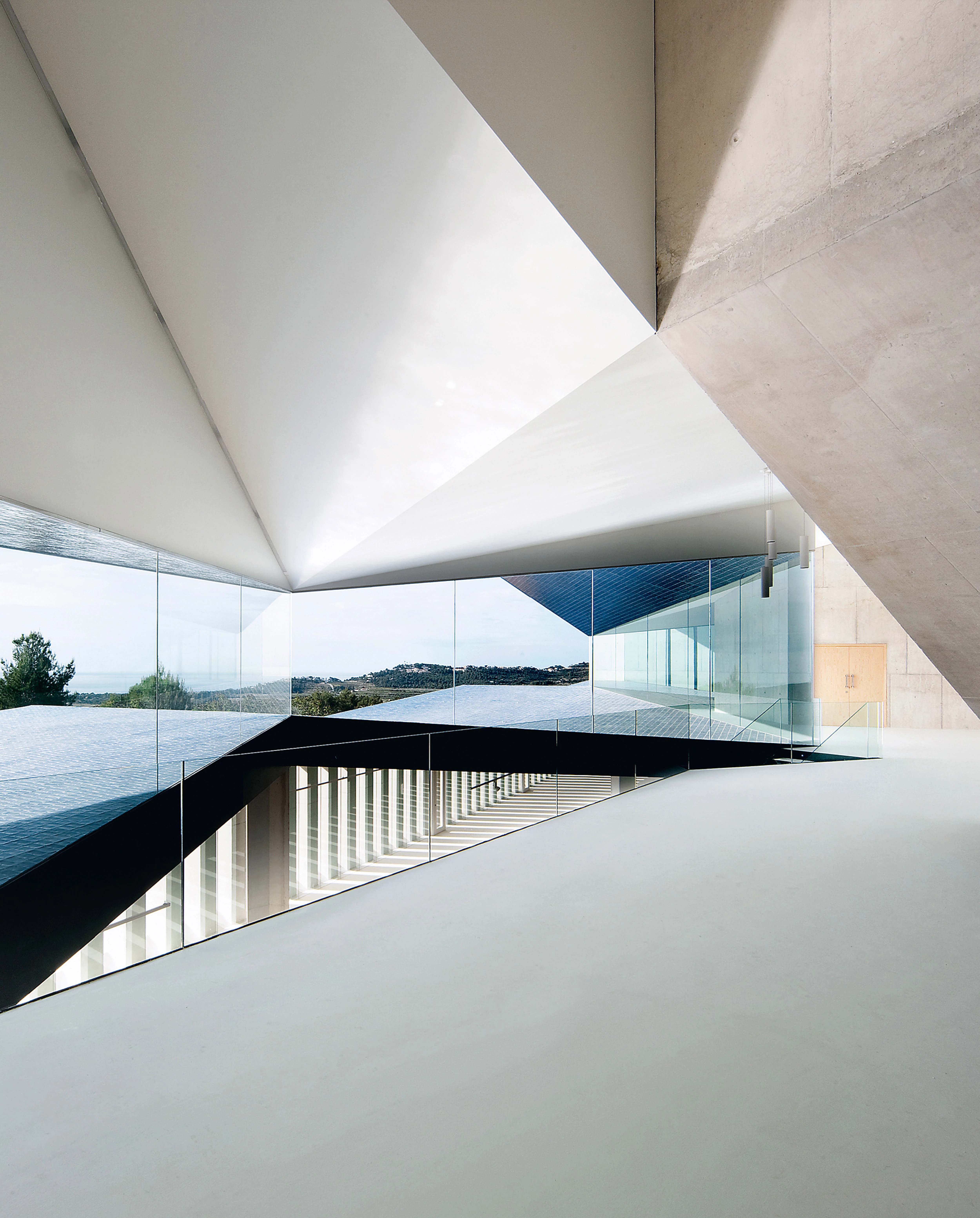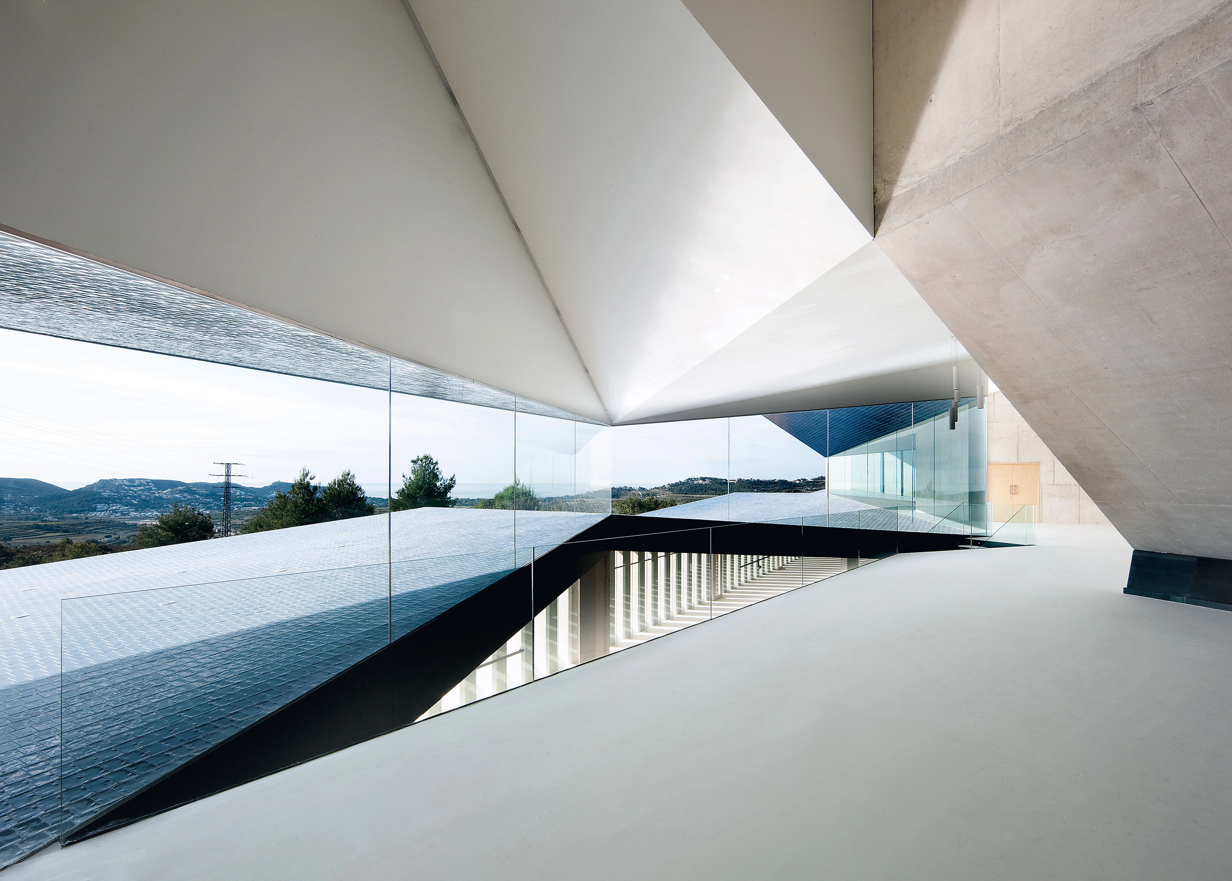 Los vestíbulos laterales a la sala principal se convierten en grandes miradores hacia la distancia y el mar, configurados según las pautas de una gran fachada-espacio profunda, geométrica y cuidadosamente esculpida como si de un diamante se tratara, todo ello considerando las diferentes inclinaciones solares para evitar la incidencia directa de la luz. Esta fachada lateral resume formalmente todas las intensidades desplegadas en el proyecto. En su espesor, como piezas engastadas, se incluyen la cafetería y el restaurante y, en un nivel más bajo, un área dedicada a exposiciones, todo ello con vistas sobre el Mediterráneo. El suelo de esta ‘gran abertura’, al igual que el techo, se pliega como metáfora de una playa rocosa, que en la distancia se funde con el mar verdadero. De noche la gran fachada se convierte en el telón teatral, el faro iluminado visible desde los caminos que unen Teulada con Moraira.