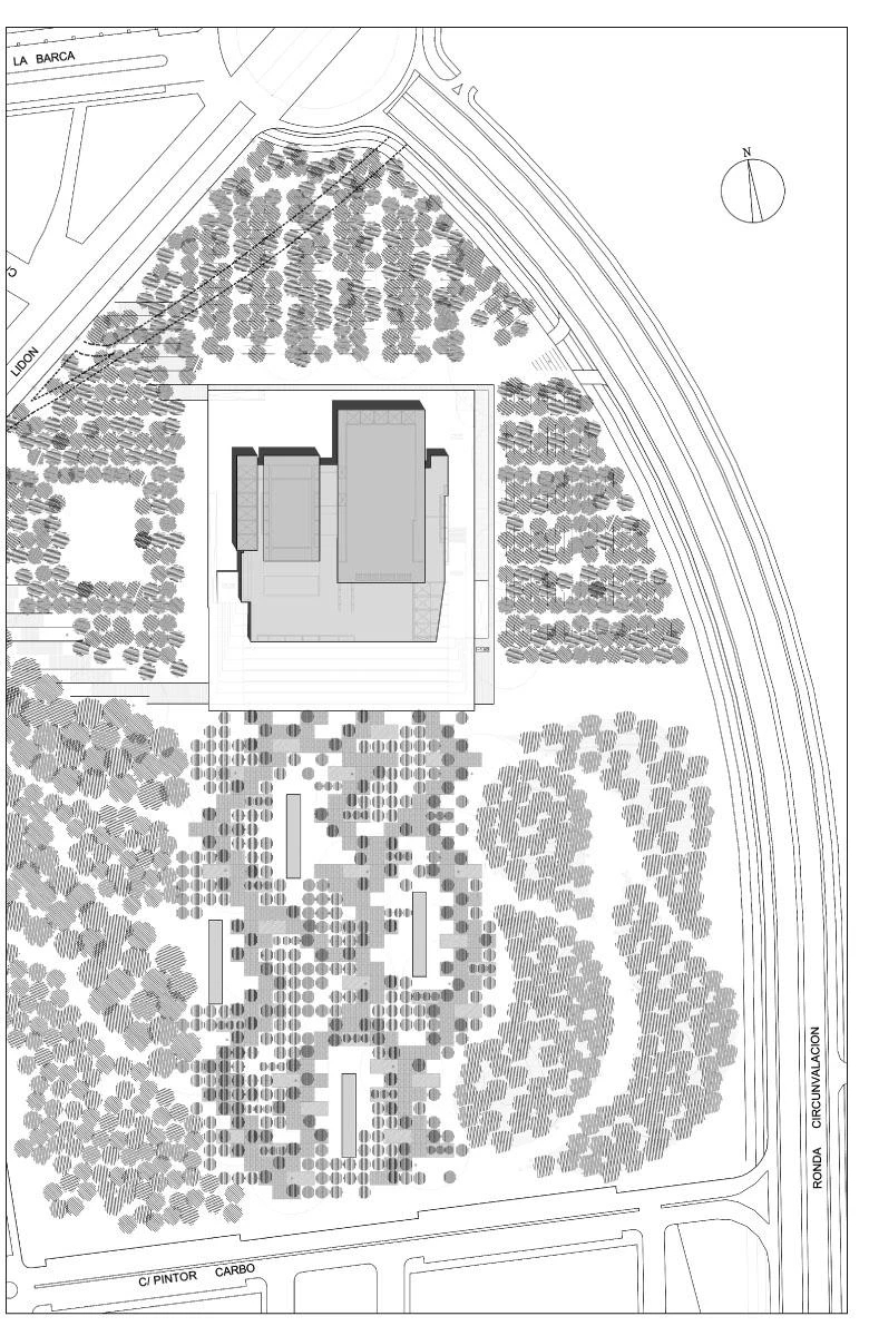 Levantado en el interior de un nuevo parque de 90.000 metros cuadrados del este de la ciudad (en un área en expansión residencial entre la urbe y la franja portuaria del Grau, dentro de los límites que impone la Ronda de Circunvalación), el auditorio y palacio de congresos de Castellón asume en su calidad de icono los deseos de la entidad promotora —la empresa de capital público y privado Castelló Cultural— de potenciar el progreso económico y el encuentro cultural y social. El parque incluye una gran plaza que se desarrolla longitudinalmente y en suave pendiente desde el borde de la parcela hasta la entrada misma del edificio, dirigiendo al público por un paseo entre naranjos, láminas de agua y dunas que culmina bajo el amplio atrio de acceso. La relación con el exterior tiene lugar de forma más controlada en los otros lados del edificio a través de un patio deprimido.
