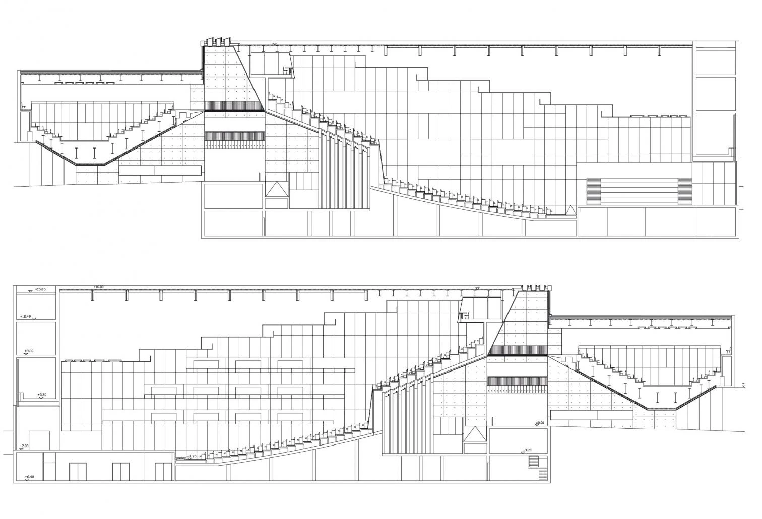 Cuatro piezas se unen para resolver un programa extenso y complejo. La pieza mayor corresponde a la sala sinfónica, de 1.234 plazas, situada a continuación del vestíbulo a una cota inferior, y a la sala de cámara, elevada sobre el mismo vestíbulo para comprimirlo en el punto de entrada: la primera posee dos plateas asimétricas que se abrazan en el punto donde surge el palco, además una bandeja con 100 asientos junto al escenario y una pared de fondo móvil que permite observar, cuando está abierta, la sierra lejana de la Magdalena; la segunda, con una sección en V que deja el escenario en una suerte de pasillo central, da cabida a 400 plazas y está dotada de luz natural.