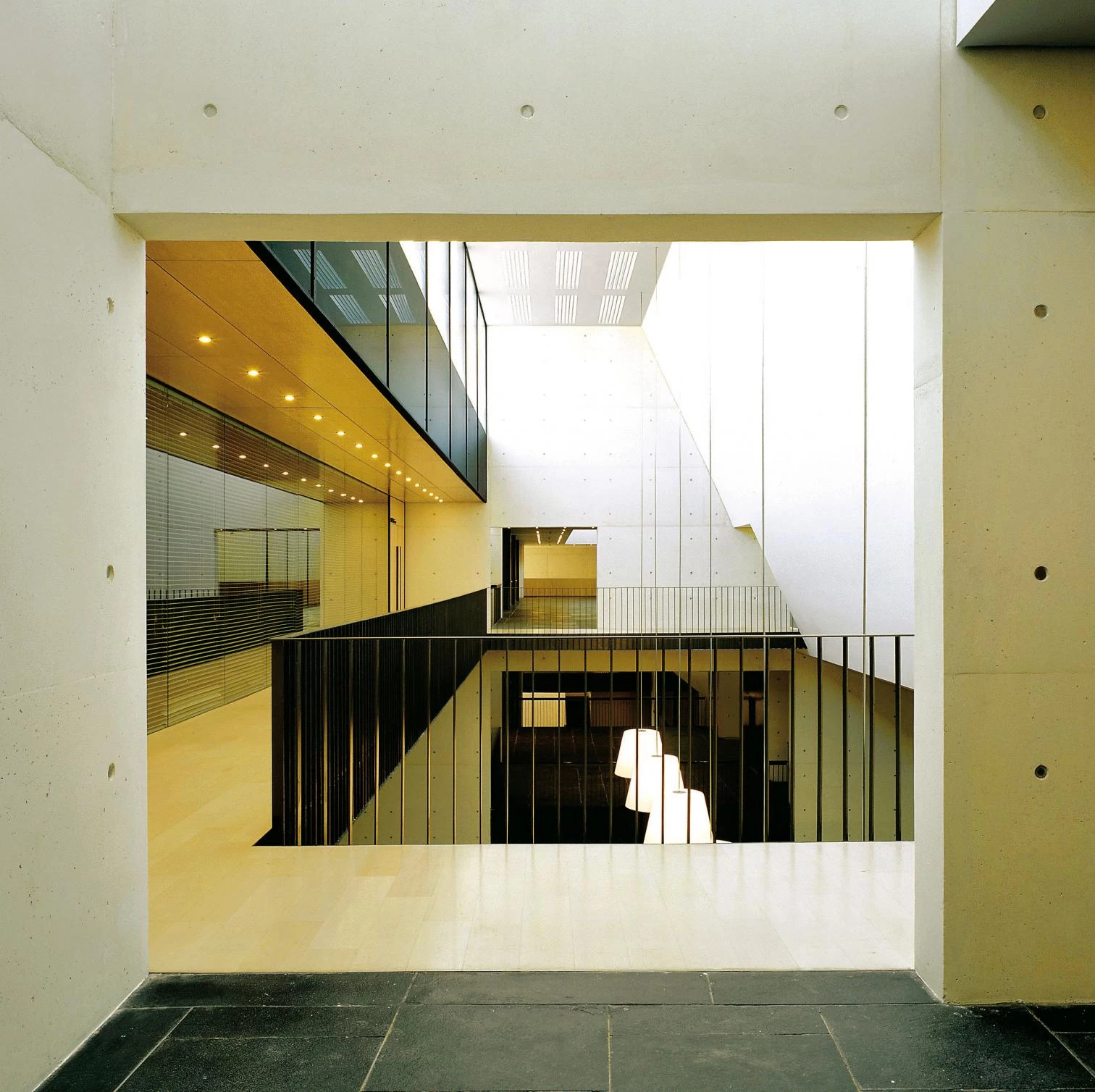Todas las salidas de la sala principal confluyen en el gran vestíbulo, situado bajo la platea superior. Desde aquí se aprecia la sala de cámara, suspendida sobre la entrada, y la calle interior que conecta con la sala polivalente.