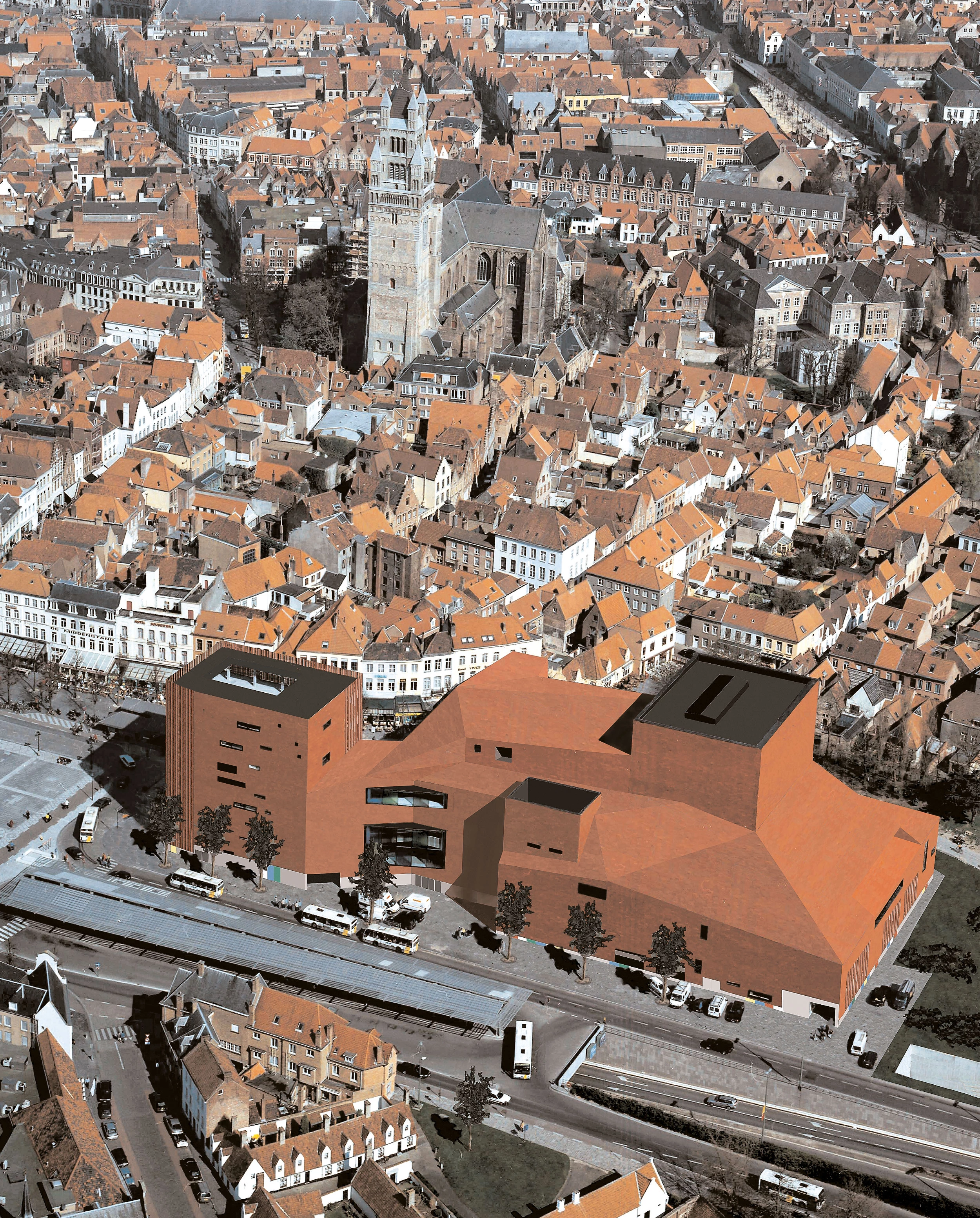 Como emplazamiento de la sala de conciertos se escogió el gran vacío que había quedado tras la demolición de la estación de Het Zand; su proximidad al centro y a una vía de circunvalación, y la existencia allí de un aparcamiento subterráneo hacían de éste el lugar más idóneo. A partir del programa —una sala para 1.300 espectadores (700 de los cuales en palcos) y otra de música de cámara que pudiera usarse como vestíbulo adicional—, el ‘cuerpo’ del edificio se modela para responder a estas situaciones urbanas y se reviste entera mente de terracota, elemento de conexión material con el tejido histórico. En la composición de planos plegados resultante, que modifica la percepción de la escala del edificio dependiendo del punto de vista, destacan la torre de telares del auditorio y el campanile de la sala de música de cámara. En diálogo con el Beffroi y la aguja de Saint-Sauveur, ambos contribuyen a redefinir el Het Zand como plaza. La posición de la entrada principal, en la fachada más próxima a los edificios vecinos y en el ángulo donde se encuentran el auditorio y la sala de cámara, crea una suerte de antesala reminiscente de las placitas recoletas características de la ciudad vieja.