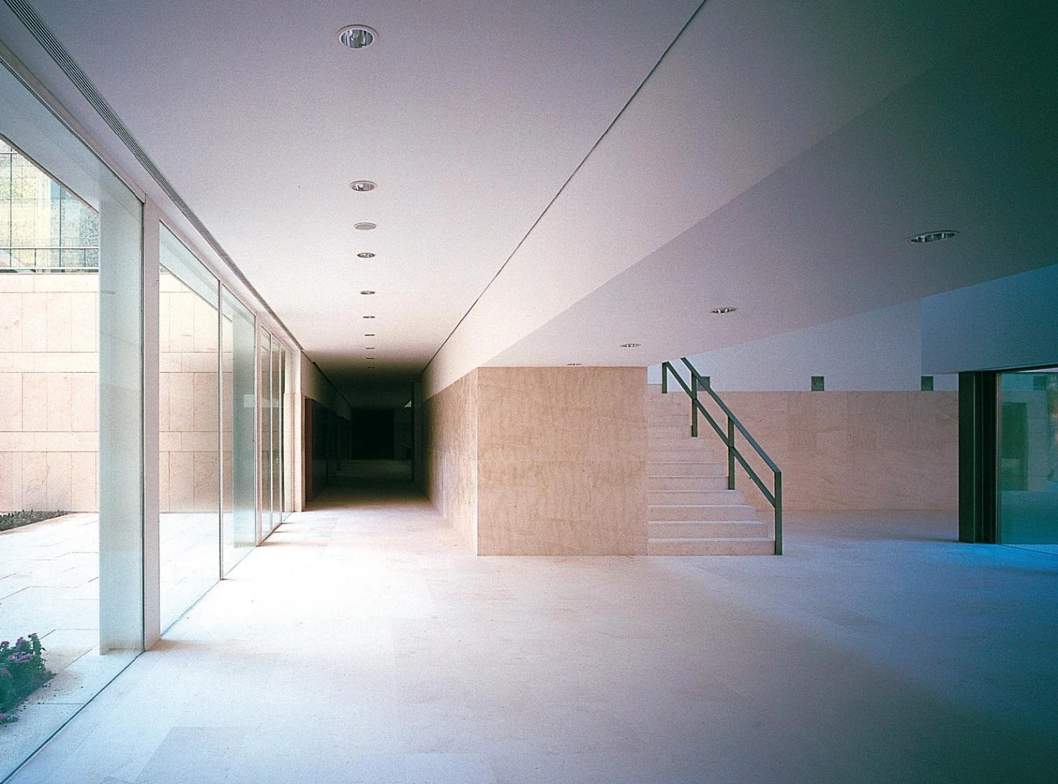 En paralelo a esta banda de carácter público, un segundo cuerpo de cuatro alturas alberga las aulas en la primera planta y los despachos departamentales en los niveles superiores, formando una estructura en peine que alterna las piezas construidas con patios de dimensiones equivalentes. La caja de partida se presenta así perforada por vacíos que generan al interior espacios de escala y cualidades diversas, en un secuencia cuyo punto álgido se localiza en el vestíbulo de entrada, un ámbito escalonado tensado entre el retranqueo de 9 x 9 x 9 metros que indica en la distancia el acceso en la fachada norte y el patio de 15 x 15 x 15 metros de la crujía sur.