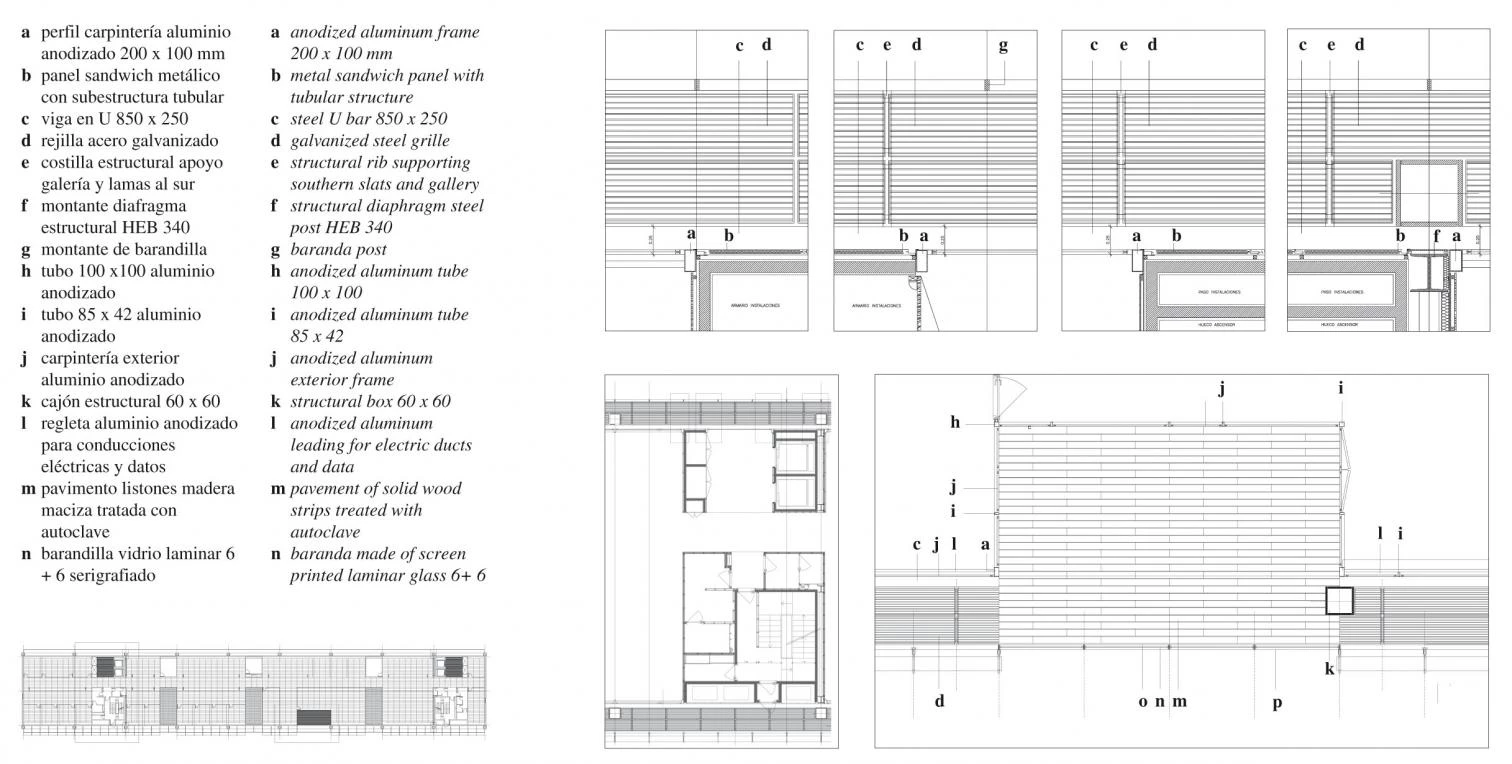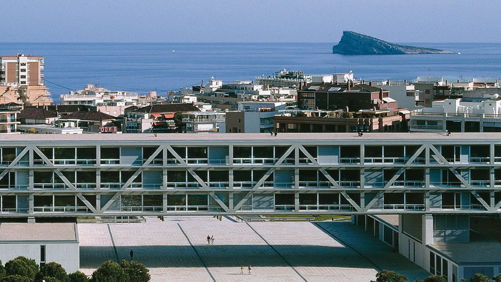 Ambas piezas reciben el peso de una viga cajón que con sus casi cien metros cruza la plaza en sentido transversal, comunicando las dependencias de ambos lados. En su interior, los despachos y departamentos se distribuyen en tres plantas de oficina abierta compartimentada por elementos móviles. En contraposición con las piezas inferiores, el vo-lumen horizontal revela su naturaleza prefabricada mostrando en fachada las grandes cerchas de acero que lo sostienen. Todos los elementos —forjados de placas pretensadas, tabiquería y revestimientos—se han montado en obra. Paneles de aluminio envuelven la gran viga en sus caras opacas, y se combinan con vidrio continuo en las caras mayores, norte y sur. En esta última orientación, una segunda piel de lamas de vidrio —serigrafiado con los nombres de los ciudadanos de Benidorm— permite controlar la temperatura interior en función del viento y el sol, gracias a unos sensores colocados en la cubierta. Diez patios, con distinta ubicación según la planta, ofrecen a los empleados una pequeña réplica de la plaza exterior a la que asoman.