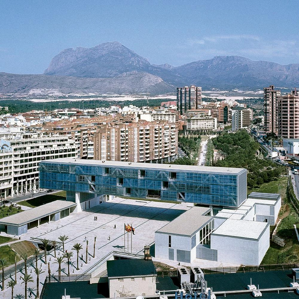 Rodeado por un bosque de torres, entre las cuales la más alta de España, el nuevo Ayuntamiento recupera la horizontal del mar con un edificio-puente que, elevándose sobre un antiguo cauce, crea a sus pies una plaza.