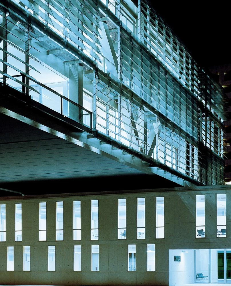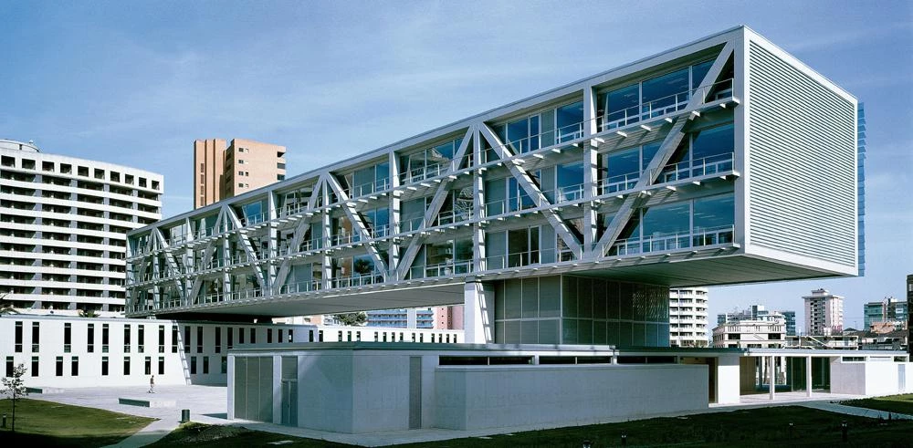 La necesidad de concluir la plaza —vinculada al uso institucional del volumen— y de cualificarla al mismo tiempo como lugar de paso, llevó a una solución de edificio-puente, que contrapone un gran prisma horizontal a los rascacielos del entorno. El programa se distribuye en altura en los dos compo-nentes esenciales del puente —los soportes y el tablero—, conservando la esencia de puerta de paso a la ciudad y de vacío en la trama urbana que el lugar, con su viejo cauce, poseía.