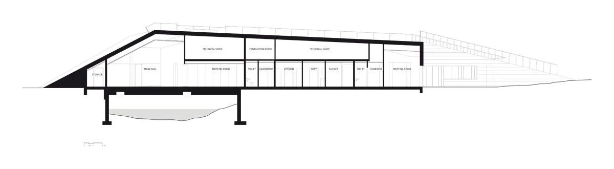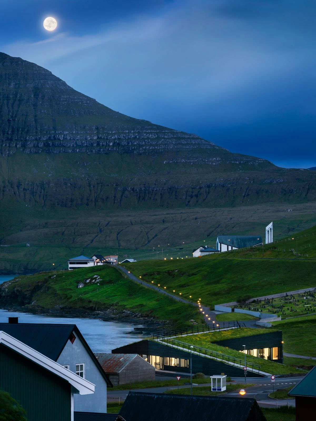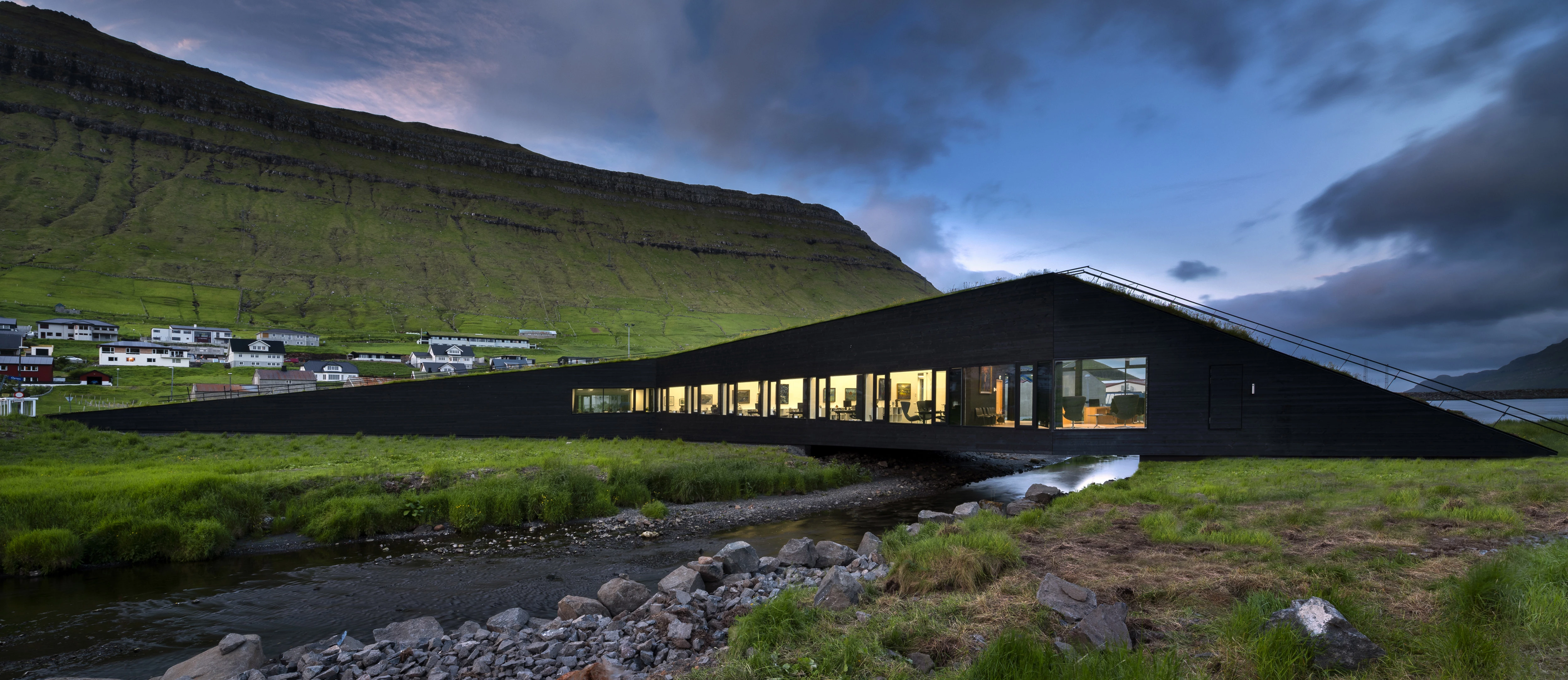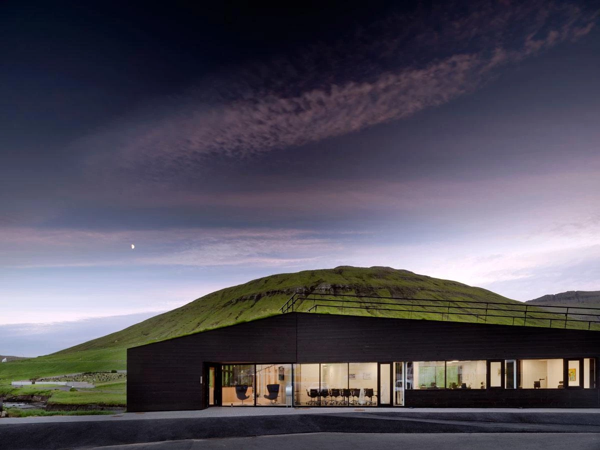 Este edificio para la municipalidad de Eystur diluye sus límites entre la naturaleza con una cubierta vegetal transitable que cruza un río. El autor del diseño es Osbjørn Jacobsen —socio feroés de la firma escandinava Henning Larsen—, quien también fue responsable del Auditorio y Centro de congresos Harpa de Reikiavik. El volumen está situado en la pequeña localidad de Norðragøta, en la costa este de las islas Feroe —un archipiélago autónomo en el Atlántico Norte, entre Escocia, Noruega e Islandia— que forman parte de Dinamarca. Norðragøta se formó en 2009 por la fusión de dos pueblos, Leirvík y Gøta, ahora conectados física y simbólicamente a través de esta construcción de 750 metros cuadrados. El edificio de una sola planta contiene, además de oficinas, espacios para reuniones y eventos comunitarios como conciertos o exposiciones.