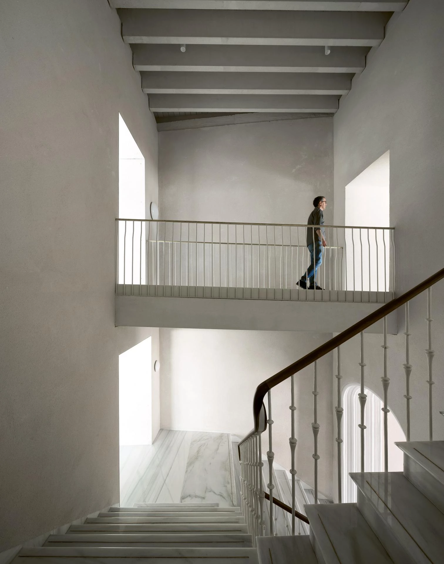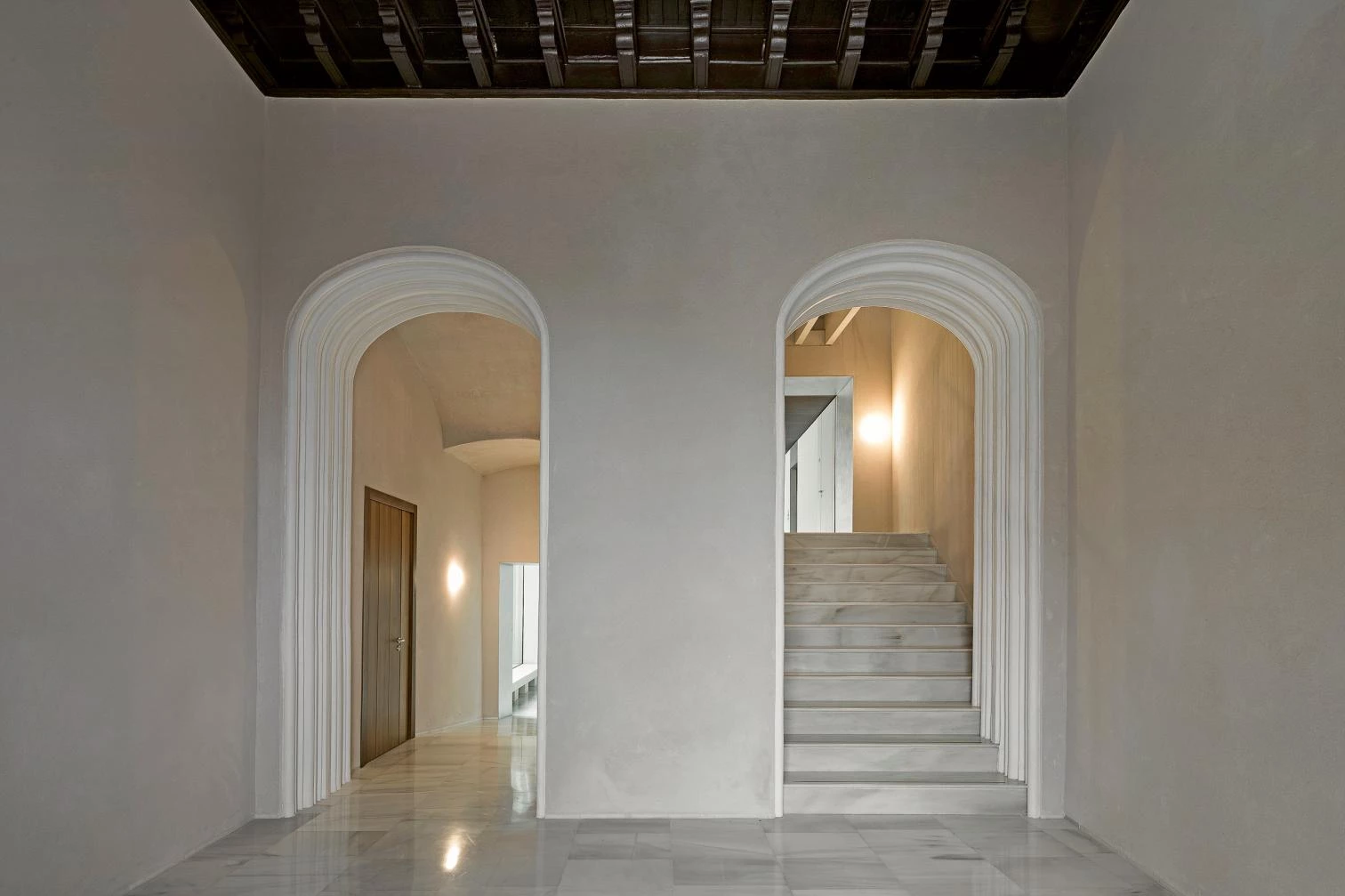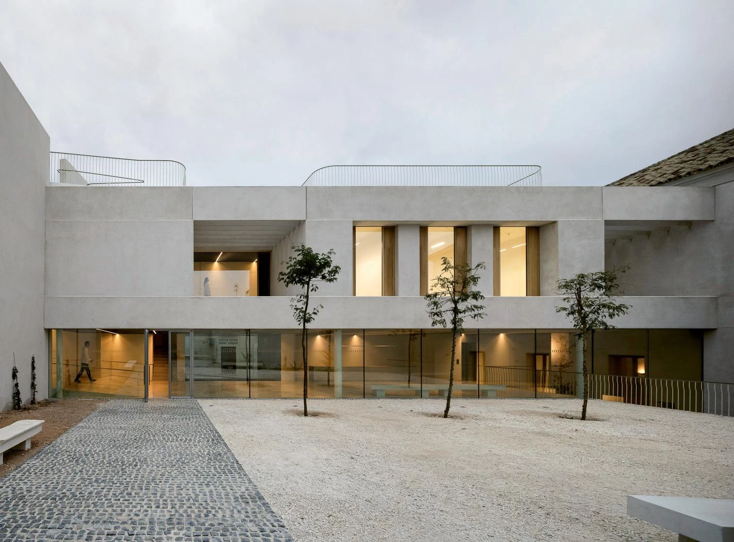 La intervención trata de recuperar el carácter sobrio y austero de las soluciones constructivas, espaciales y materiales originales, estableciendo así un puente de unión entre presente y pasado. Gran parte de la materialidad se ha confiado a revestimientos de mortero de cal natural que incorporan, en el caso de las fachadas, semillas y trazas vegetales, evocando la relación histórica del municipio con los cultivos y su agricultura. Piedras naturales, maderas, metales nobles y un tratamiento tradicional de la vegetación terminan de construir y recordar el carácter público y abierto de la institución.
