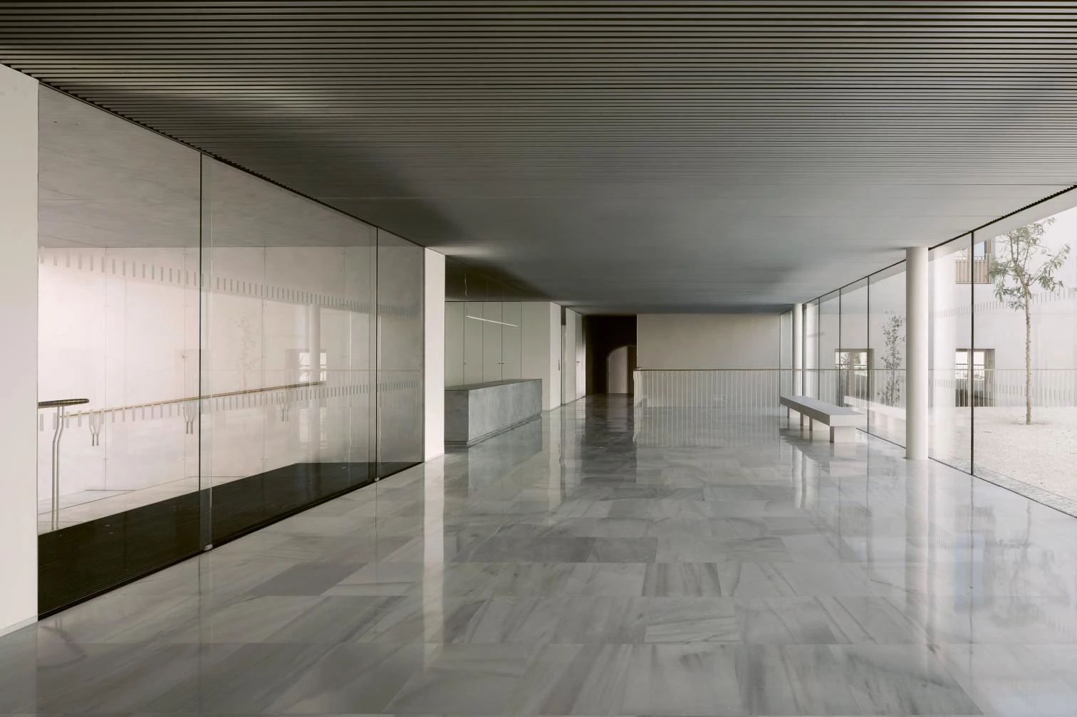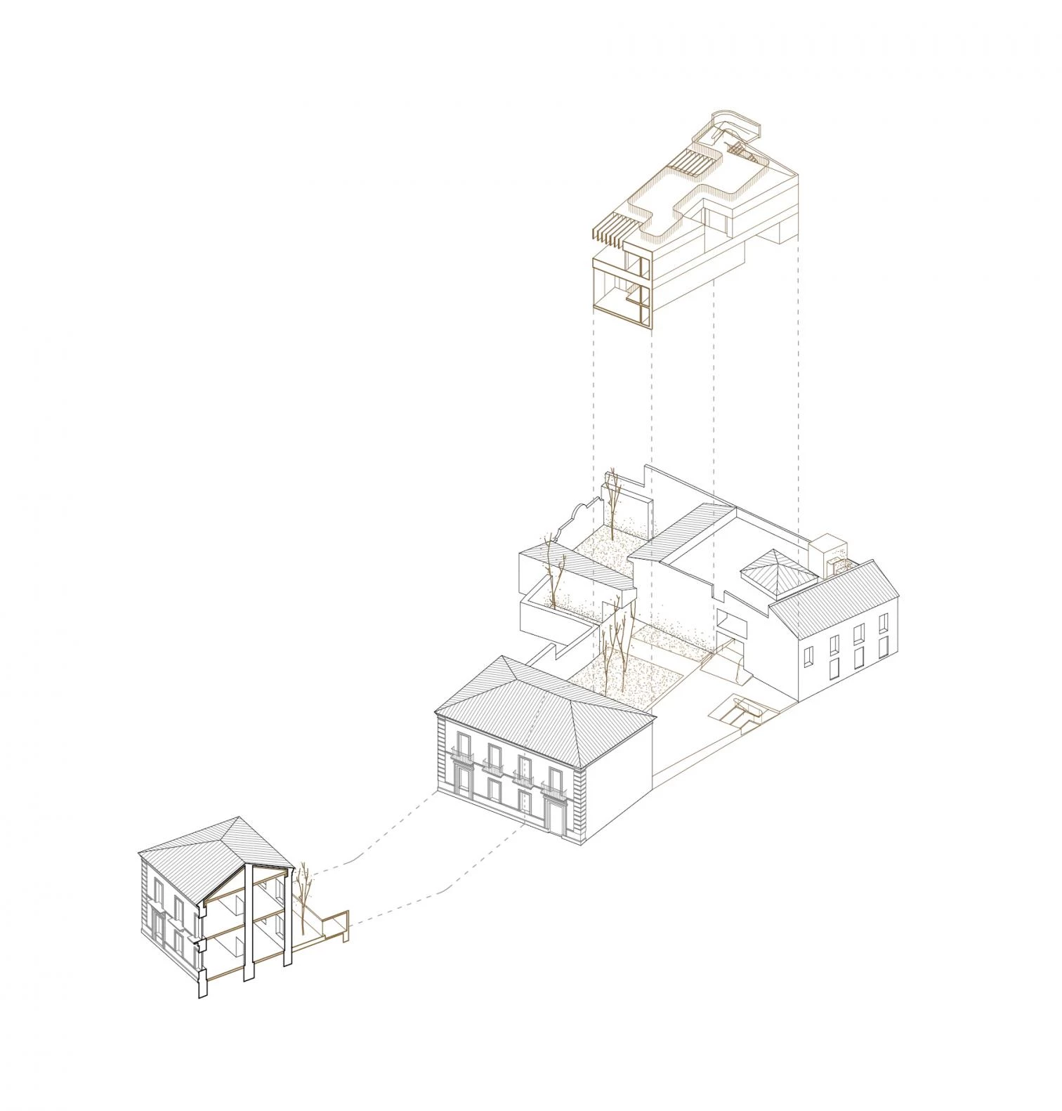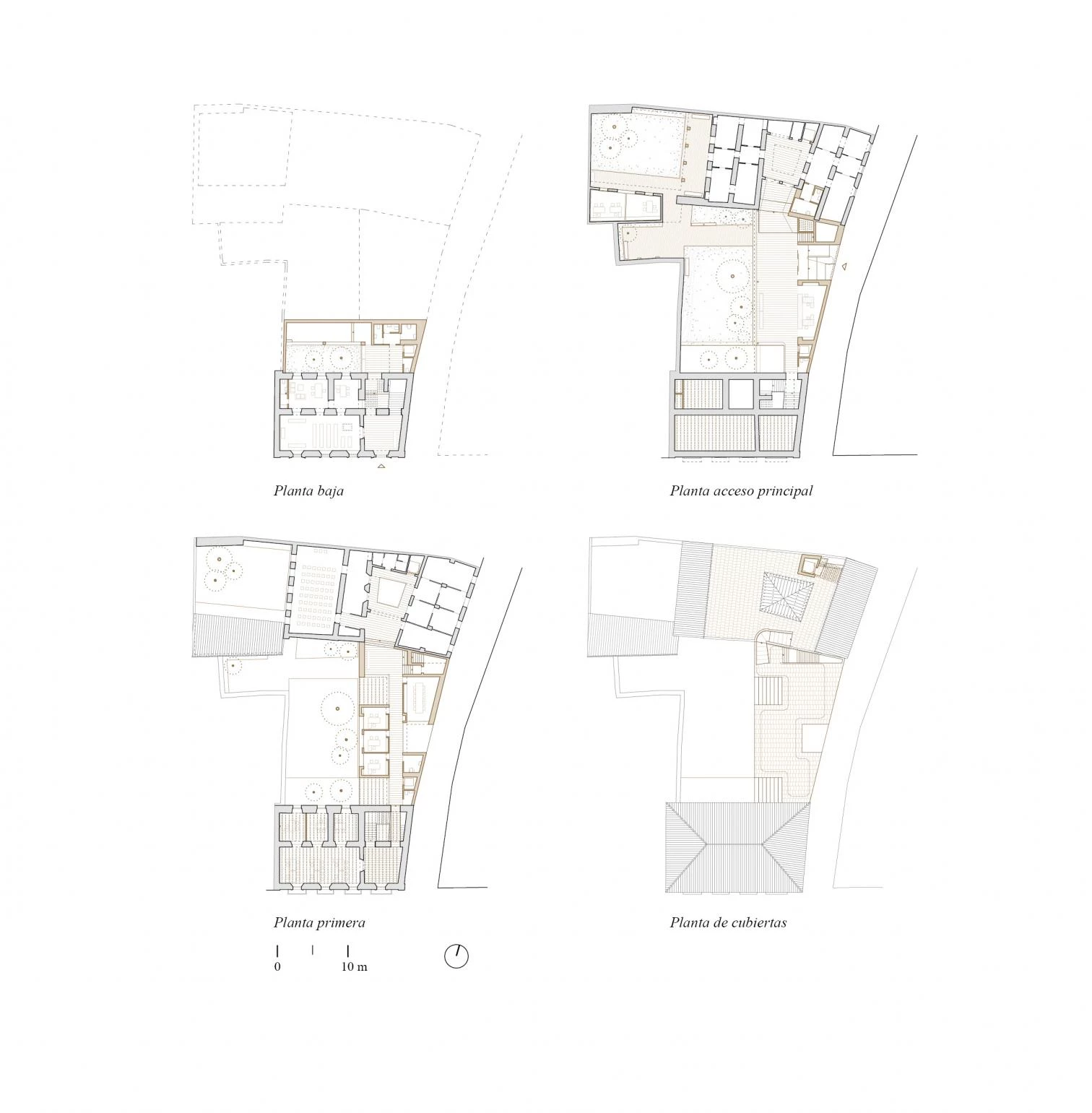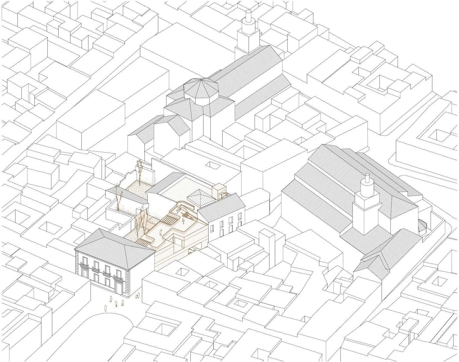 La disposición del programa se presenta con gran claridad. Tras el nuevo zaguán, un claro espacio de recepción queda conectado con un nuevo espacio público abierto que funciona como extensión de la estrecha calle de acceso. Este vaciado permitiría recuperar la fachada trasera del edificio histórico y en consecuencia la condición exenta original del mismo. Mientras esta planta baja pública ajusta el acuerdo entre sus distintos niveles y la calle conectando los recorridos de todo el conjunto, la planta superior se dispone como espacio de trabajo, conectándose a un lado con el área administrativa y al otro con el área técnica. El impacto con el edificio histórico se minimiza debido a una secuencia con patios y una doble altura que permiten preservar el contacto entre ellos.