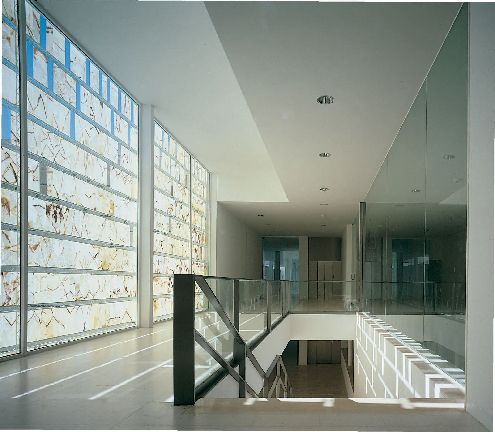 El programa —que incluye un centro cívico y una comisaría, además del ayuntamiento— se distribuye siguiendo una estratificación de usos. La planta baja alberga al sur las dependencias policiales —con acceso propio— así como las aulas y la sala de exposiciones que constituyen el centro cívico, reservando su ala norte a la parte administrativa más frecuentada por el público. El nivel intermedio está dedicado a los departamentos técnicos y da acceso al salón de plenos a través de un vestíbulo cerrado por paños de ónice. Este retablo translúcido incorpora piezas de vidrio a ritmo irregular, proyectando un mosaico alterno de luz y penumbra sobre la escalera principal. En el último piso, el alcalde ocupa el cuerpo central, en una posición fácilmente identificable por todos los ciudadanos.