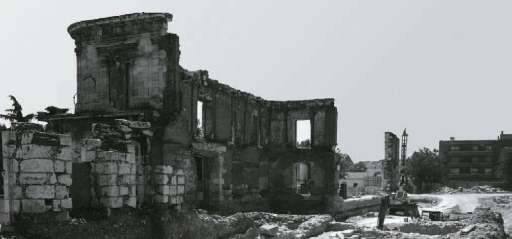 Separado por un espacio longitudinal de los restos de la Real Fábrica de Paños, el prisma del ayuntamiento se perfora con un vacío adicional para iluminar el vestíbulo del salón de plenos con un lienzo de ónice y vidrio.