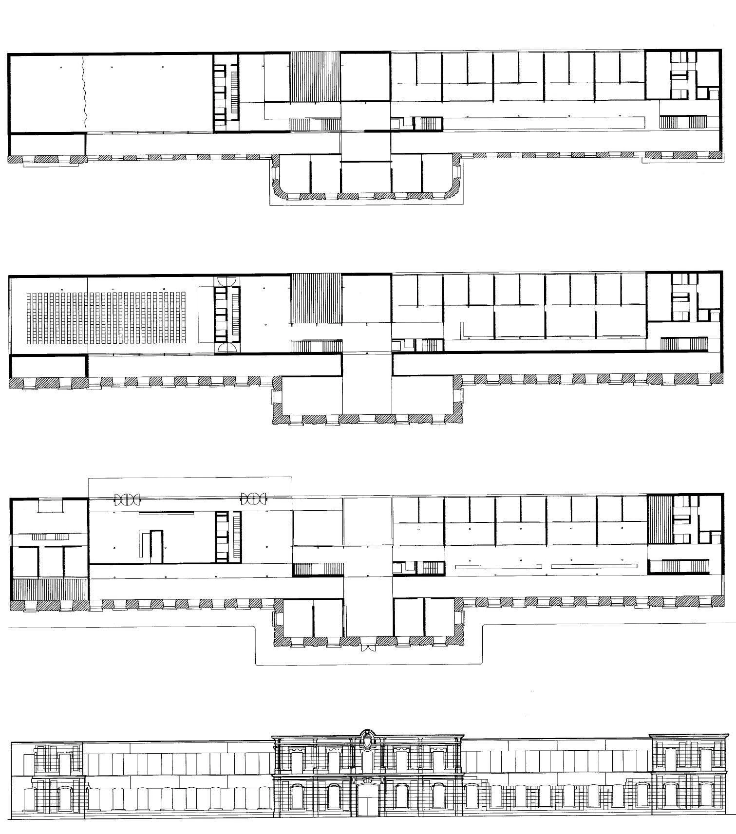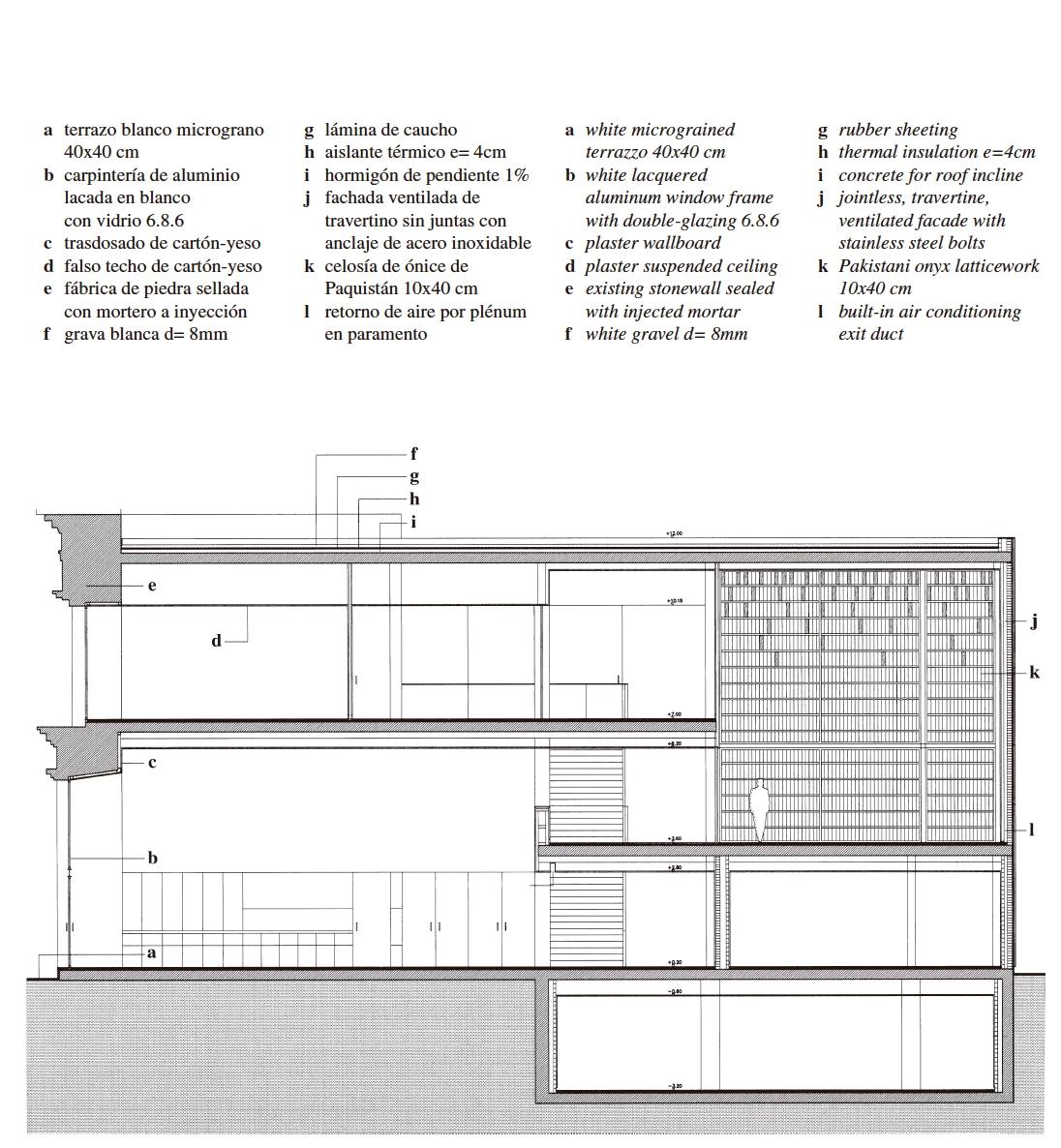 De la construcción dieciochesca tan sólo quedaban en pie parte de las alas norte y sur de la fachada principal y el cuerpo central que sobresalía ligeramente de ella. La nueva intervención propone situar tras este telón pétreo un prisma de 112x18x12 metros, extrusión directa de la traza de la antigua fábrica. Un vacío longitudinal que recorre toda la altura define una suerte de fachada interior, vertebrando este complejo cívico. La grieta —iluminada al ritmo regular de las ventanas existentes— hila en un recorrido lineal la secuencia de espacios singulares (el salón de plenos, su vestíbulo y la sala de recepciones oficiales) además de contribuir a la orientación del usuario en los pasillos de acceso a la inevitable sucesión de despachos. Otros vacíos menores caracterizan partes concretas del edificio, separando unidades funcionales; así sucede con el patio interior que segrega los aseos de las oficinas con el volumen extraído entre el vestíbulo del salón de plenos y la sala de recepciones, que define con sus sombras el alzado posterior.