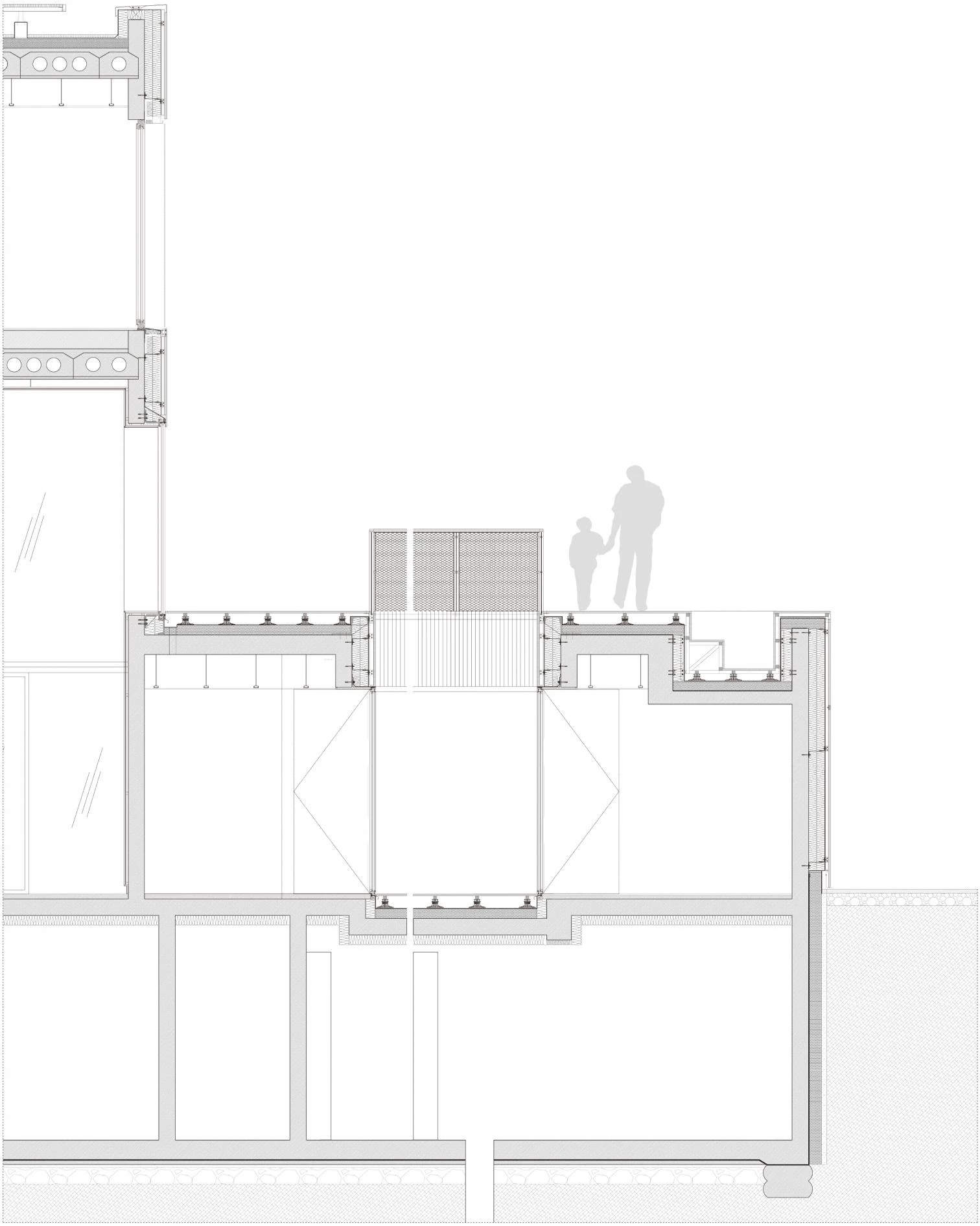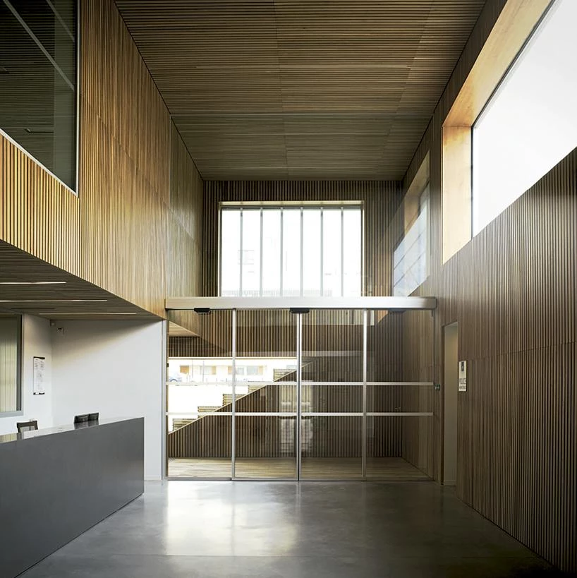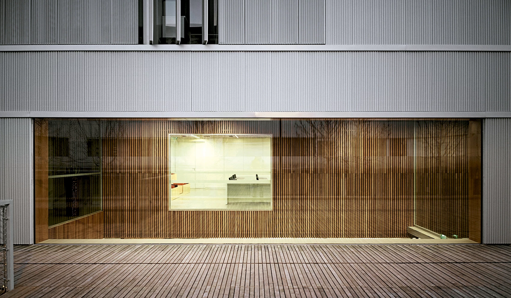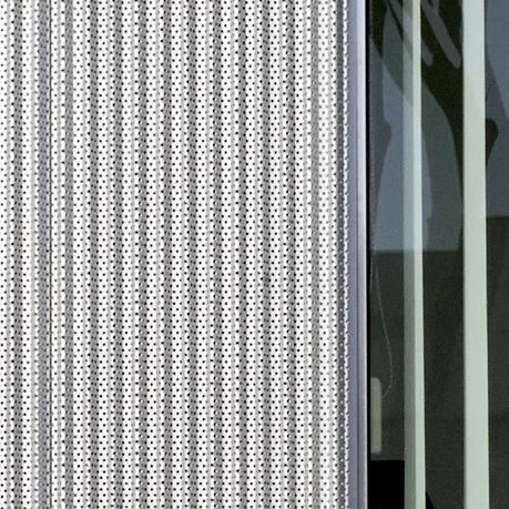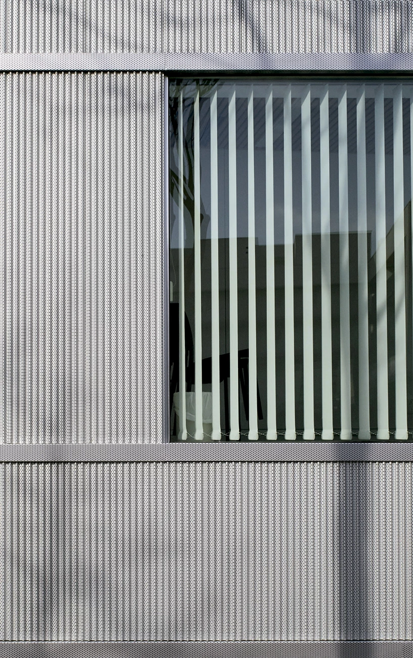 La presencia de grandes huecos, de patios y del amplio atrio central dota al interior de luz natural abundante y refuerza su relación con el entorno urbano. Durante el día, la chapa de aluminio —cuyo grado de perforación de la envolente varía en función de la orientación— protege el interior de la radiación solar y garantiza unas condiciones de confort adecuadas; mientras que por la noche, gracias a su porosidad, se transparenta para revelar el interior del edificio.