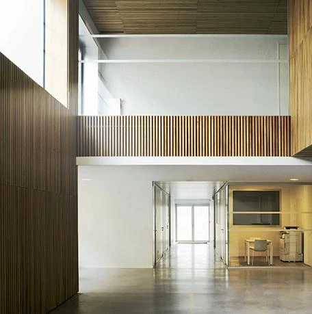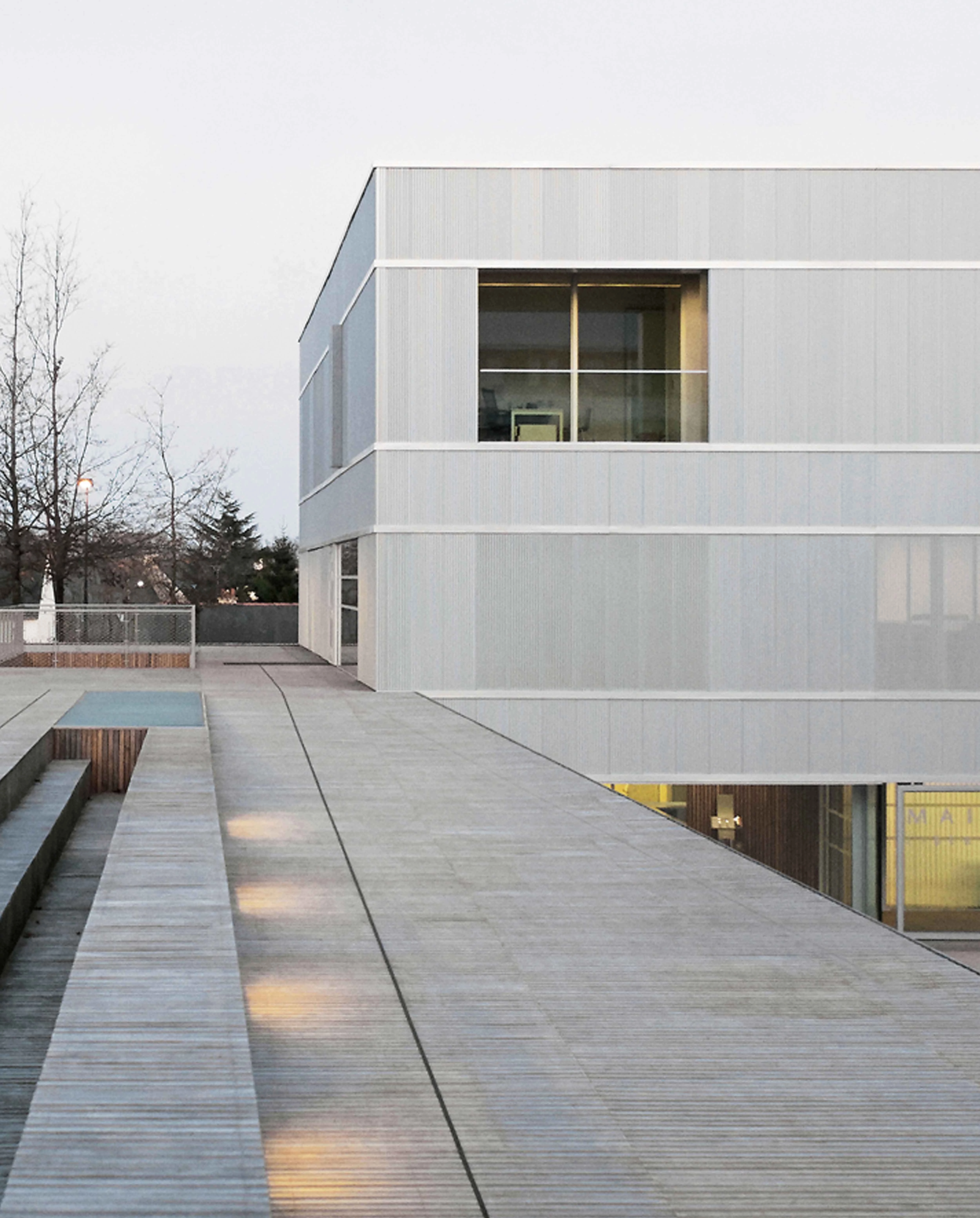El edificio se completa con dos plazas públicas, a cotas diferentes, unidas mediante un graderío. Además de funcionar como una prolongación del interior, invitan al usuario a entrar, al tiempo que interactúan con su entorno e incentivan la actividad urbana en las calles aledañas. Por su parte, el lenguaje abstracto y continuo de las fachadas, revestidas con una chapa perforada de aluminio, confiere al conjunto una imagen contemporánea que lo mimetiza con su contexto urbano. La claridad geométrica del volumen se refuerza mediante la legibilidad y fluidez de las circulaciones interiores. La planta baja se abre completamente a la plaza principal —que salva el desnivel respecto a la cota de la calle—. El vestíbulo a doble altura, en torno al cual se articula el programa, es el centro del edificio. Además de recibir a los usuarios, conecta la planta baja con la plaza superior. Ésta permite un acceso independiente al salón consistorial y a las salas para bodas civiles, y los dota de un espacio abierto de recepción. La planta superior acoge las oficinas administrativas y el despacho del alcalde, que cuenta con una terraza hacia la plaza que hace las veces de tribuna de pregones. Además, el revestimiento continuo de madera otorga al interior una atmósfera cálida que se prolonga también al exterior a través del pavimento de las plazas públicas.