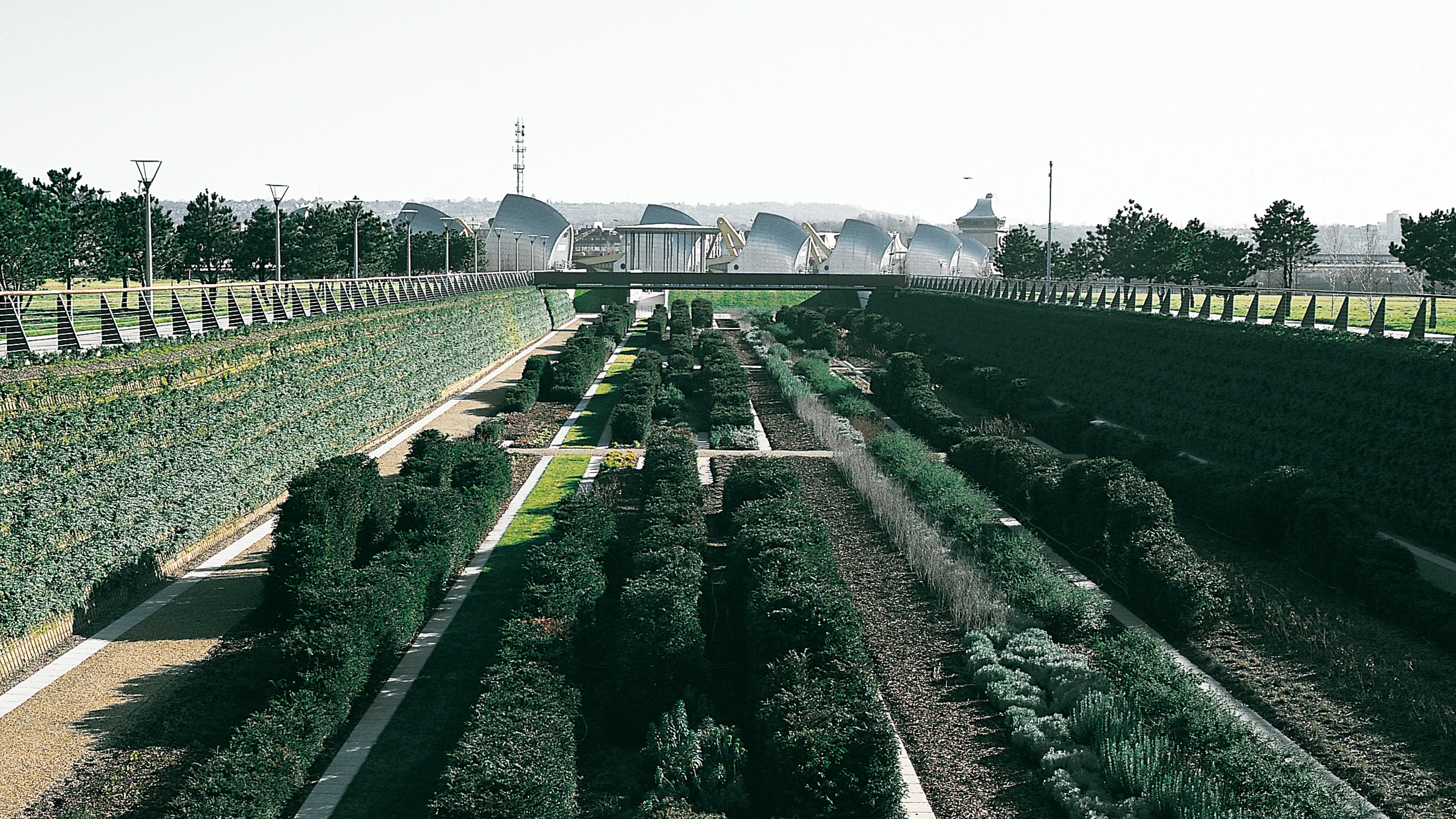 El parque toma su nombre de Thames Barrier, el conjunto de carcasas metálicas de la planta que domina las vistas del parque desde la orilla opuesta del río Támesis. De planta aproximadamente cuadrada, el parque encuentra en el paisaje portuario de dársenas y espigones su fuente de inspiración. Un muelle verde cruza en diagonal la parcela, cortando la pradera con una franja rehundida que, protegida del viento, proporciona un microclima para plantas más delicadas. Formando un río vegetal y multicolor, una serie de plantaciones lineales se disponen en bandas a lo largo de esta zanja, que se estructura a partir de setos paralelos de tejo recortados en sucesivos perfiles ondulados. Entre estas ‘olas vegetales’ macizos de lavanda y romero aportan un color y un olor distintivo al paseo que discurre entre muros de contención formados por jaulas de tierra tapizados de tejo, en una recreación libre del kitchen garden presente en el jardín inglés. Como si se tratara de puentes sobre un río, sendas pasarelas unen las dos mitades en las que queda dividida la plataforma elevada de césped, subrayando la condición fluida que el muelle verde evoca. Tensando la forma lineal de este parque dentro del parque, una fuente anuncia la presencia del muelle verde junto al aparcamiento, mientras un pabellón conmemorativo sobre una plataforma de madera lo identifica desde el río.