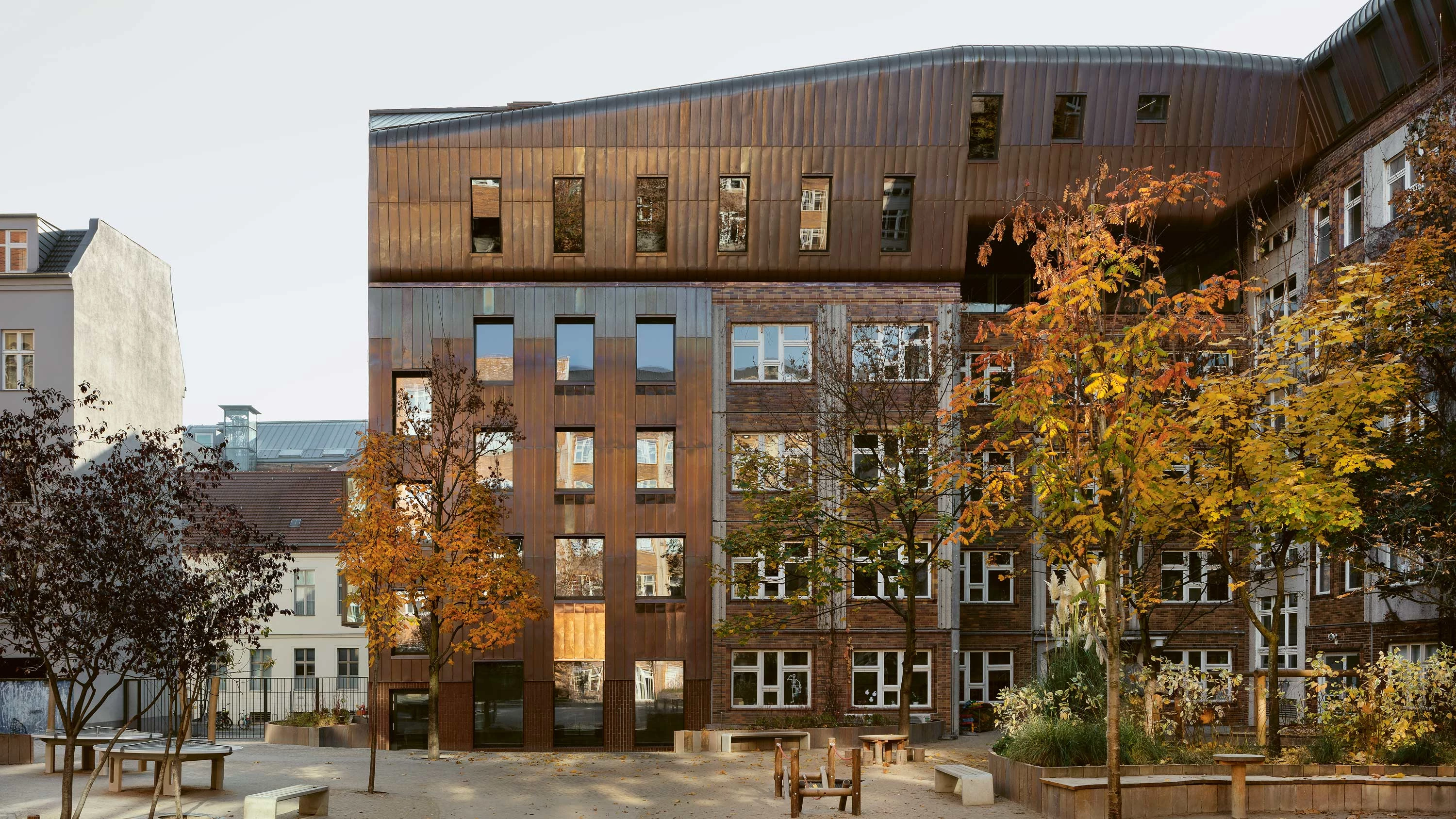 El gobierno de la RDA recurrió con frecuencia a los llamados Plattenbau, edificios residenciales construidos con grandes forjados prefabricados, para conformar sus ‘nuevas zonas de desarrollo’ e intentar solucionar la escasez de vivienda pública tras la guerra. La intervención actúa sobre uno de estos complejos, levantado en el año 1987, para ampliar las instalaciones de la Berlin Metropolitan School. La estructura original se completa con varios niveles adicionales y con un nuevo cuerpo que cierra la manzana para ofrecer desde nuevas aulas y espacios administrativos hasta una biblioteca, un auditorio o un jardín en la cubierta.