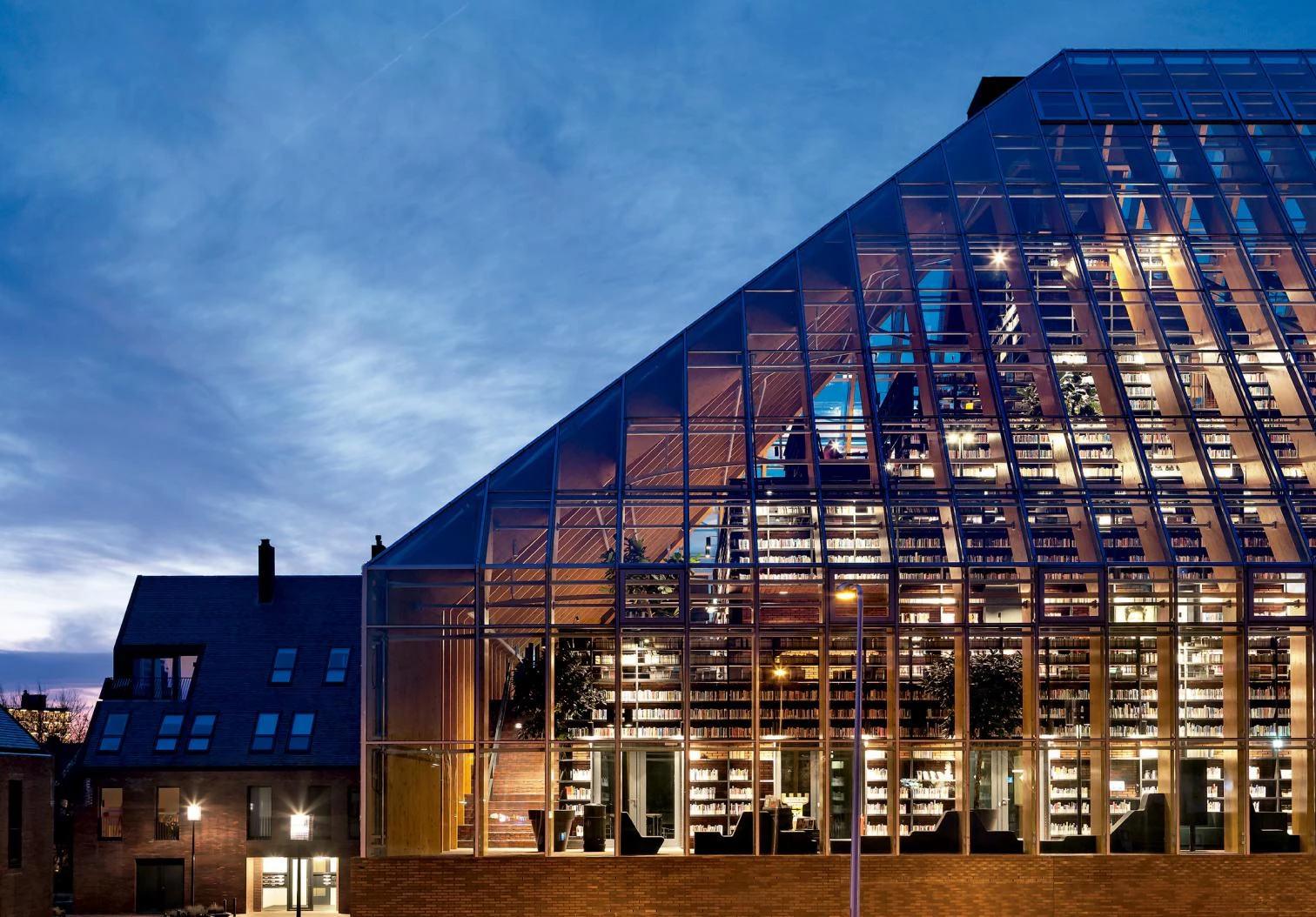 El cerramiento de vidrio toma la forma arquetípica de un granero, en referencia a la historia del lugar. En el interior, los acabados se resuelven con el mismo ladrillo del exterior para crear continuidad y reforzar el carácter público del espacio. Varias plataformas se superponen para crear un perfil escalonado y albergar en su interior otros equipamientos complementarios como un club de ajedrez, un auditorio, oficinas o comercios; el perímetro de esta pirámide es una estantería continua realizada en cerámica reciclada.