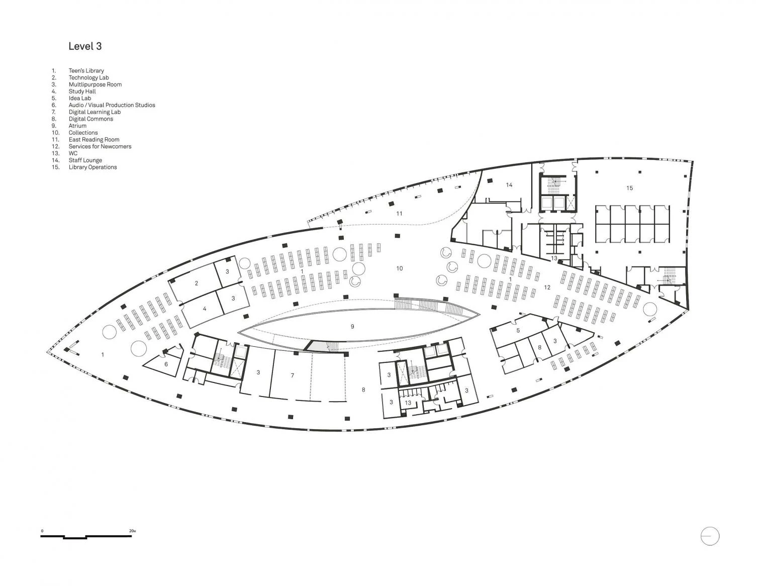 El acceso al vestíbulo principal se produce a través de una entrada elevada sobre las vías del tren ligero que circula a la cota de la calle. La forma de la entrada revestida en madera hace referencia al arco Chinook, una formación nubosa causada por los vientos característicos de la región. La fachada modular, en cambio, se presenta como una superficie de vidrio continua con un despiece hexagonal con opacidad variable, con paneles que oscilan entre el blanco y transparente. Una vez dentro, el espacio interior de la biblioteca se organiza en torno a un gran atrio elíptico envuelto en madera que distribuye la privacidad de sus espacios a medida que se asciende hacia la cubierta, de menor privacidad a mayor.
