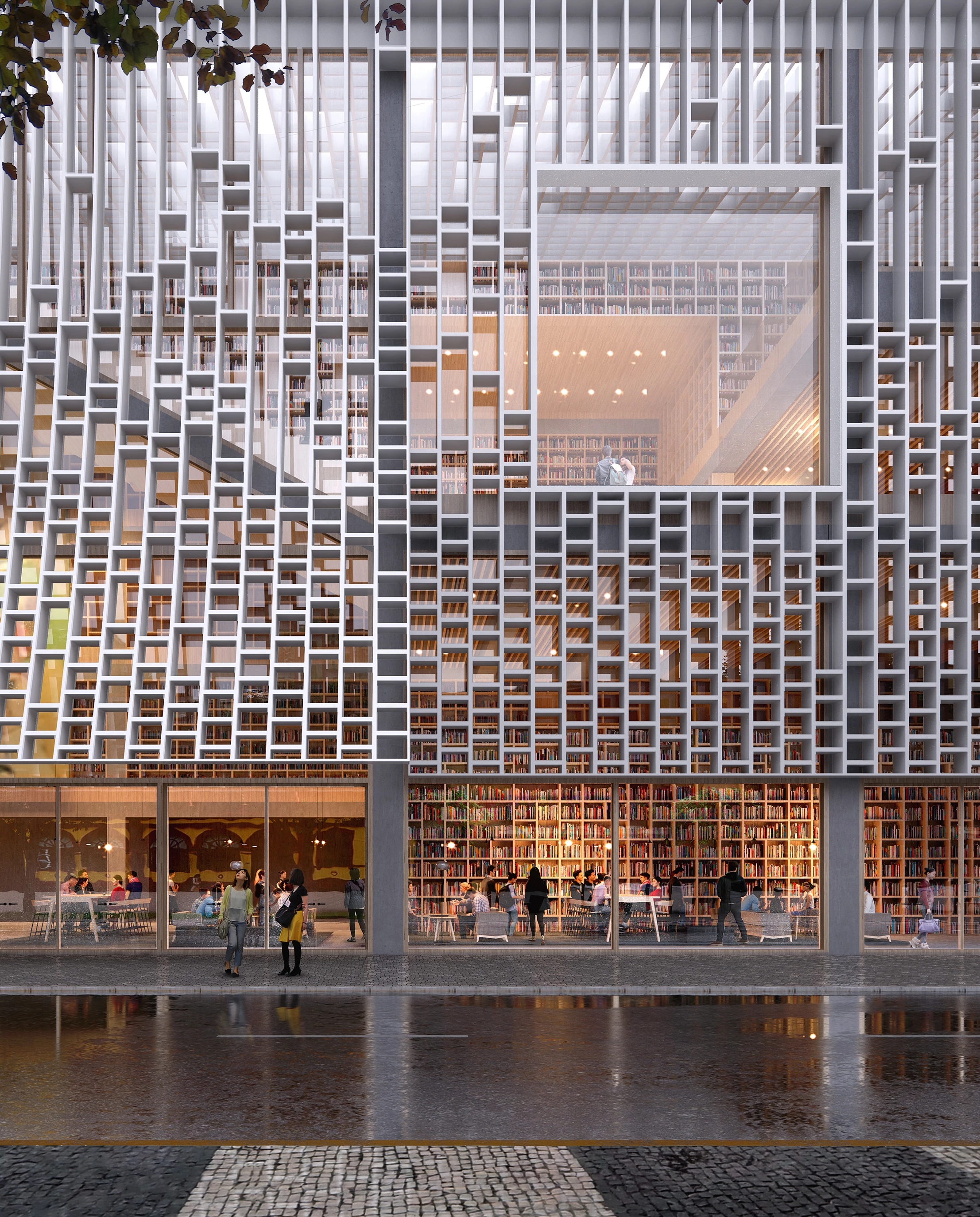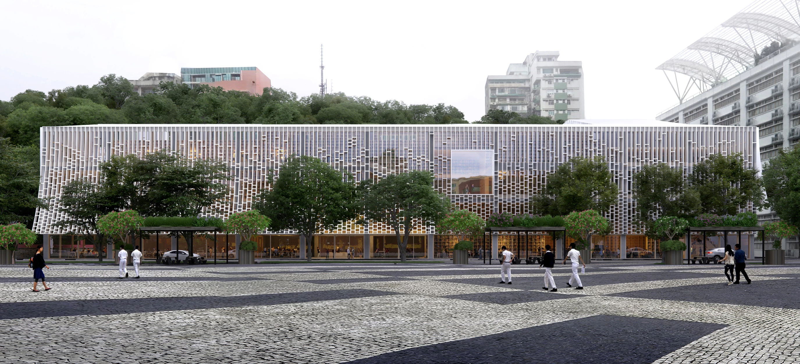 La nueva biblioteca se construirá en la plaza Tap Seac, situada en el centro histórico de Macao, declarado Patrimonio de la Humanidad por la UNESCO. Su fachada reticular evoca el exterior del antiguo Hotel Estoril, ubicado en el mismo lugar donde se levantará la biblioteca. En el acceso principal, la piel que envuelve el volumen se abre como un libro y su patrón actúa como una extensión de las estanterías interiores.