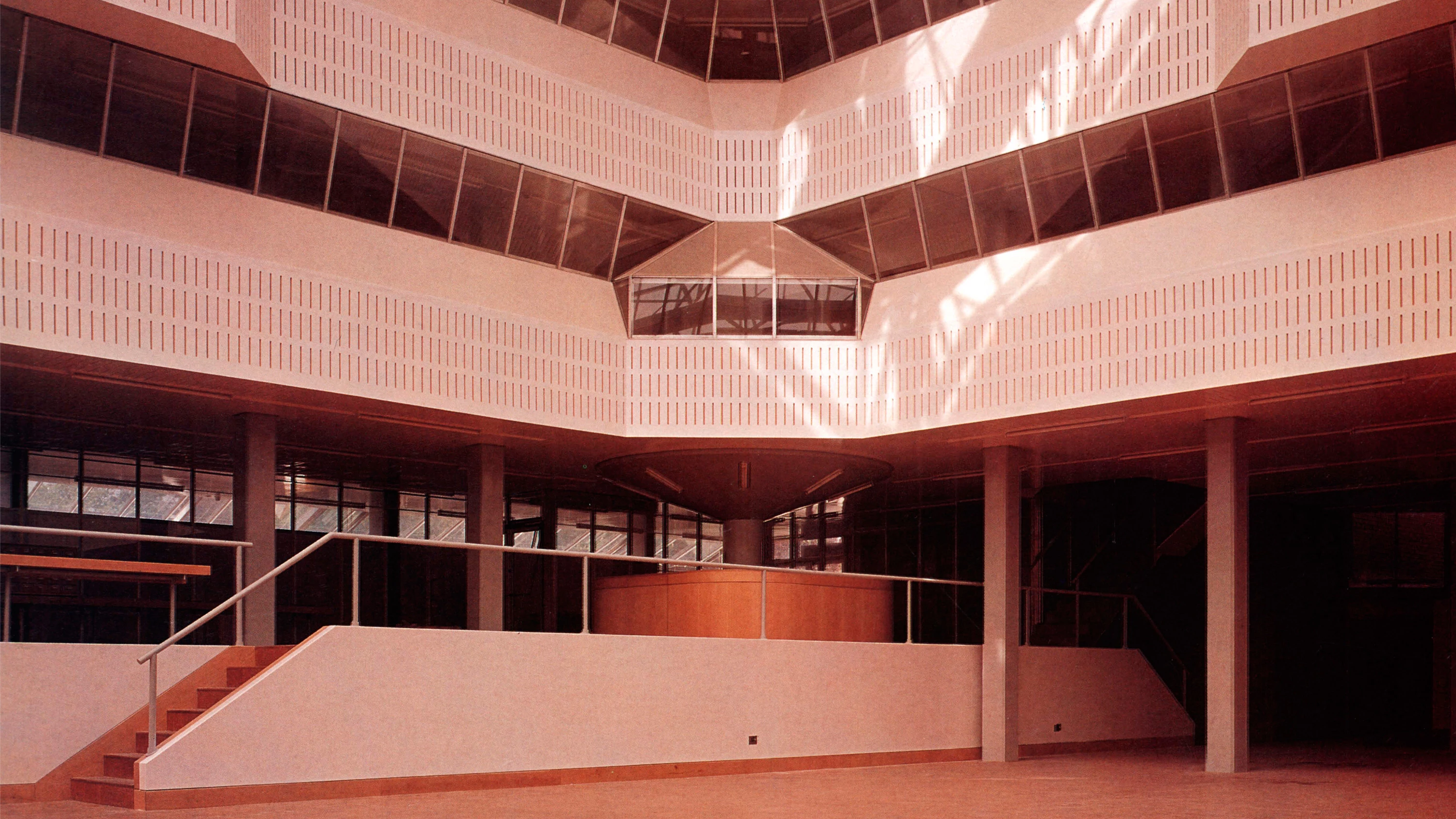 Sólo dos materiales definen la personalidad del edificio: el ladrillo de los muros ciegos y el vidrio de las extensas pieles transparentes. La referencia a los invernaderos decimonónicos es patente en la gran tienda triangular que cubre ese cuadrante de panóptico que es la sala de lectura de la biblioteca. Su doble capa de vidrio y la visión de los extractores de aire son un antecedente indiscutible del expresionismo de la alta tecnología.
