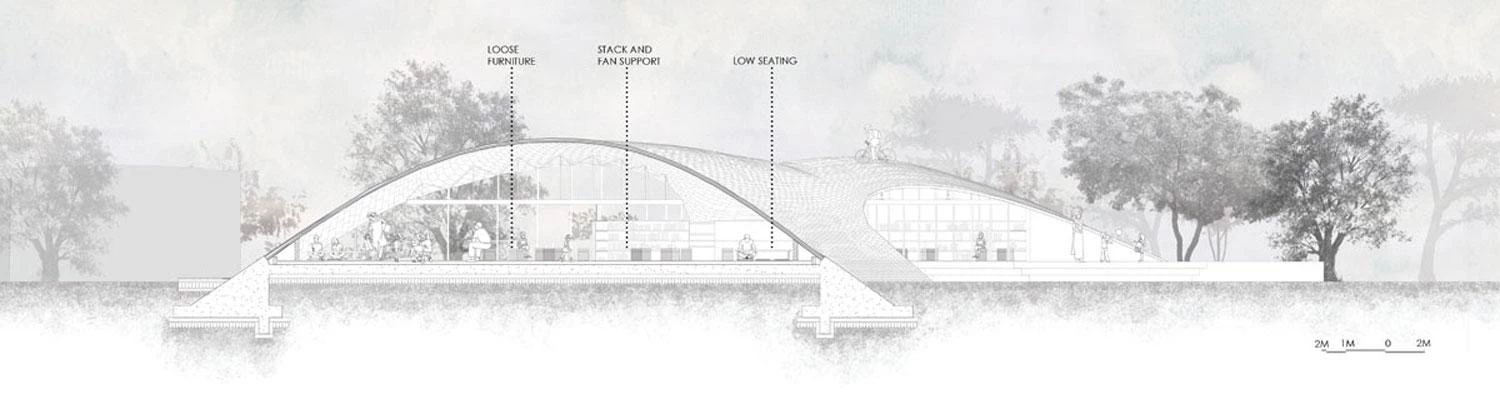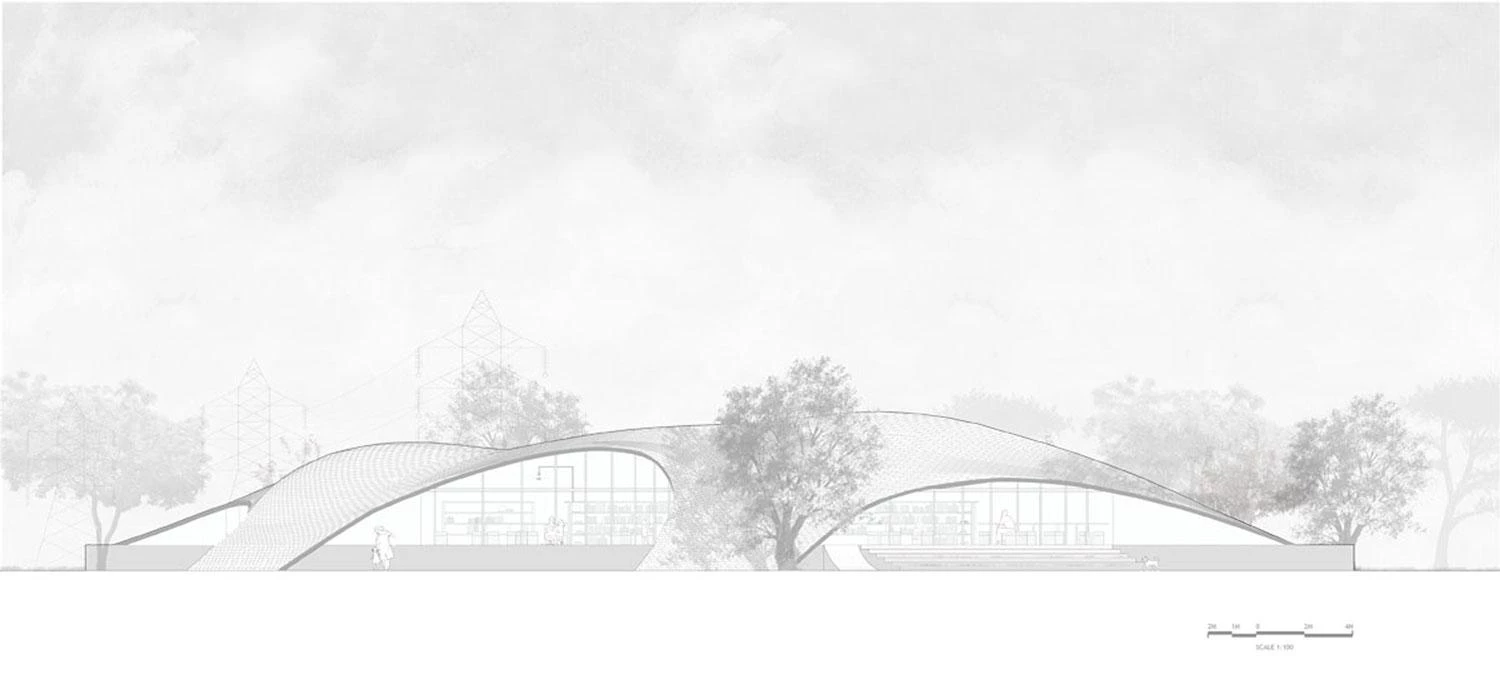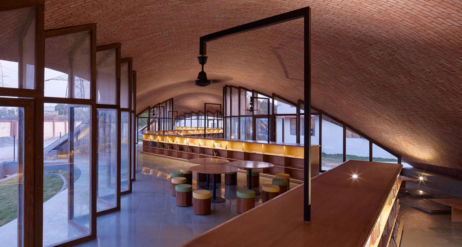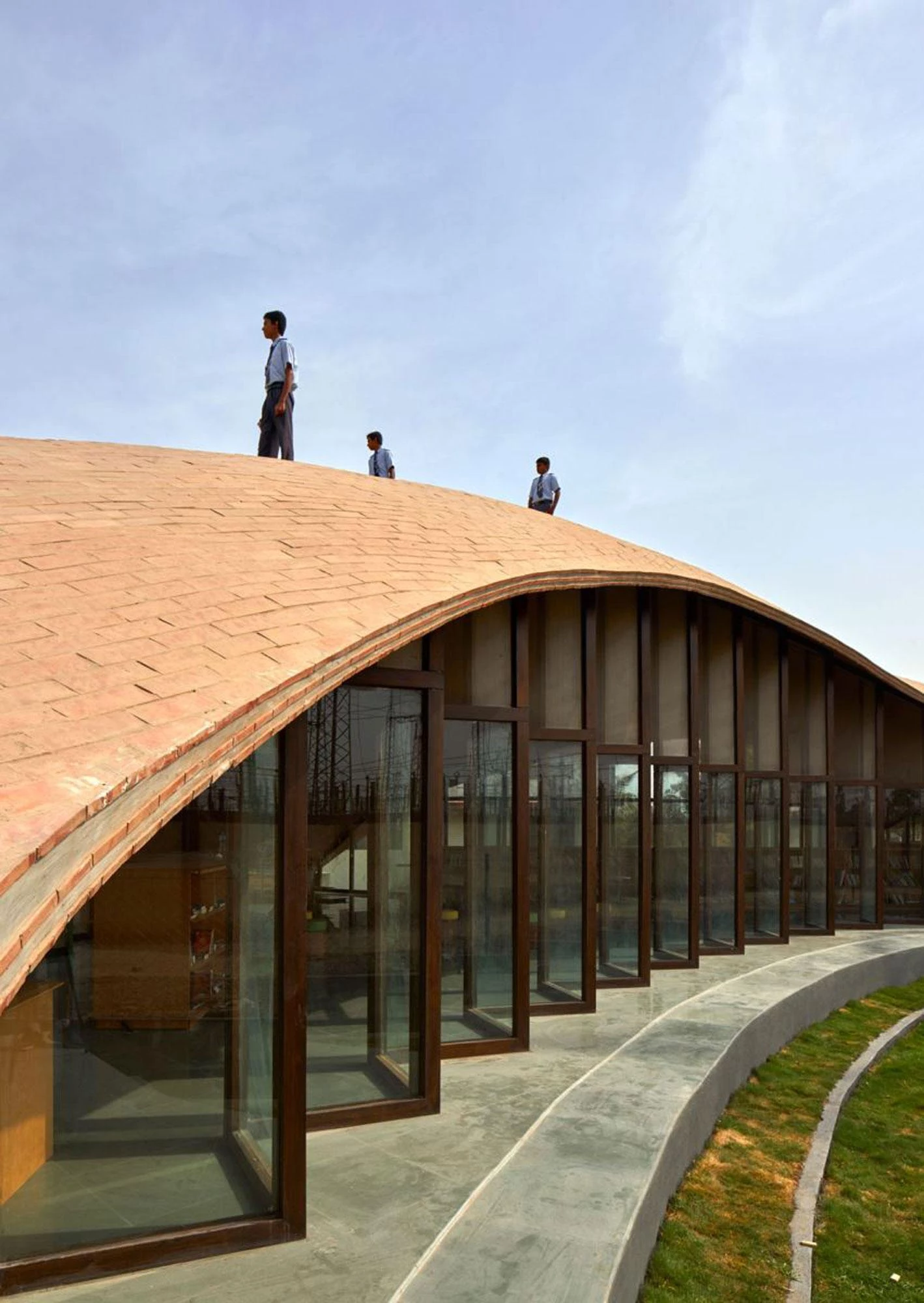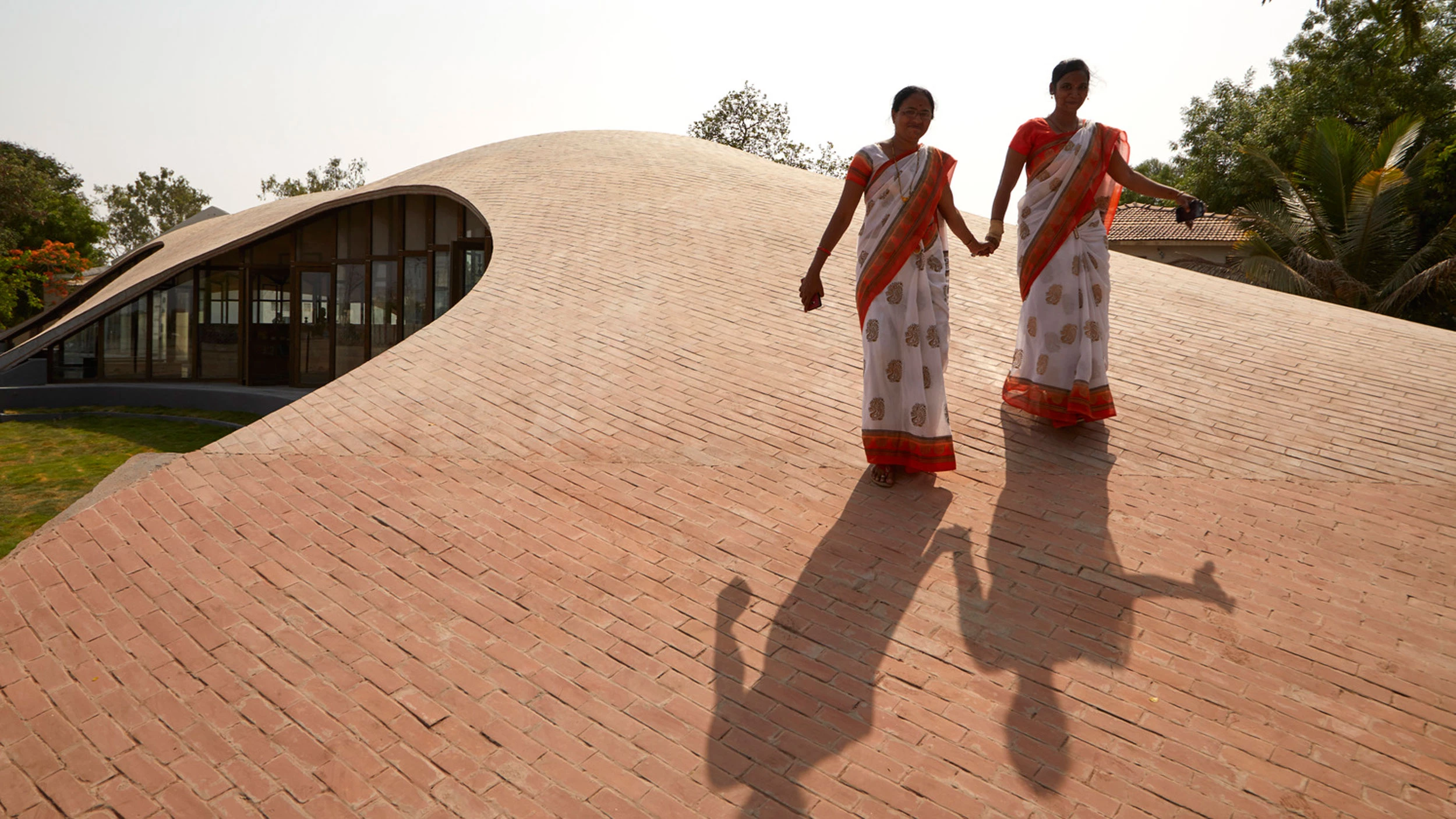sP+a, la firma de Bombay dirigida por Sameep Padora, amplía una pequeña biblioteca infantil para la escuela rural Sharda de Kopargaon, en el estado indio de Maharashtra. Su compleja cubierta ondulada está inspirada en las técnicas constructivas de las bóvedas de ladrillo realizadas por el español Rafael Guastavino (1842-1908) y el uruguayo Eladio Dieste (1917-2000). Además, las superficies curvas requeridas para conformar la cubierta fueron diseñadas utilizando el plug-in Rhino Vault —del programa de modelado en 3D Rhinoceros—, desarrollado por el Block Research Group (BRG) de la Escuela Politécnica Federal de Zúrich (ETH). Combinando el aprendizaje de diferentes épocas y ubicaciones geográficas, el resultado es una cubierta transitable de ladrillo de 44 metros de largo —formada por tres capas compuestas por piezas cerámicas de 32 milímetros de espesor unidas con mortero—, concebida como extensión del terreno y zona de juegos.