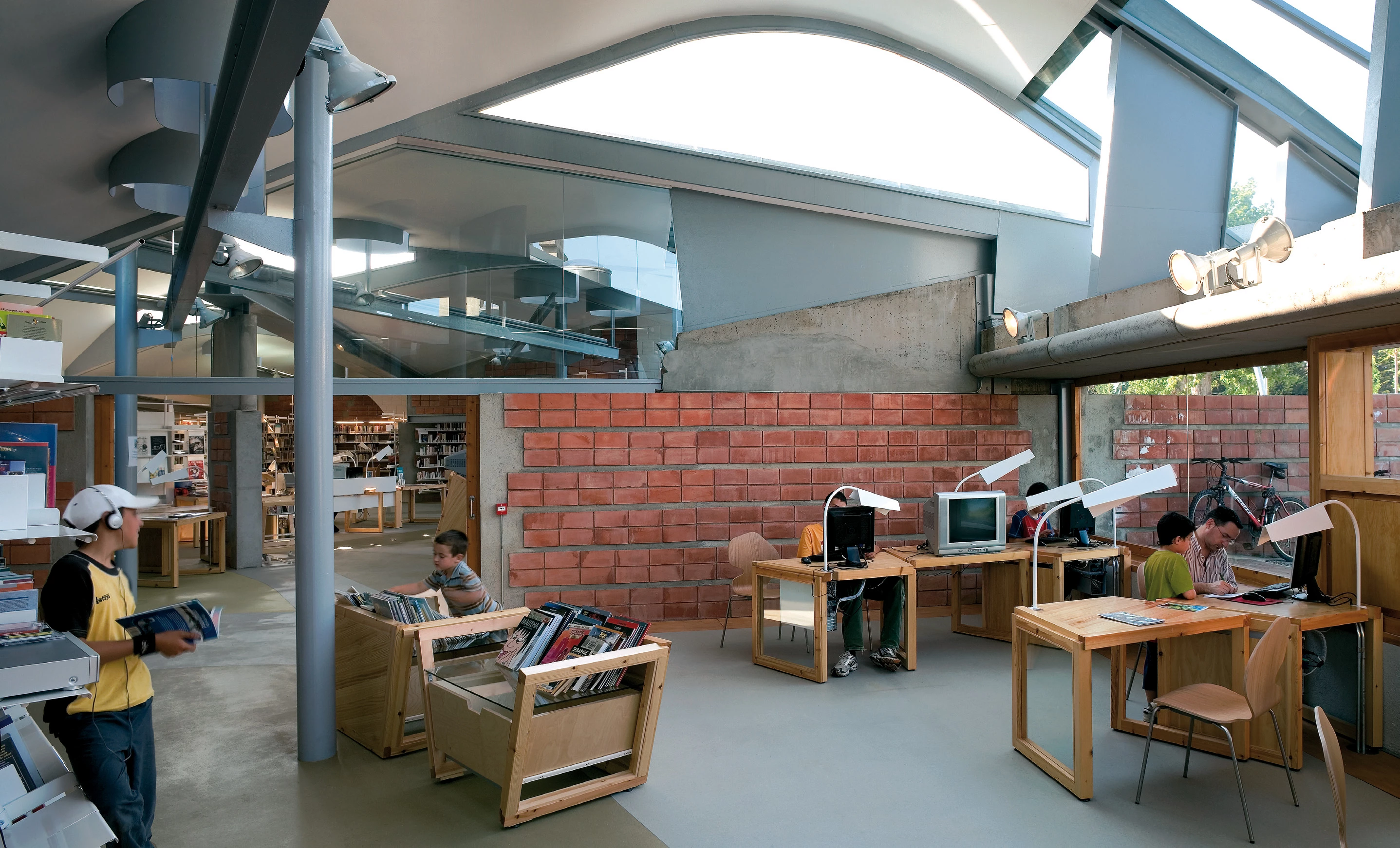 Semienterrada entre los árboles, la biblioteca busca integrarse en el entorno del parque ajardinado; las cubiertas de zinc dibujan una topografía de ondas metálicas que dialogan con las montañas próximas.