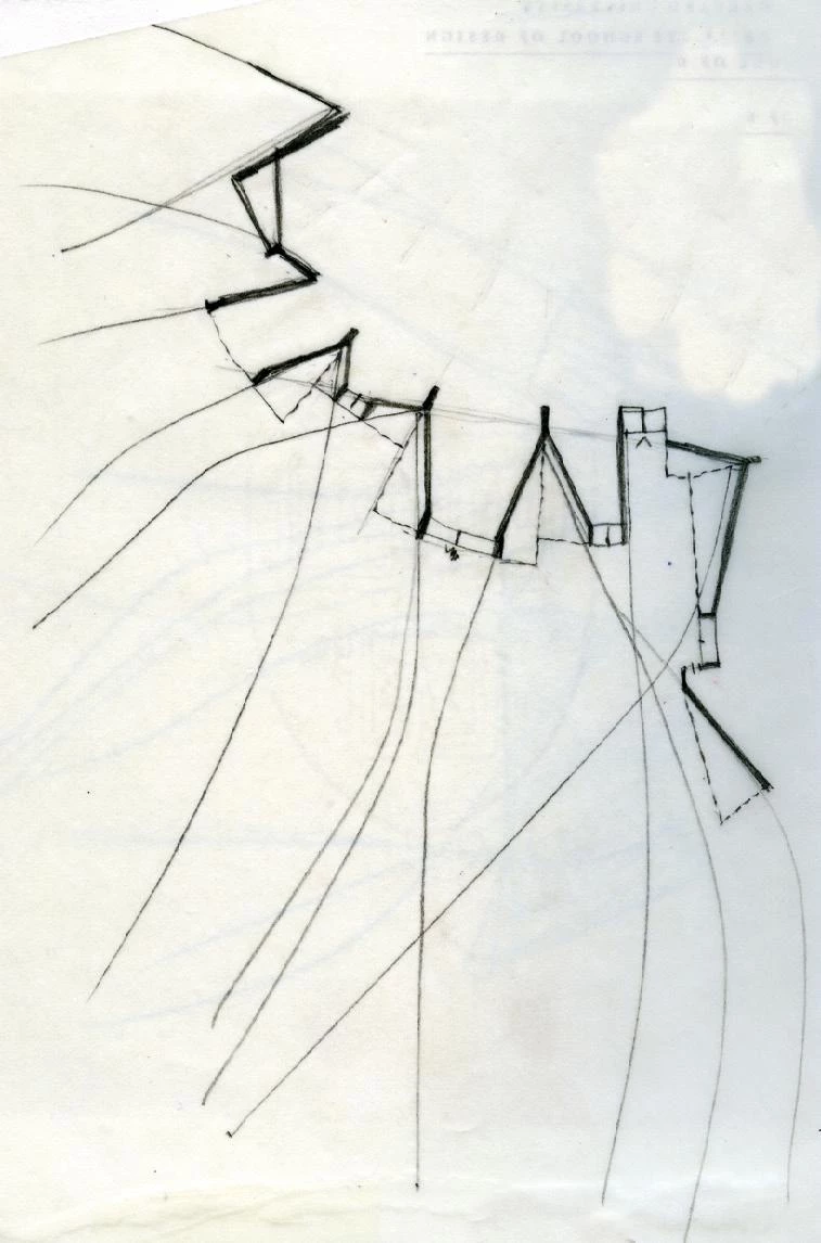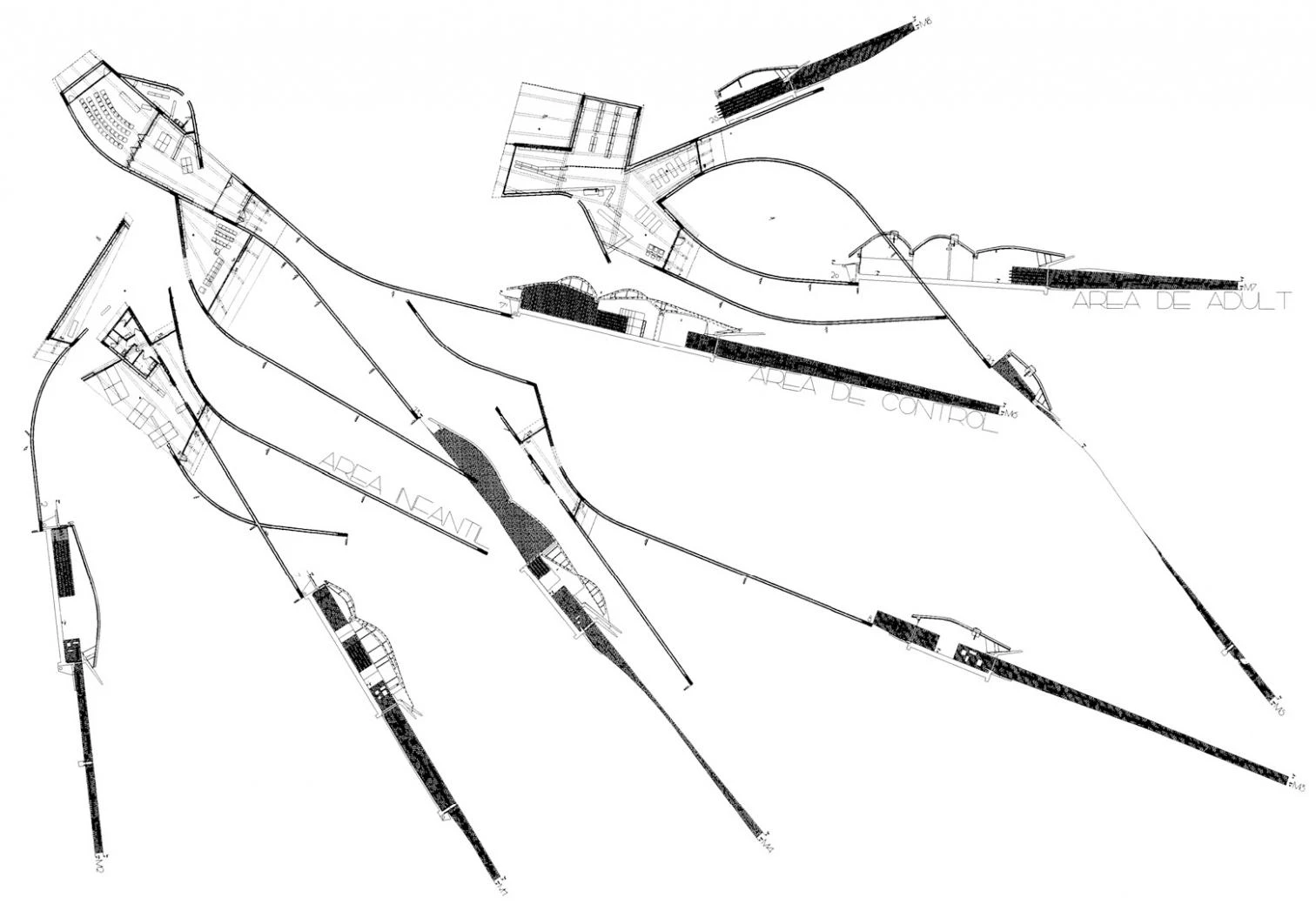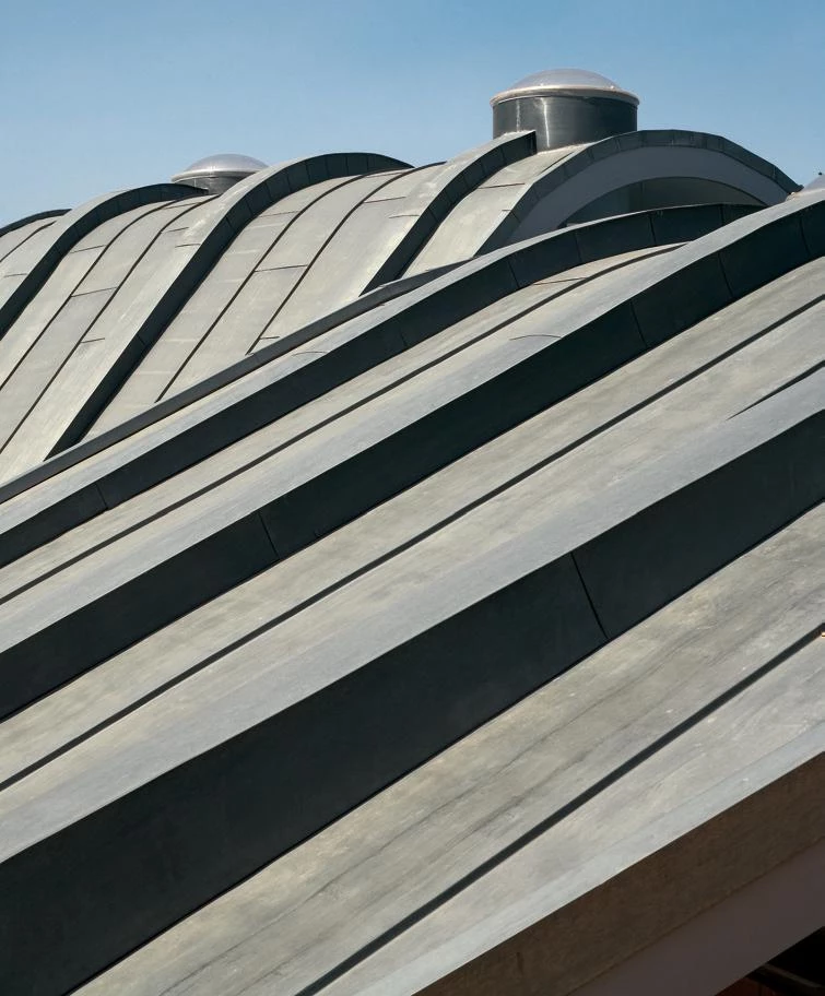 El edificio se construye semienterrado a un metro de profundidad, de manera que la ondulante cubierta de zinc se asimila al perfil de las montañas de la cordillera próxima, dibujando una topografía de dunas metálicas en medio del parque, mientras la fachada apenas se hace perceptible.