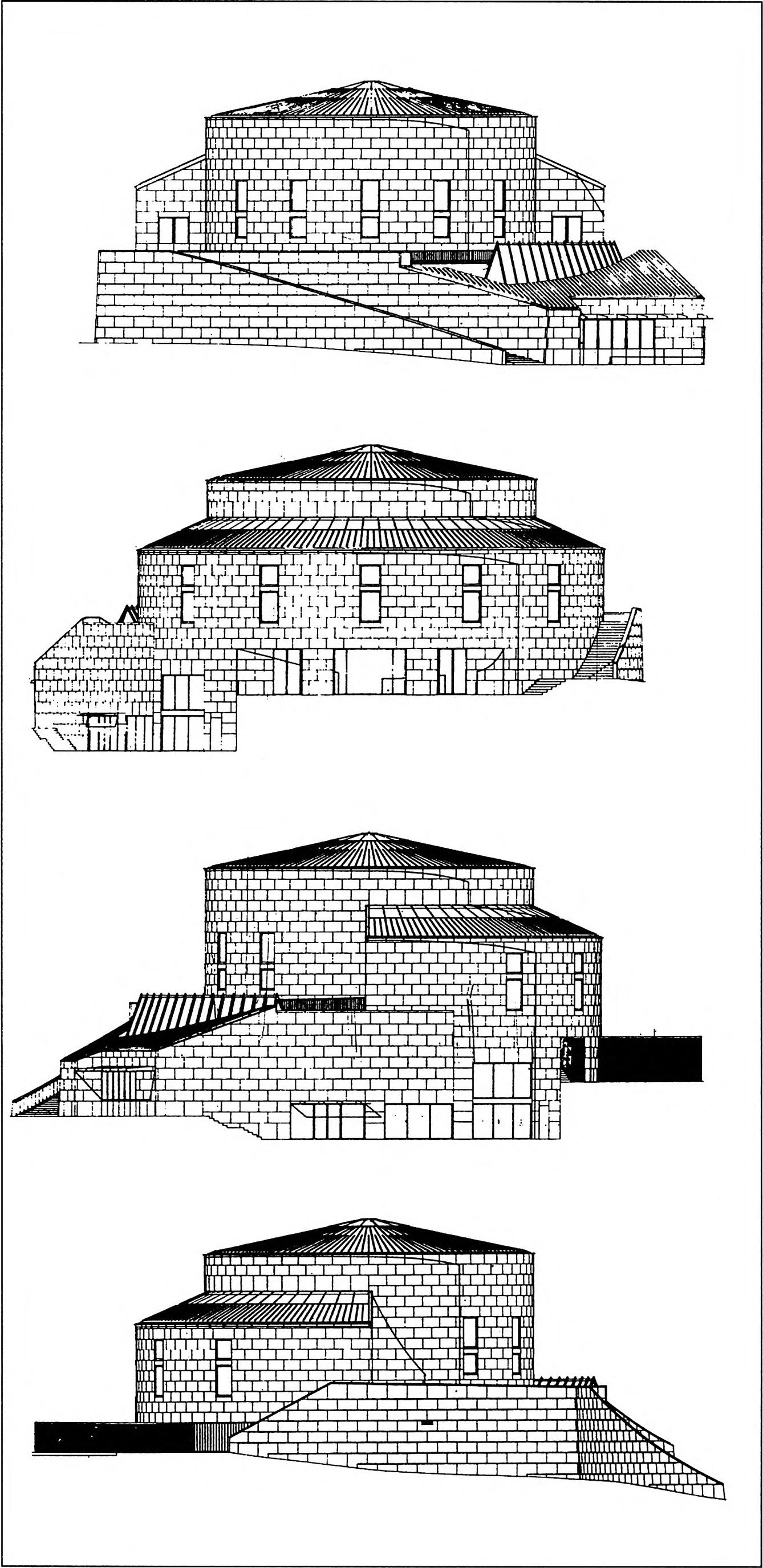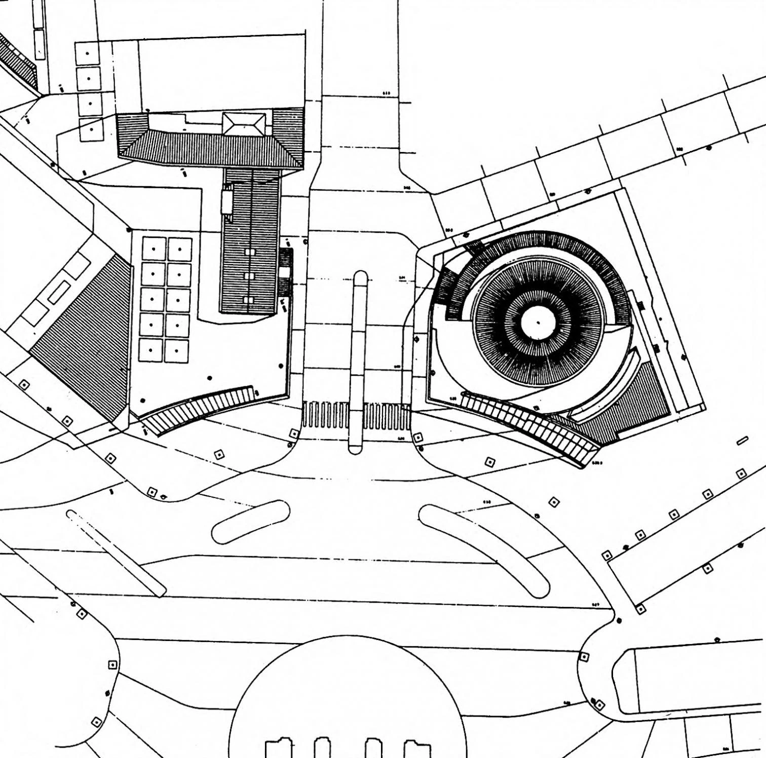 El equilibrio de volúmenes, el juego de llenos y vacíos, se integra en la conformación de un anillo de poca altura en torno a la Puerta, orientándose a ella en los límites de escala apropiados. El vacío de la plaza alta del otro lado de la calle Toledo dialoga con el lleno de la forma de tambor de la cúpula de la biblioteca. La tensión en la presencia simultanea de unos efectos volumétricos de concavidad y convexidad son esenciales en la experiencia espacial de la glorieta.