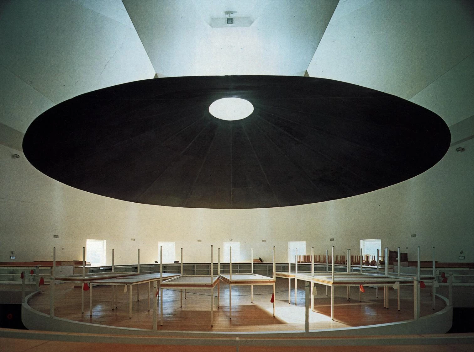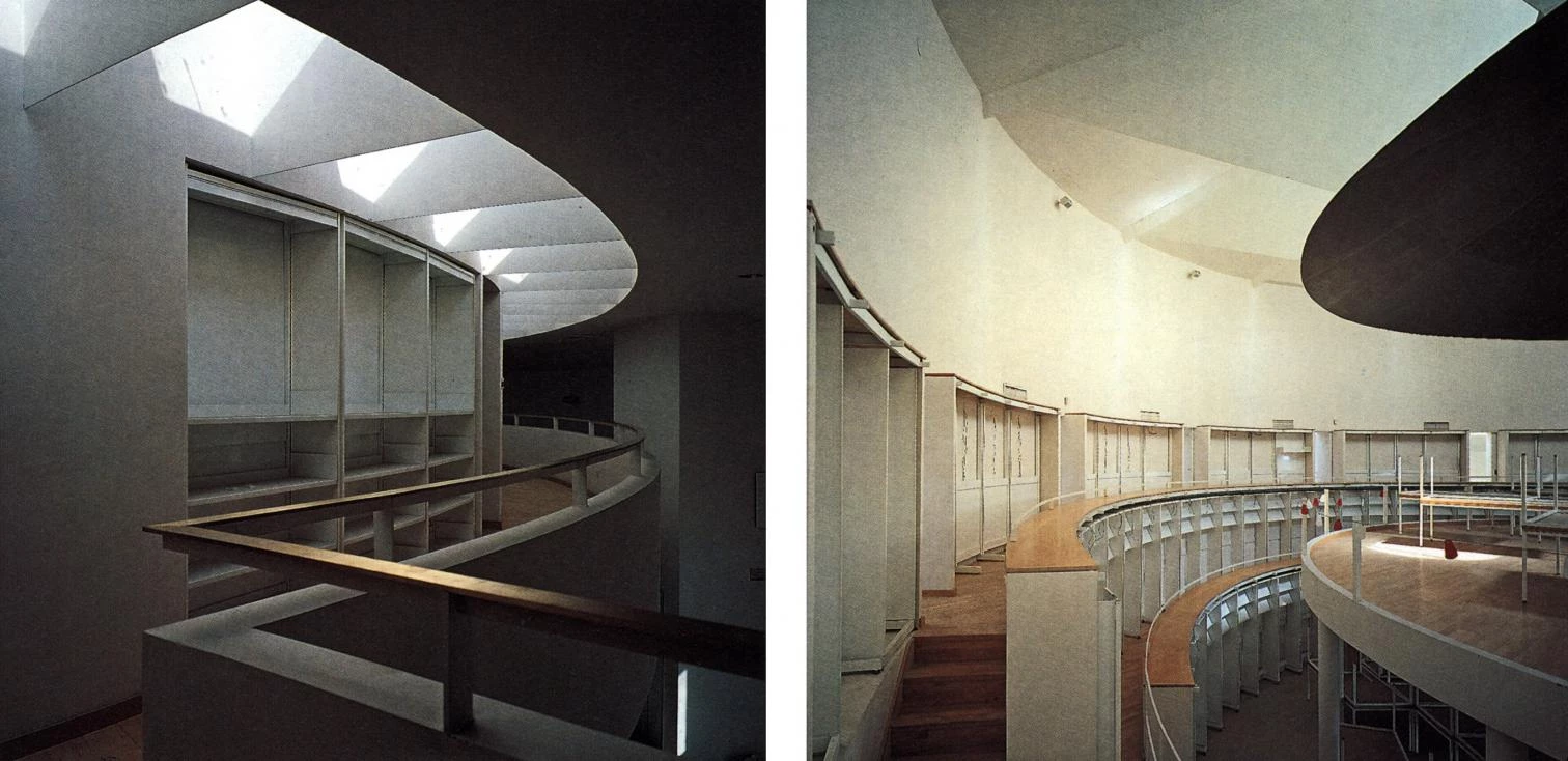En la sala de lectura, la iluminación natural cumple una función esencial. Las estanterías ocupan la franja periférica, y sobre la plataforma central flota la bóveda cónica.