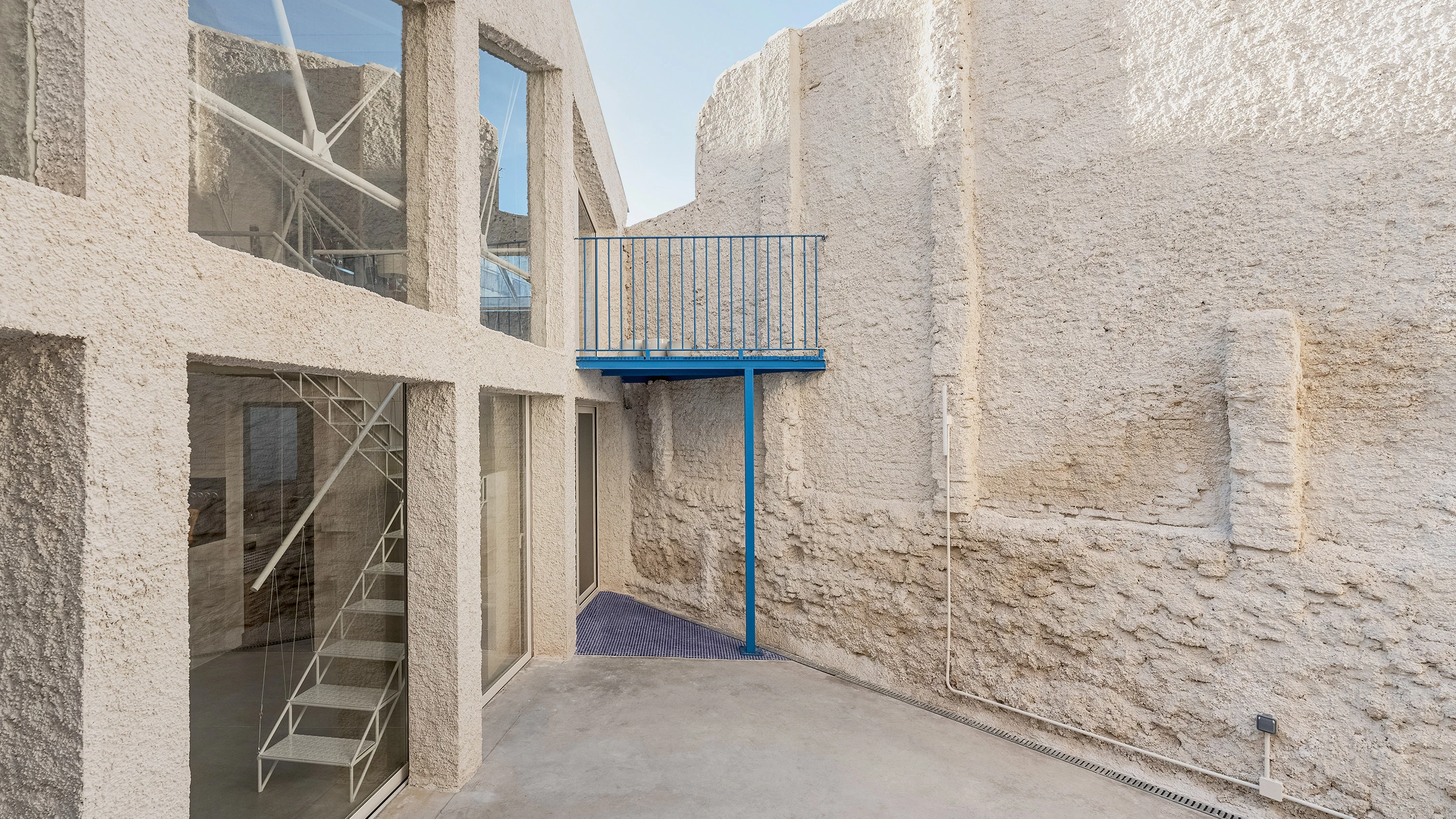 A la fábrica de bloques de hormigón blanco se adosan distintas funciones de la casa, como la cocina, varios compartimentos de almacenaje, el acceso a los dormitorios o el rellano de la escalera que conduce a un estudio en altillo.