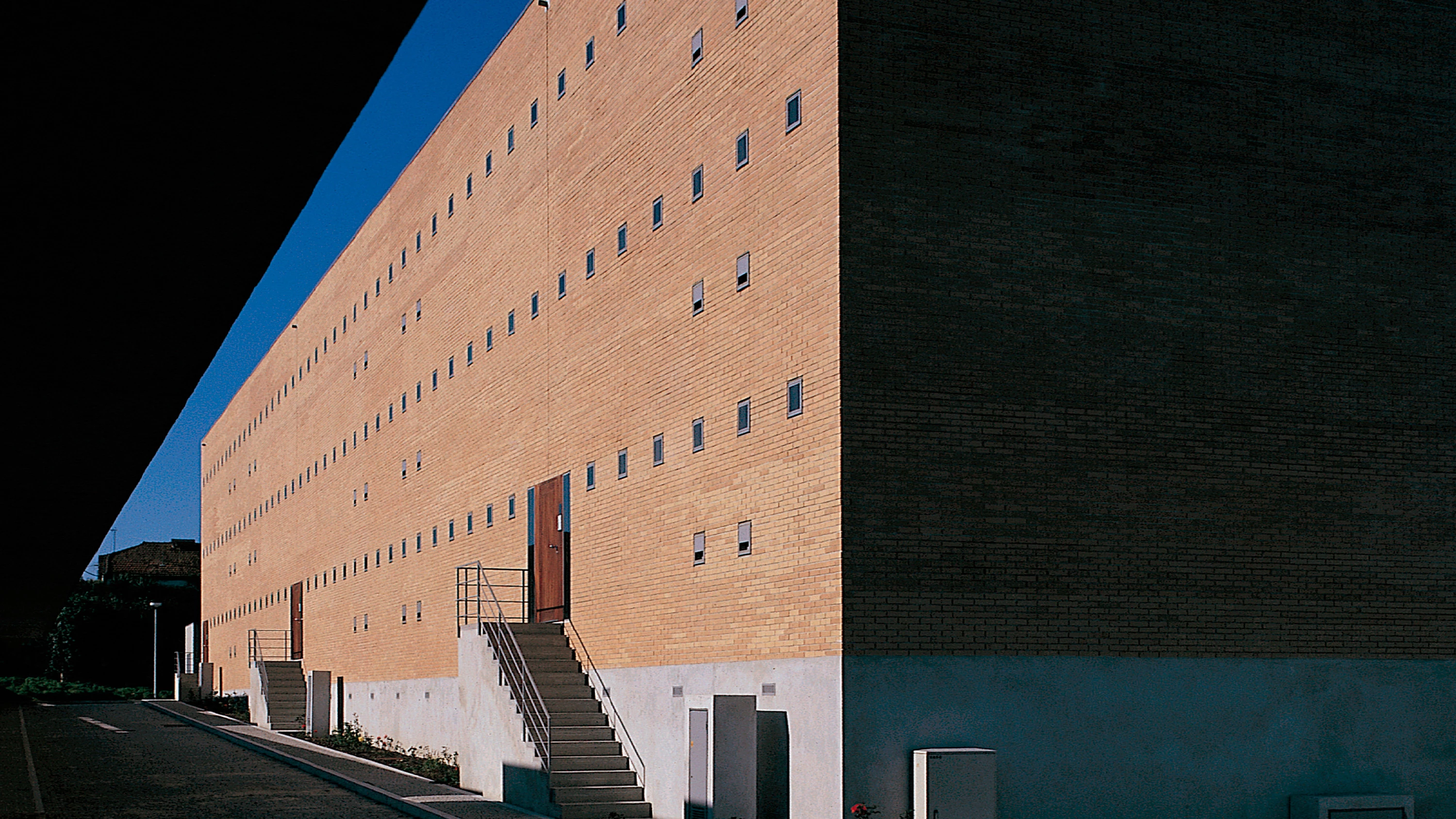 Doce viviendas de dos dormitorios y tres apartamentos de uno se alinean en este bloque de crujía estrecha que reposa sobre un zócalo de hormigón. La estricta geometría del bloque se prolonga en la organización de la planta, que agrupa cocinas, baños y vestíbulos en una banda estrecha paralela al alzado sureste, dejando un vano más profundo de dormitorios y estancias en la fachada noroeste. Esta articulación de la planta se hace explícita en los paramentos lisos que cierran el prisma, una envolvente de ladrillo que en el alzado correspondiente a cocinas y baños aparece perforada por una retícula de pequeños huecos cuadrados que doblan su alineación en la zona correspondiente a los tendederos. El frente opuesto —primera imagen del edificio desde la entrada al recinto— se rasga por el contrario mediante una banda de ventanas horizontales y continuas que abren el espacio doméstico al entorno, sin transgredir la modulación a la que se confía la contundencia de la propuesta.