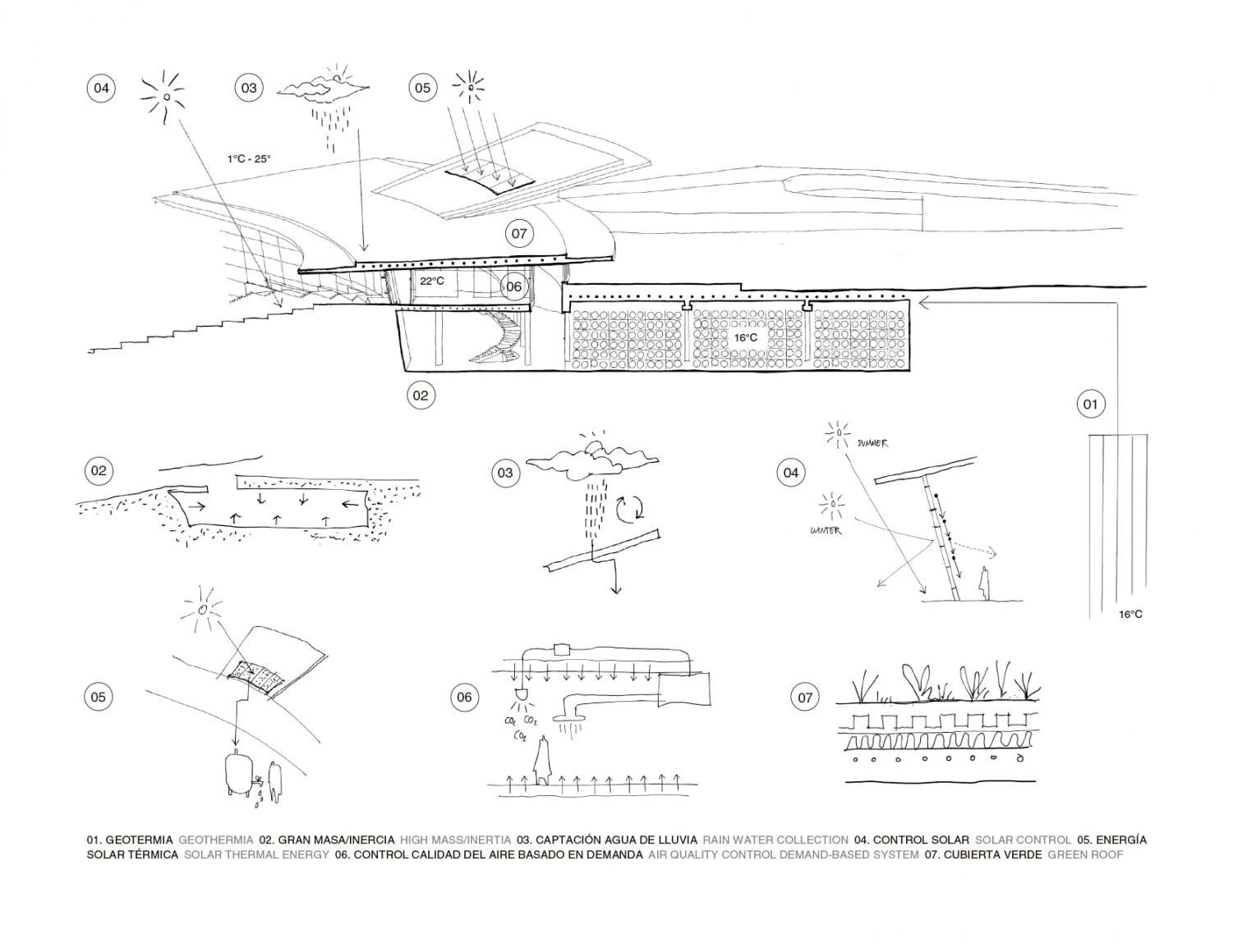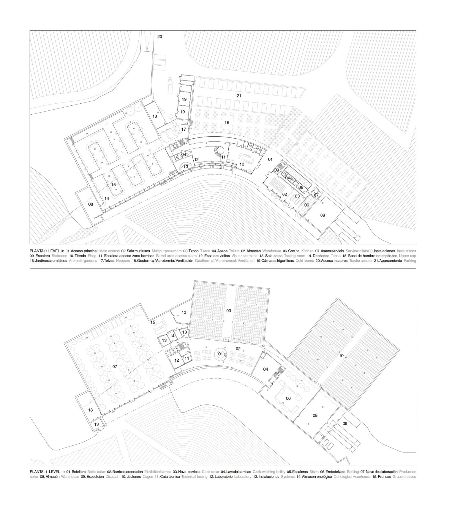 Este proyecto se inspira en la bodega tradicional de la zona, cuya estructura organizativo-productiva es altamente eficaz y sostenible: en planta alta se dispone la vivienda, en planta baja la recepción de la uva y, encastrada en el terreno, la nave de fermentación.