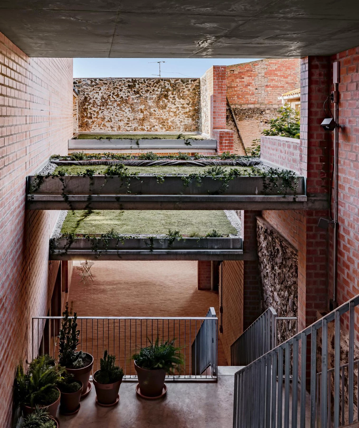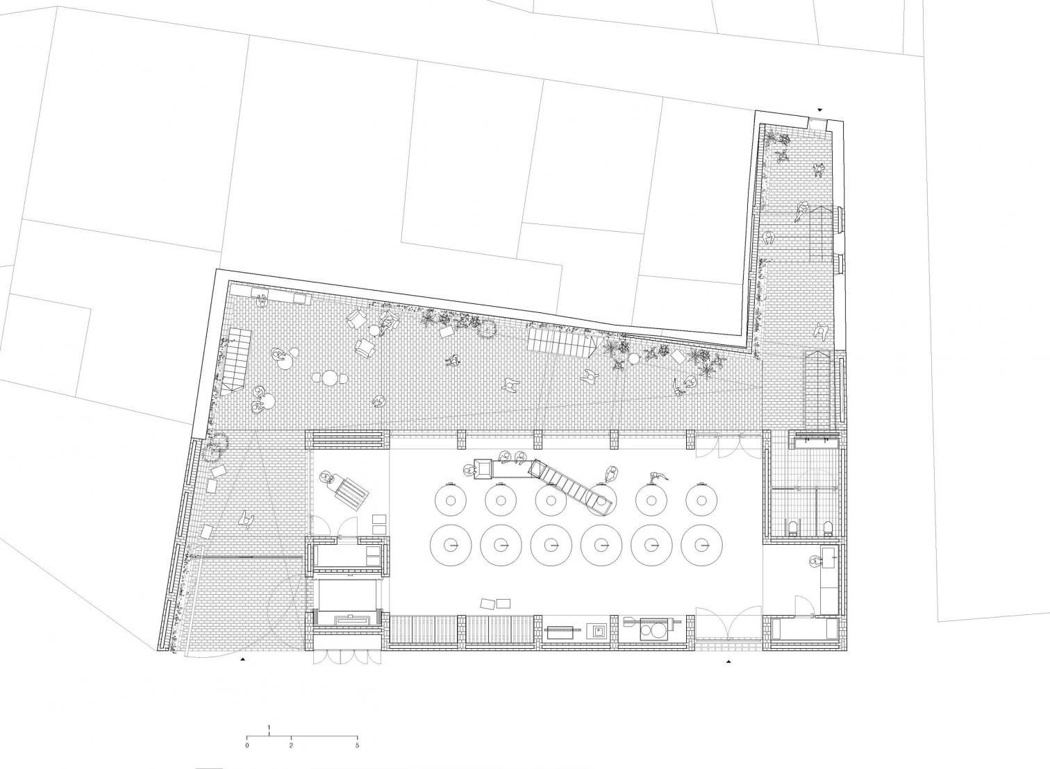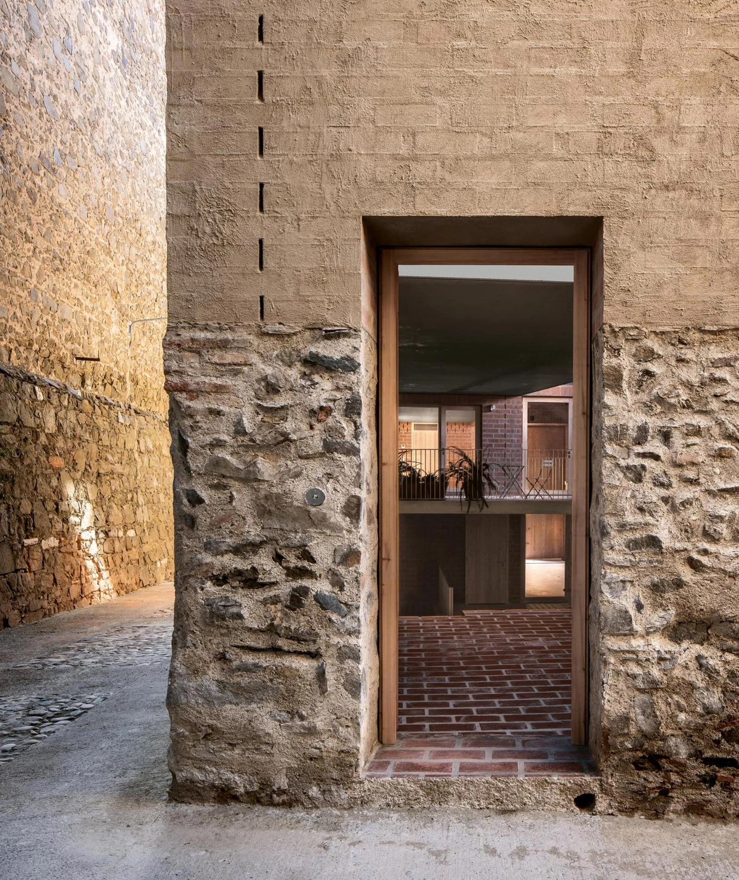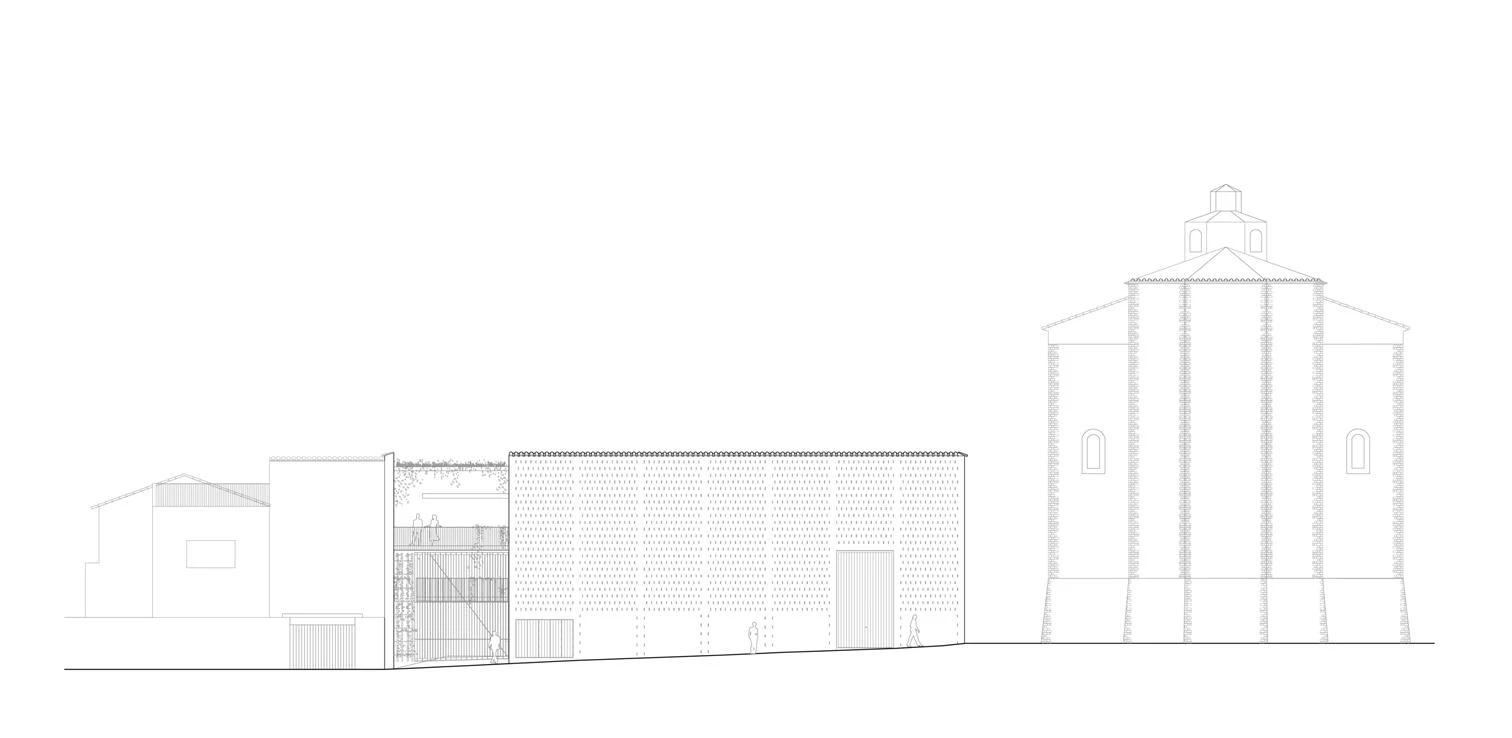 Con muros de hasta 1,75 metros de espesor, la gran nave de producción de triple altura y planta rectangular está rodeada por un espacio en forma de Z. Este se extiende siguiendo el trazado irregular de un muro preexistente de piedra, un antiguo frontón que alcanza 10 metros de altura y hace de medianera. Un sistema de muros cerámicos de carga, con diferentes capas entre pilastras que crean cámaras para la circulación del aire, refrigeran el edificio. En el perímetro de la planta baja de la nave se abren una serie de huecos, siguiendo el ritmo de las pilastras estructurales de los muros. Con un recorrido en pendiente suave que conecta el acceso y la nave, el pasaje presenta una sucesión de cubiertas a diferentes alturas combinadas con una serie de forjados que actúan como rellanos entre escaleras.