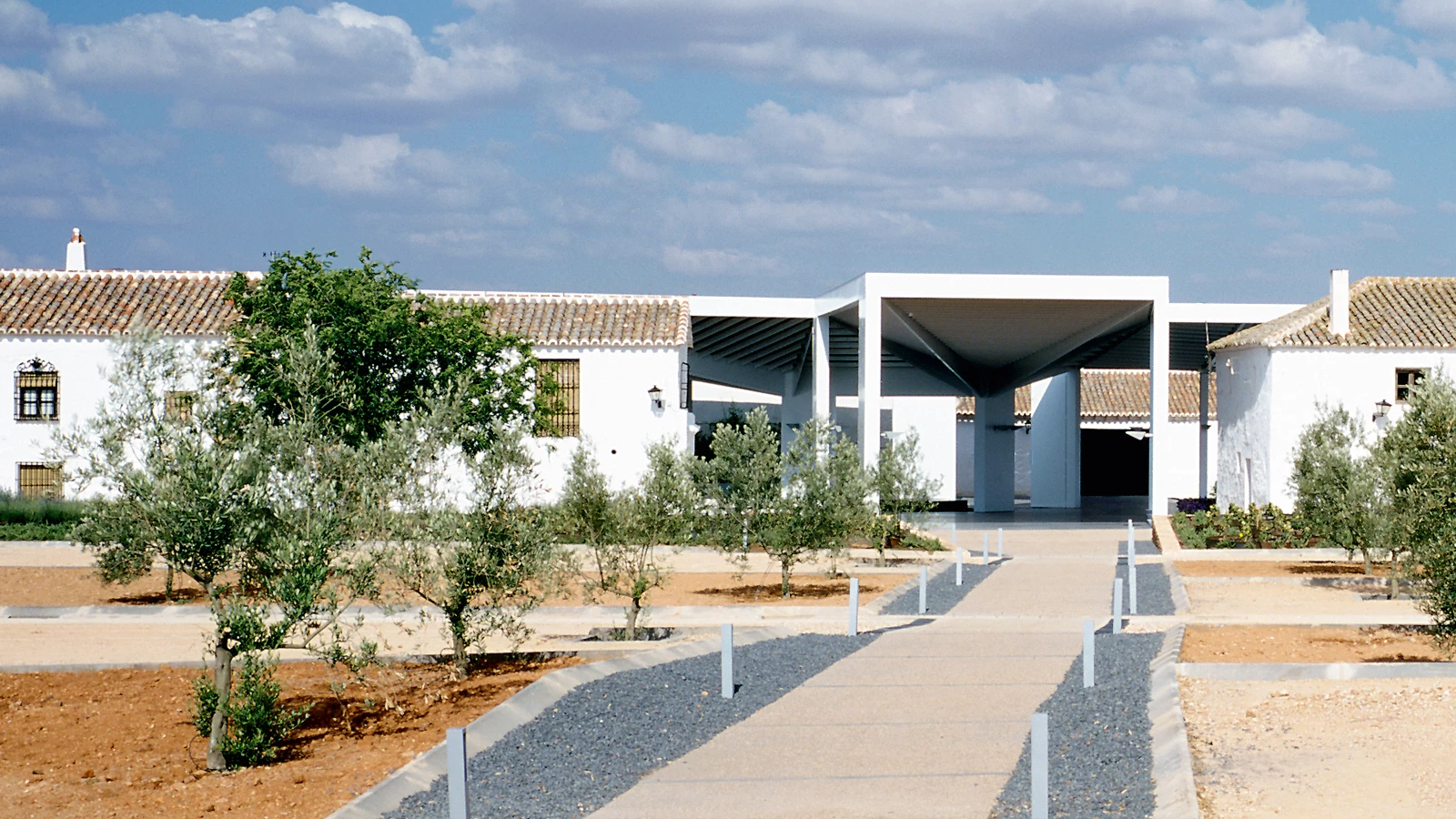 En un cortijo del siglo XVIII, única construcción en un paisaje marcado por el trazado regular de viñedos y olivares que precisaba ser adaptado para nuevos usos enológicos, se desliza en el gran patio una nueva estructura en forma de estrella irregular de cuatro brazos. Encontrar una solución para los nuevos usos implica entreverar la arquitectura rural del cortijo y la industrial de la bodega con la ampliación, que quiere dar una imagen unitaria al conjunto.