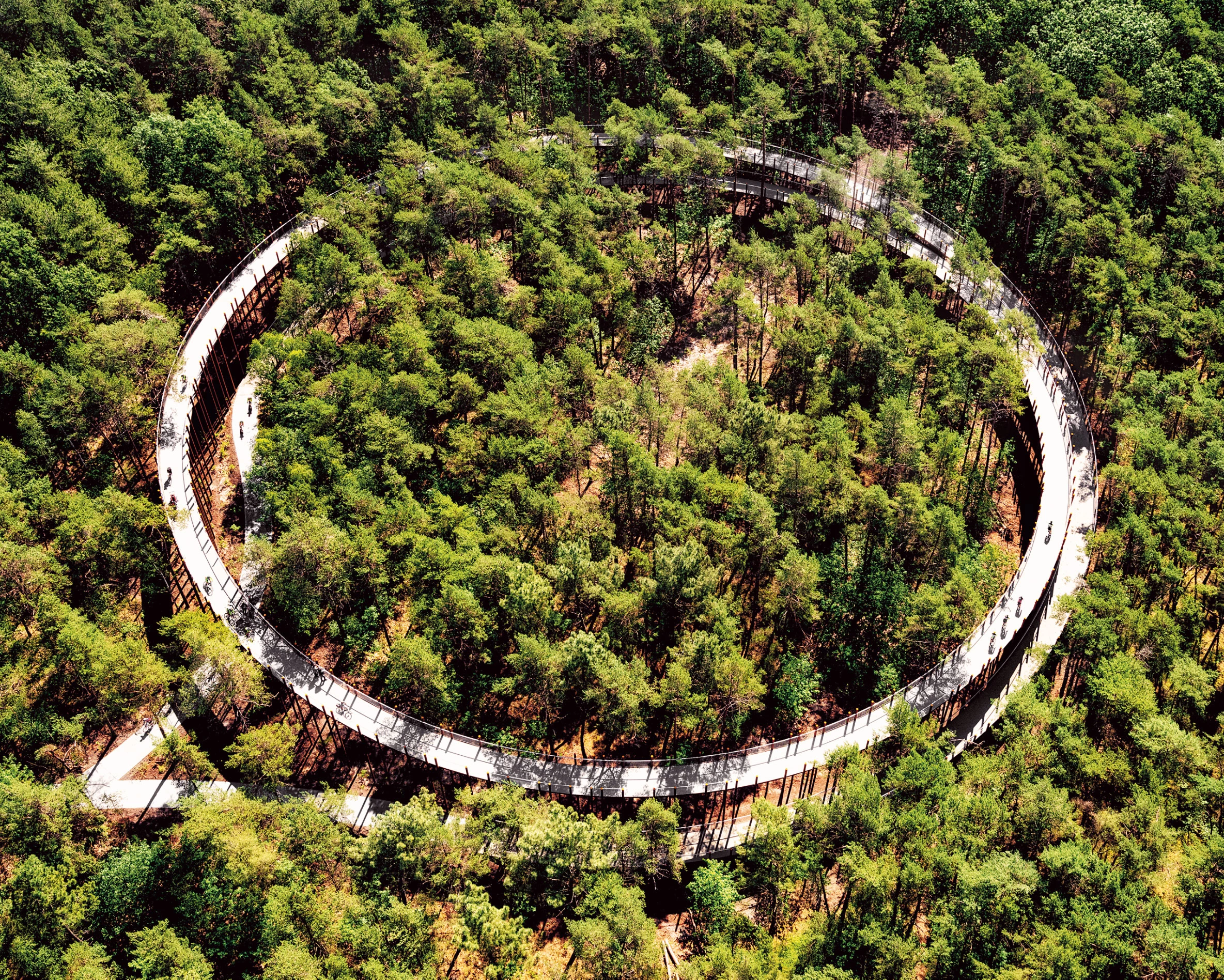Bosland es el mayor bosque de la región de Flandes, en Bélgica, y en su interior se ha levantado esta pasarela peatonal fundida con el paisaje pero distinta a él, cuyo objetivo es procurar una visión inédita y dinámica de los árboles. Esta experiencia de exploración tiene lugar a lo largo de un anillo de setecientos metros de perímetro y cien de diámetro.