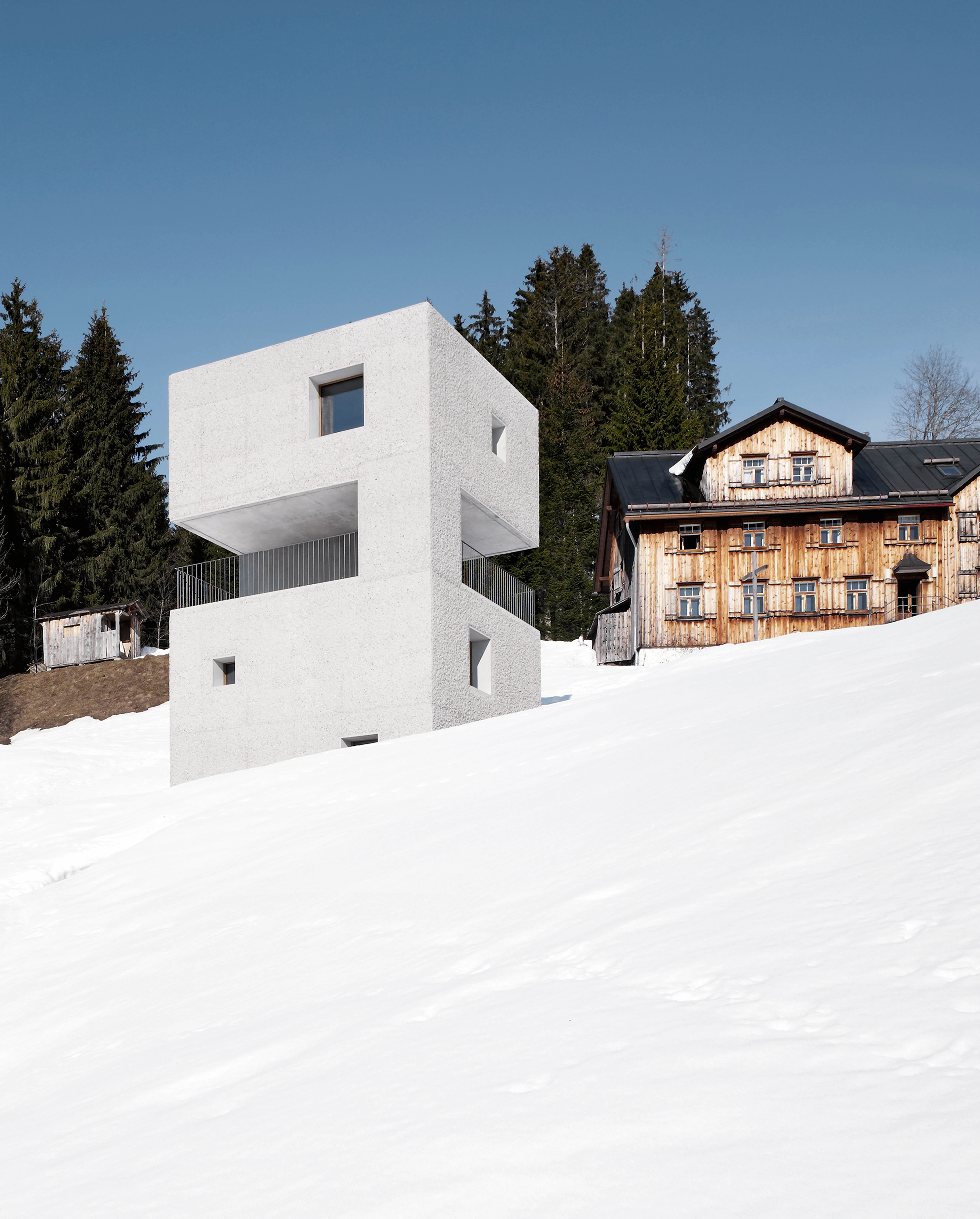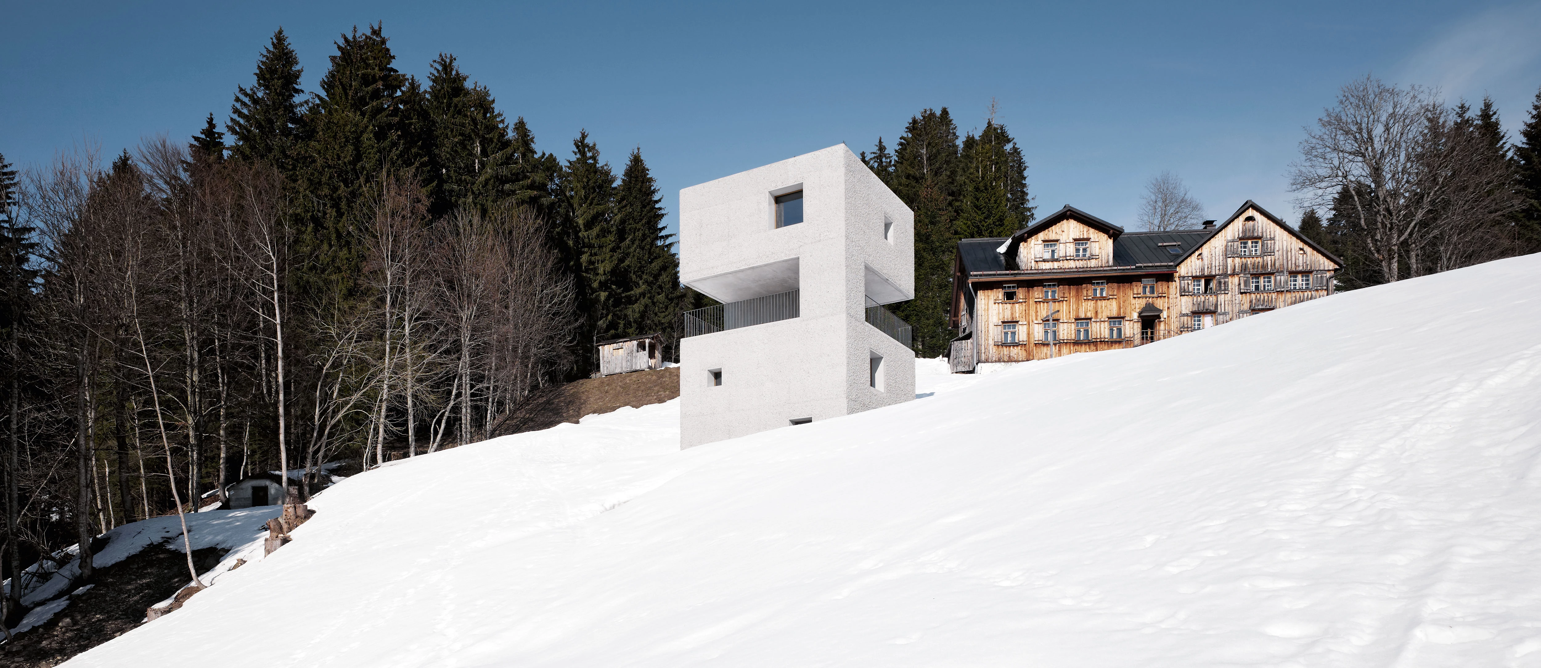 Sobre una colina, frente a un bosque y al pie de una gran construcción vernácula de madera, se levanta en la localidad austriaca de Laterns una casa de geometría rotunda y blanca. Semejante a un témpano de hielo, pero evocador también de la imagen de una torre defensiva o una fortaleza, el edificio consta de cuatro plantas apiladas y conectadas mediante una escalera en espiral. El acceso se produce a una cota intermedia, a través de varios escalones volados que llevan a una plataforma abierta, estupendo mirador para contemplar el paisaje. Desde ahí, el programa se desarrolla hacia abajo con dos plantas dedicadas a habitaciones, y hacia arriba con otra planta más donde se disponen las zonas de estar.