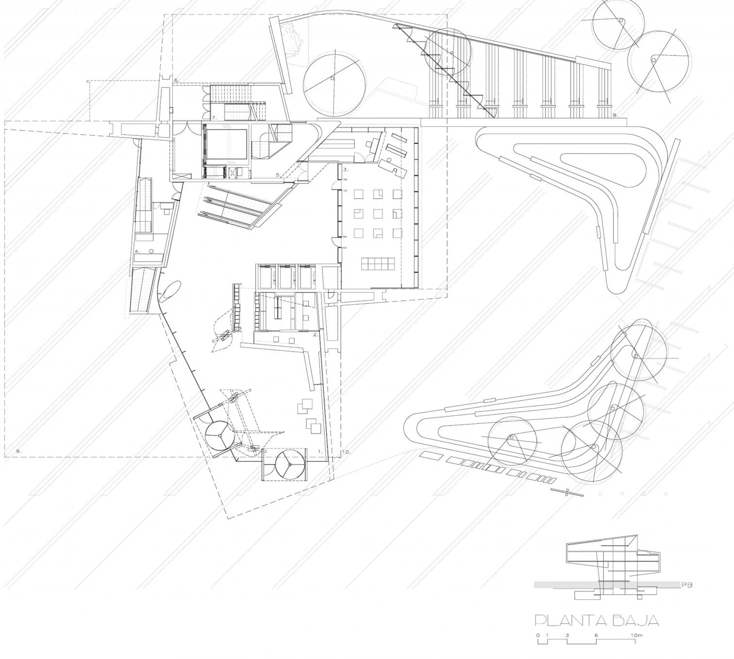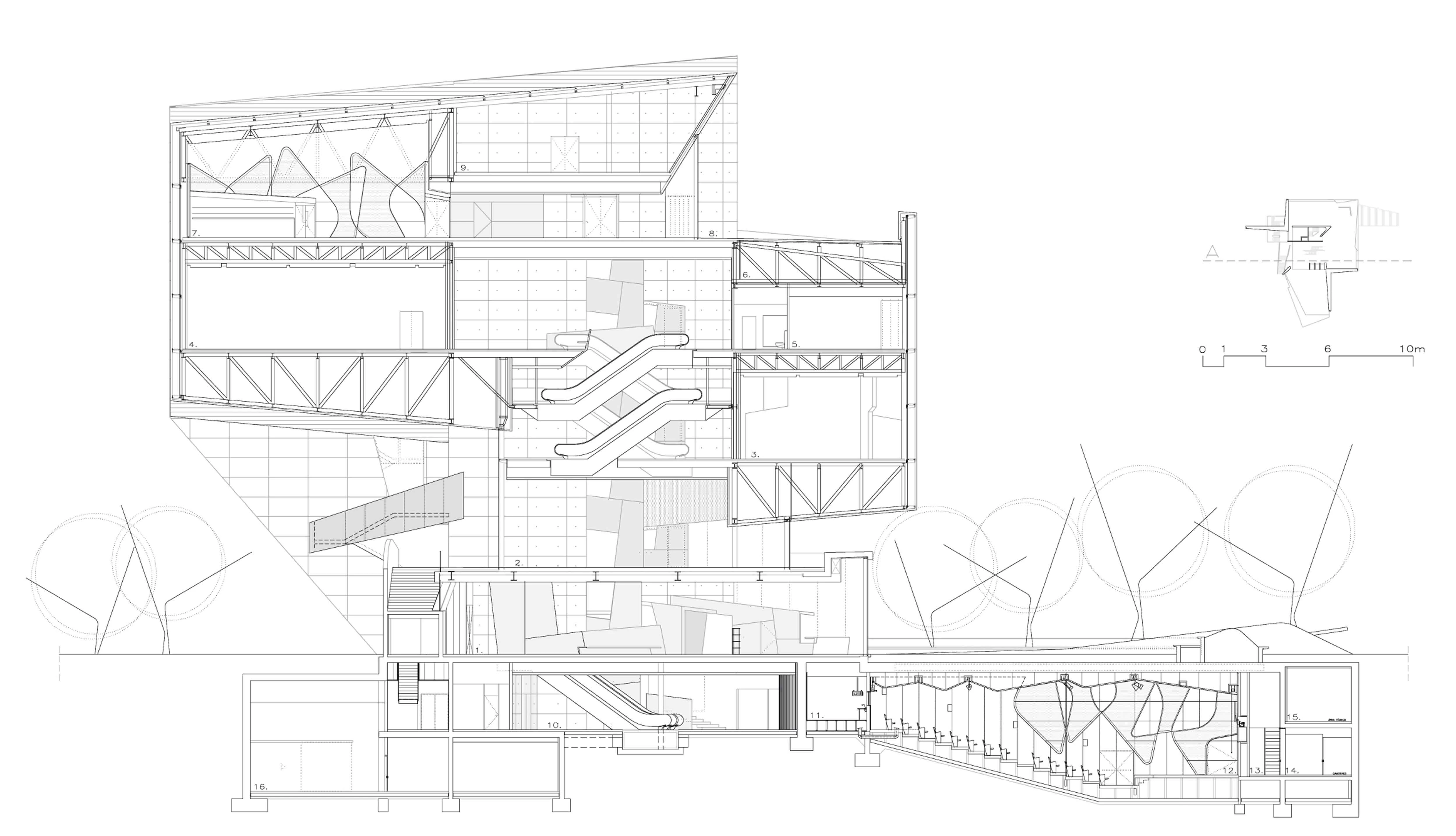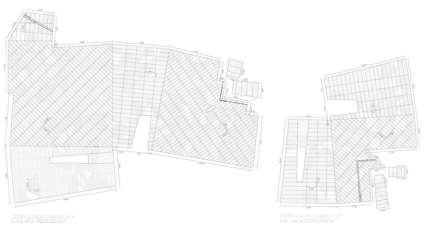 En respuesta a ese doble objetivo, el proyecto eleva las salas para liberar con ello la planta baja y situar allí las partes más abiertas y transparentes del programa; el lobby y la tienda. La intención es generar espacio público, hacer que el parque llegue a la ciudad pasando por debajo del edificio: un espacio que por la noche se ilumina mostrando dibujos conseguidos perforando la chapa, que esconde además la estructura que soporta las salas elevadas. Un jardín semienterrado se sitúa bajo la sala para dar evacuación al auditorio, pudiéndose entender también como antesala y zona de catering al aire libre. Así, el auditorio, situado en el subsuelo y accesible desde el lobby, se conecta directamente a la ciudad a través de este jardín. Las dos salas suspendidas se enfrentan a niveles diferentes, de forma que, al salir de una de ellas, la ciudad sea visible por debajo de la otra. Las conexiones entre salas se resuelven con escaleras mecánicas y recorridos que ofrecen vistas lejanas: zonas de transición que funcionan como espacios de relajación y de descompresión entre una exposición y la siguiente. En lo más alto del edificio y con vistas sobre la ciudad se sitúan la cafetería y el restaurante. En el lado contrario, por la diferencia de niveles entre salas, se genera una terraza bar que, en continuidad con el restaurante interior, ofrece vistas hacia el meandro de Ranillas y el recinto de la Expo.