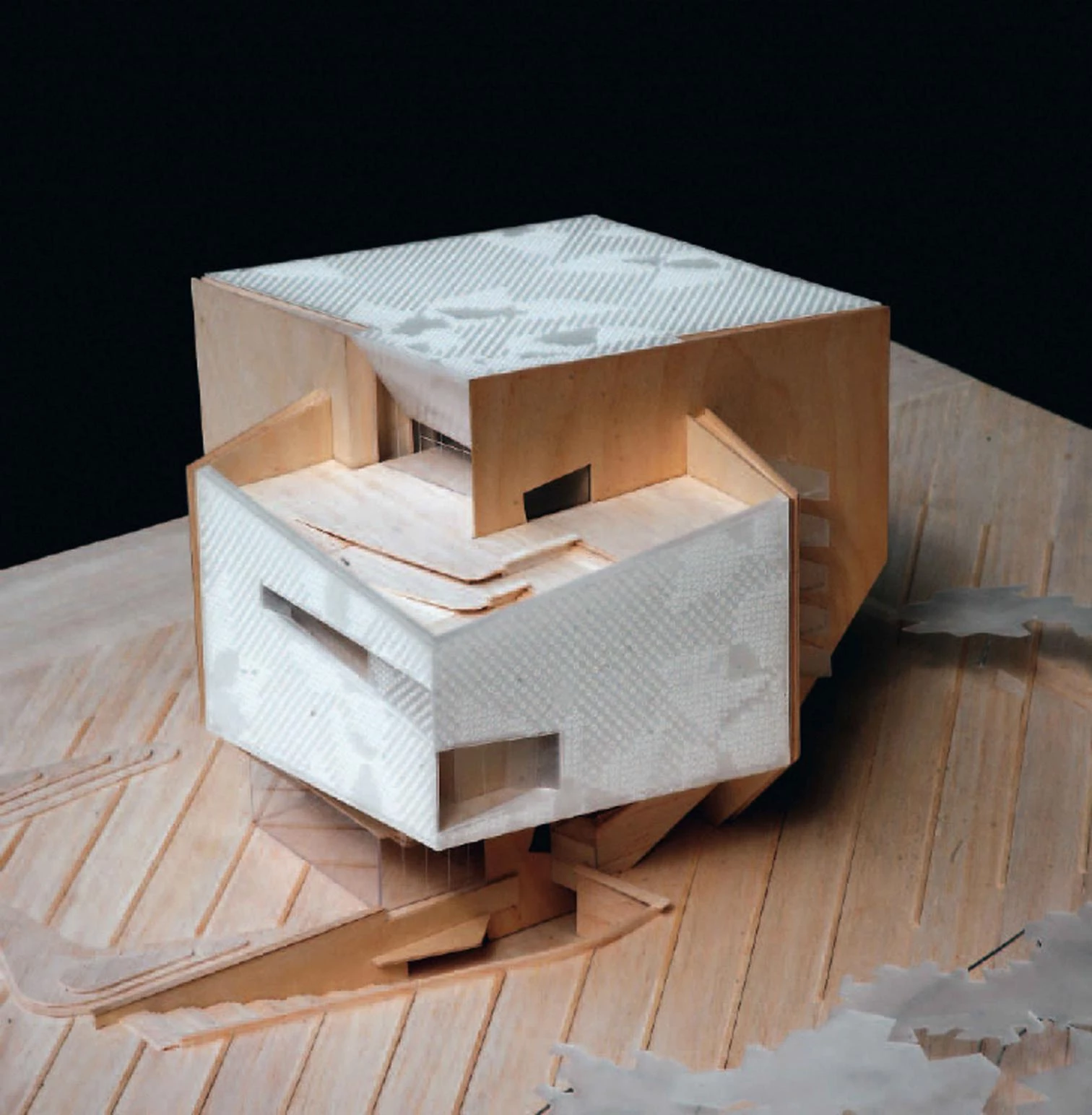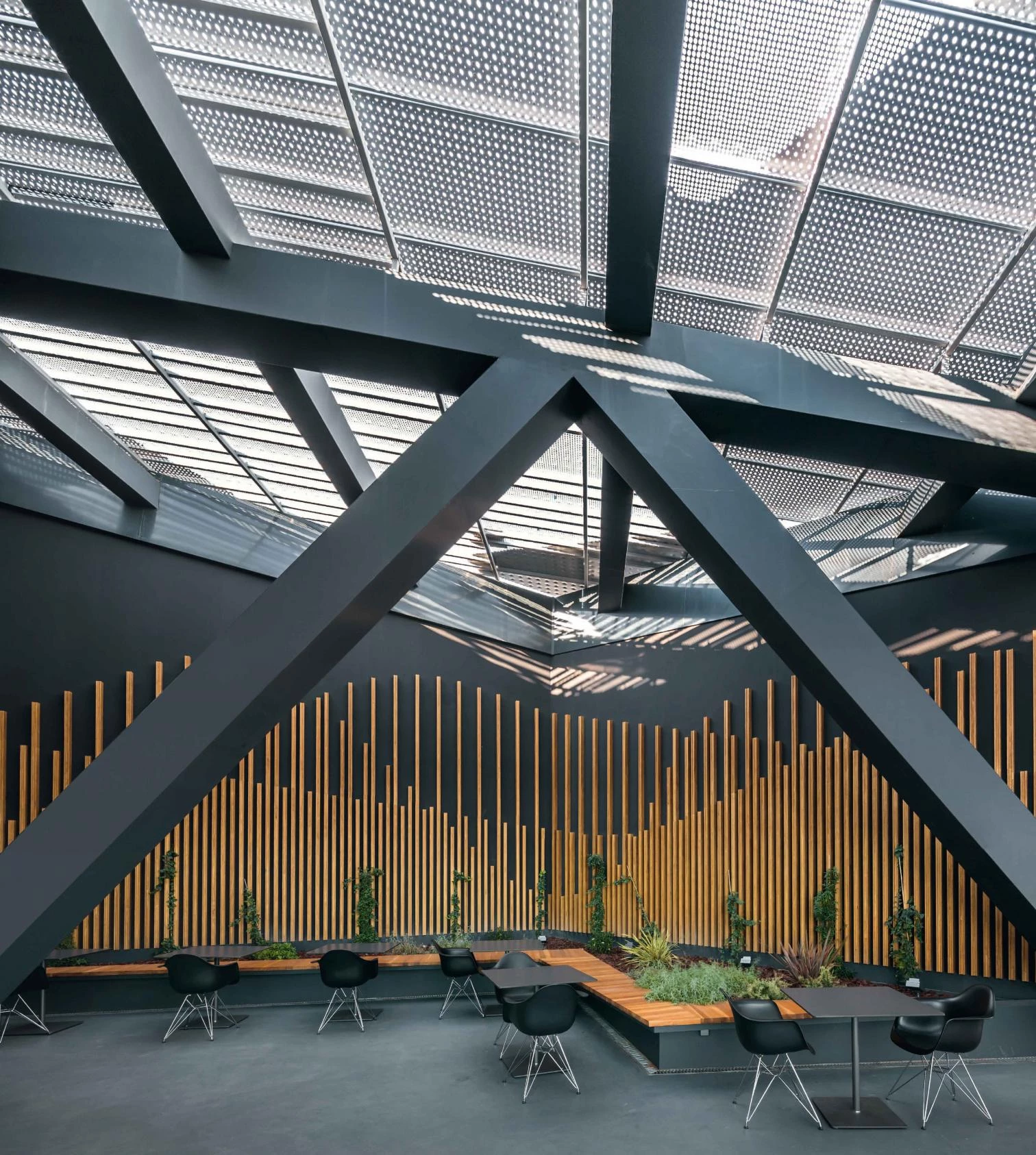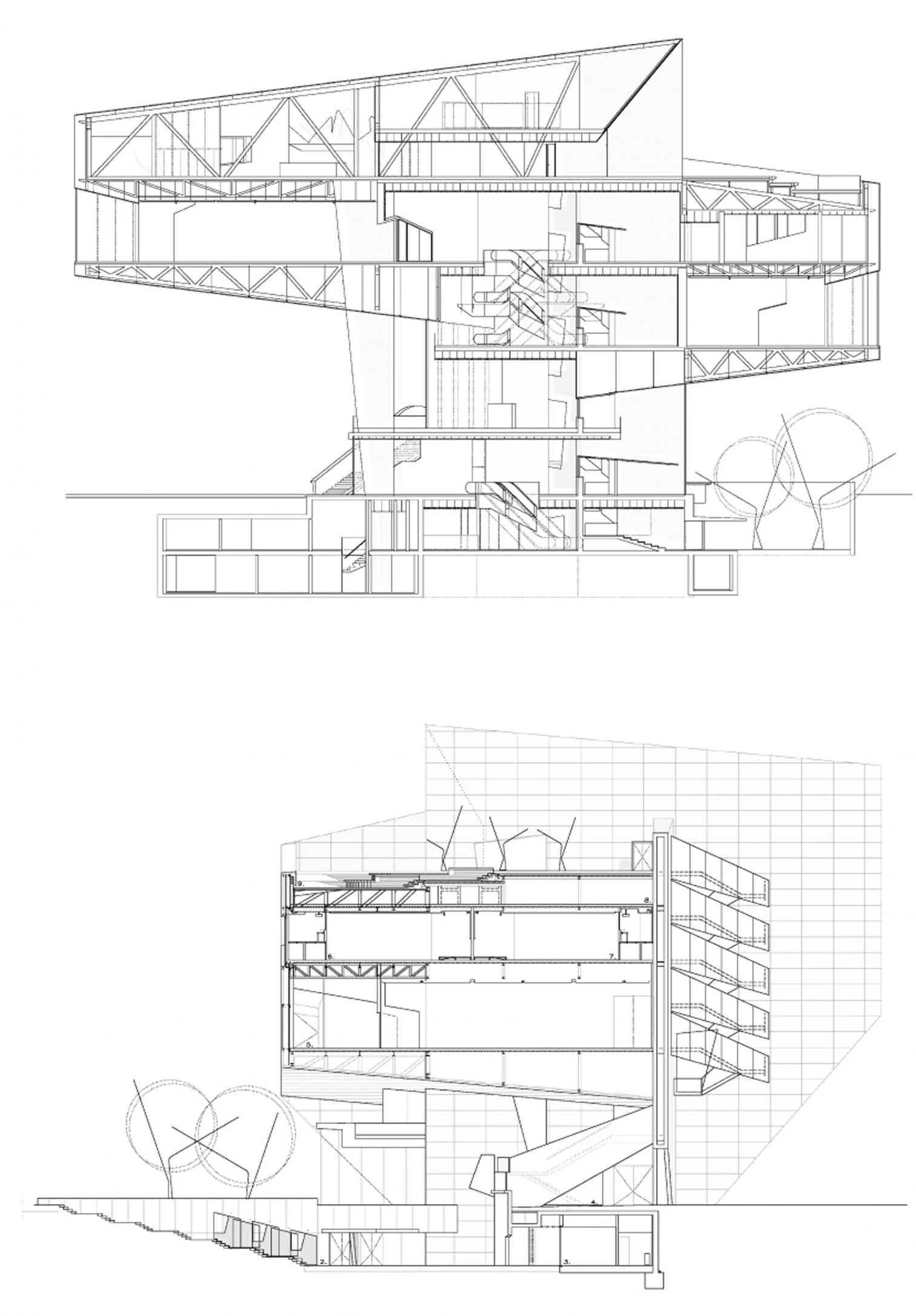 En respuesta a ese doble objetivo, el proyecto eleva las salas para liberar con ello la planta baja y situar allí las partes más abiertas y transparentes del programa; el lobby y la tienda. La intención es generar espacio público, hacer que el parque llegue a la ciudad pasando por debajo del edificio: un espacio que por la noche se ilumina mostrando dibujos conseguidos perforando la chapa, que esconde además la estructura que soporta las salas elevadas. Un jardín semienterrado se sitúa bajo la sala para dar evacuación al auditorio, pudiéndose entender también como antesala y zona de catering al aire libre. Así, el auditorio, situado en el subsuelo y accesible desde el lobby, se conecta directamente a la ciudad a través de este jardín. Las dos salas suspendidas se enfrentan a niveles diferentes, de forma que, al salir de una de ellas, la ciudad sea visible por debajo de la otra. Las conexiones entre salas se resuelven con escaleras mecánicas y recorridos que ofrecen vistas lejanas: zonas de transición que funcionan como espacios de relajación y de descompresión entre una exposición y la siguiente. En lo más alto del edificio y con vistas sobre la ciudad se sitúan la cafetería y el restaurante. En el lado contrario, por la diferencia de niveles entre salas, se genera una terraza bar que, en continuidad con el restaurante interior, ofrece vistas hacia el meandro de Ranillas y el recinto de la Expo.