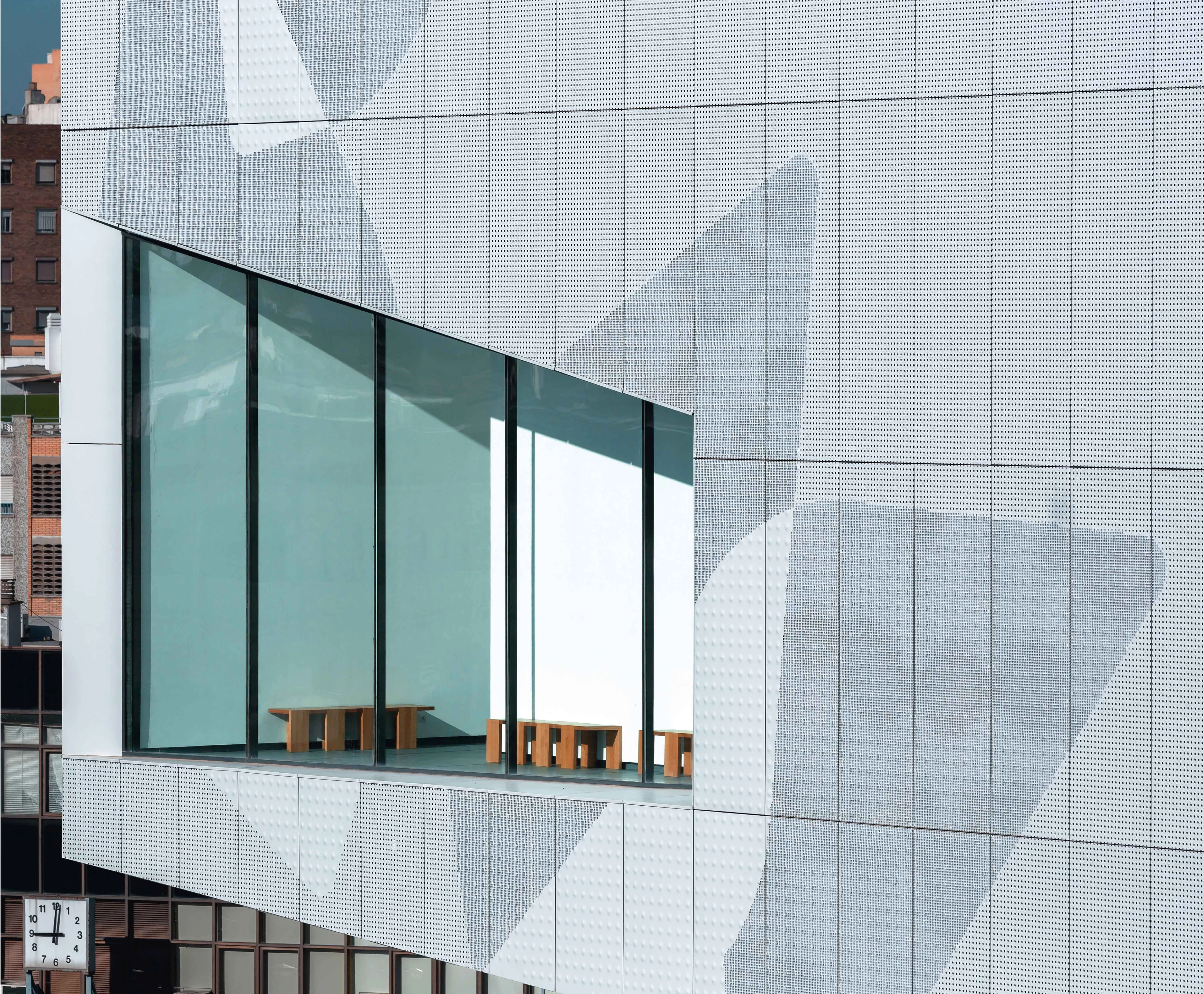 Los diferentes grados de embutición o perforación de las bandejas de aluminio que configuran la fachada confieren un aspecto cambiante al edificio: rotundo y macizo durante el día; translúcido y evanescente en la noche.
