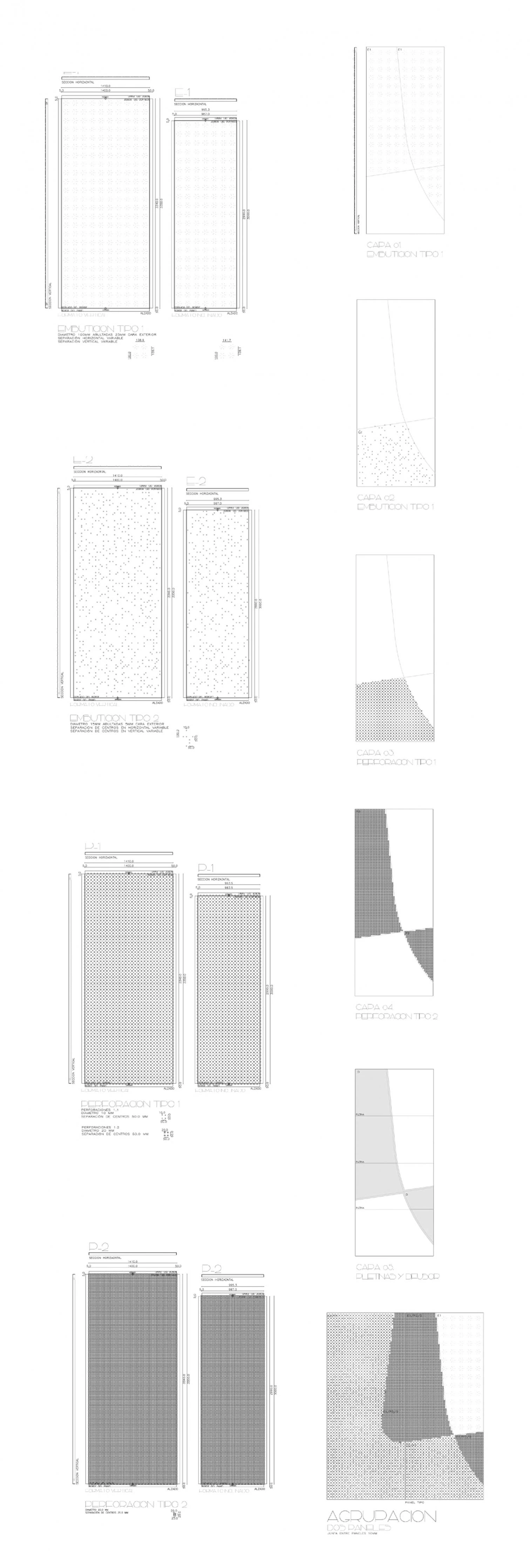 La fachada está formada por dos capas: la primera es una hoja aislante de paneles sándwich de 30 milímetros con aislamiento térmico incorporado, que se remata al interior con chapa de aluminio lacado; la segunda, separada de la anterior mediante una cámara transitable, está formada por piezas con diferentes patrones, combinados como en un puzle para definir la envolvente facetada del edificio. El dibujo final es resultado de cortar y ensamblar bandejas de aluminio plegado de 1.400 x 3.340 y 987 x 2.990 milímetros y 3 milímetros de espesor. Las bandejas se organizan en cuatro familias según su acabado y de los diferentes dibujos y grados de perforación. De este modo, si durante el día el edificio se manifiesta como una pieza opaca, durante la noche brilla como si fuese un fanal de luz.